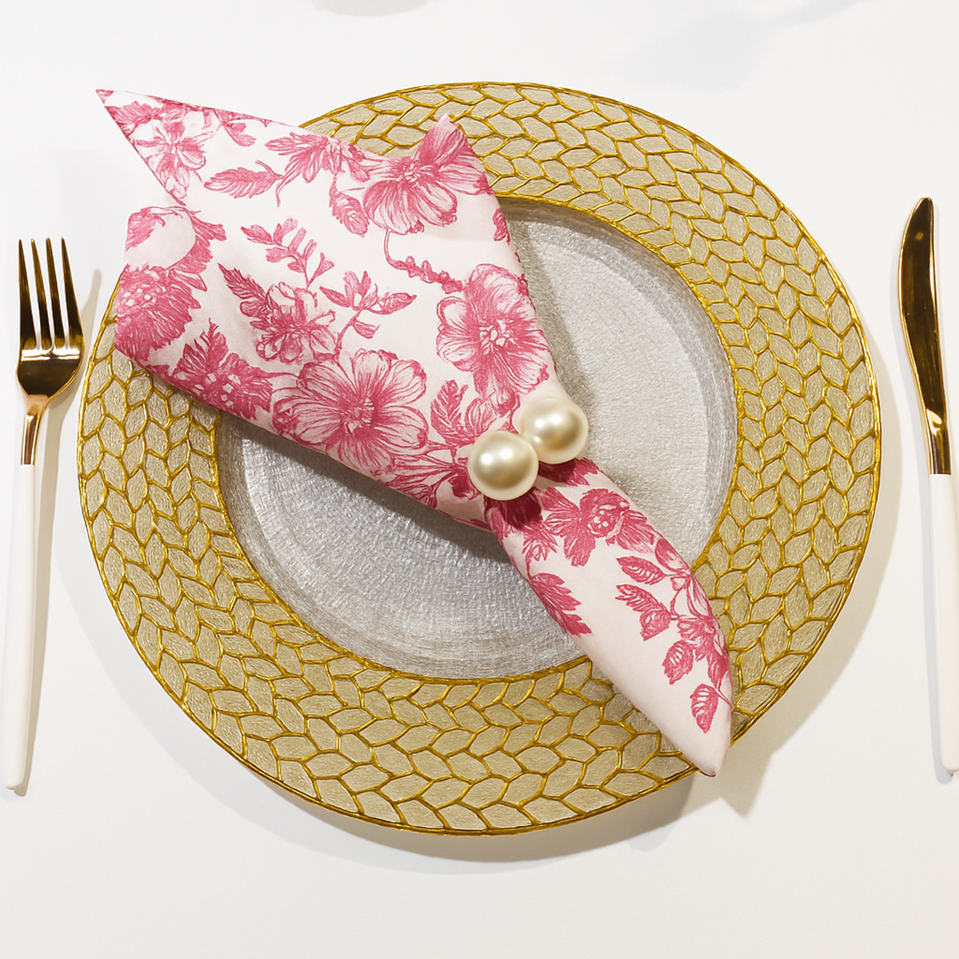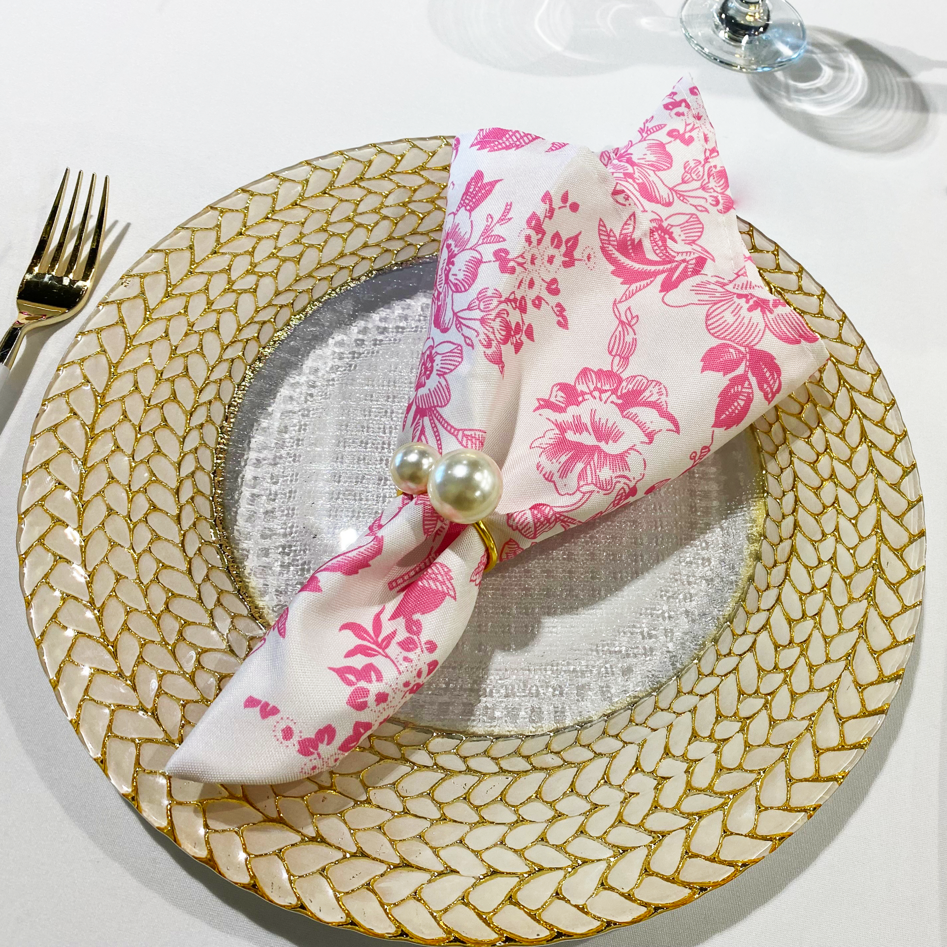 If you’re eyeing more guests than usual, it’s recommended you buy in bulk stretch spandex tablecloths to maintain that tight look of your whole setup without the usual dangling cloth that can be distracting. This way, especially, when your tablecloth is in a lighter color, your pink and white toile paper napkins can work their way to becoming the center of attention for your wedding dinner table.