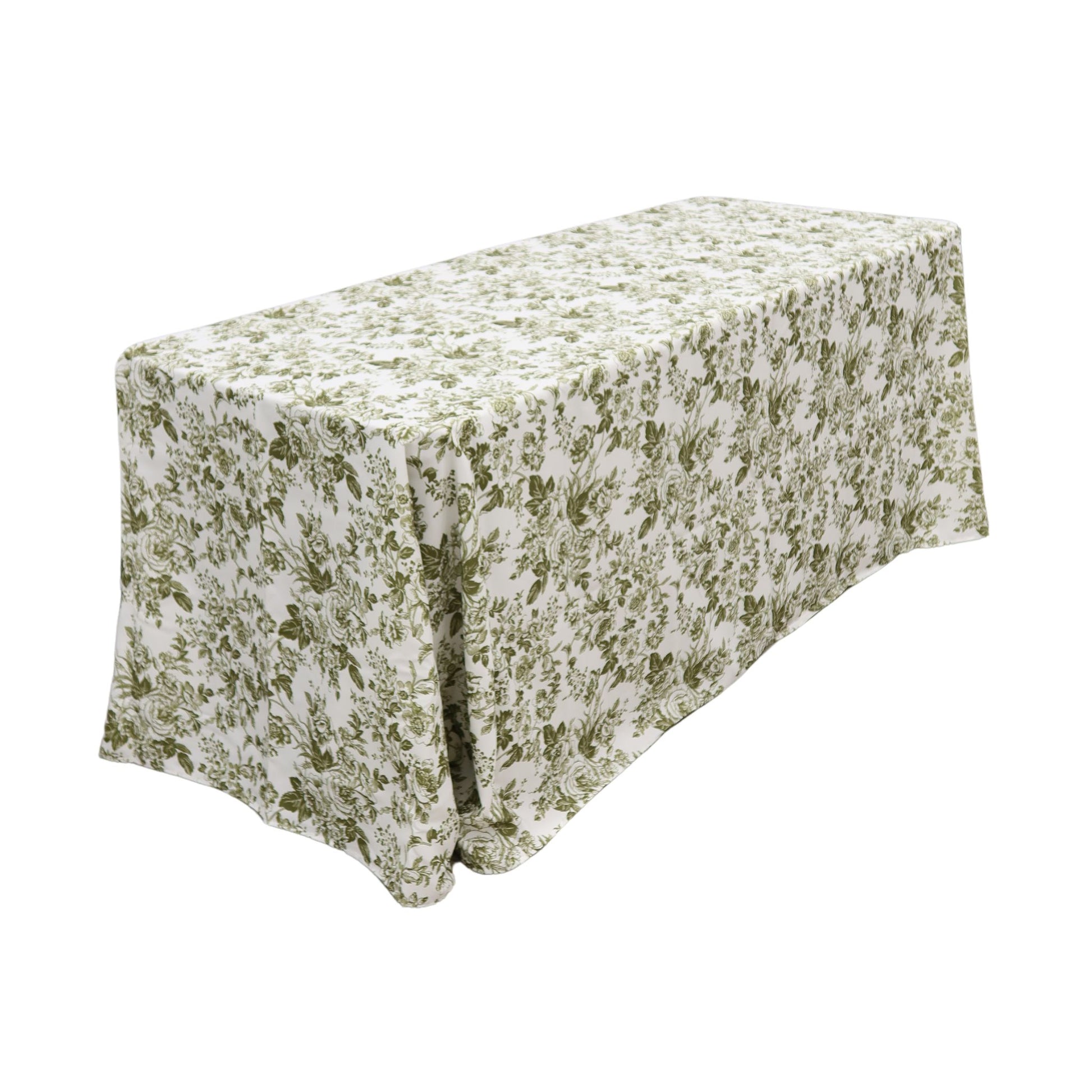 Bring a touch of timeless beauty to your occasion with the 90"x132" Olive Green French Toile Rectangular Tablecloth. Inspired by the classic toile de Jouy pattern, this table cover boasts intricate pastoral scenery and delicate floral motifs that infuse your tablescape with a vintage charm.