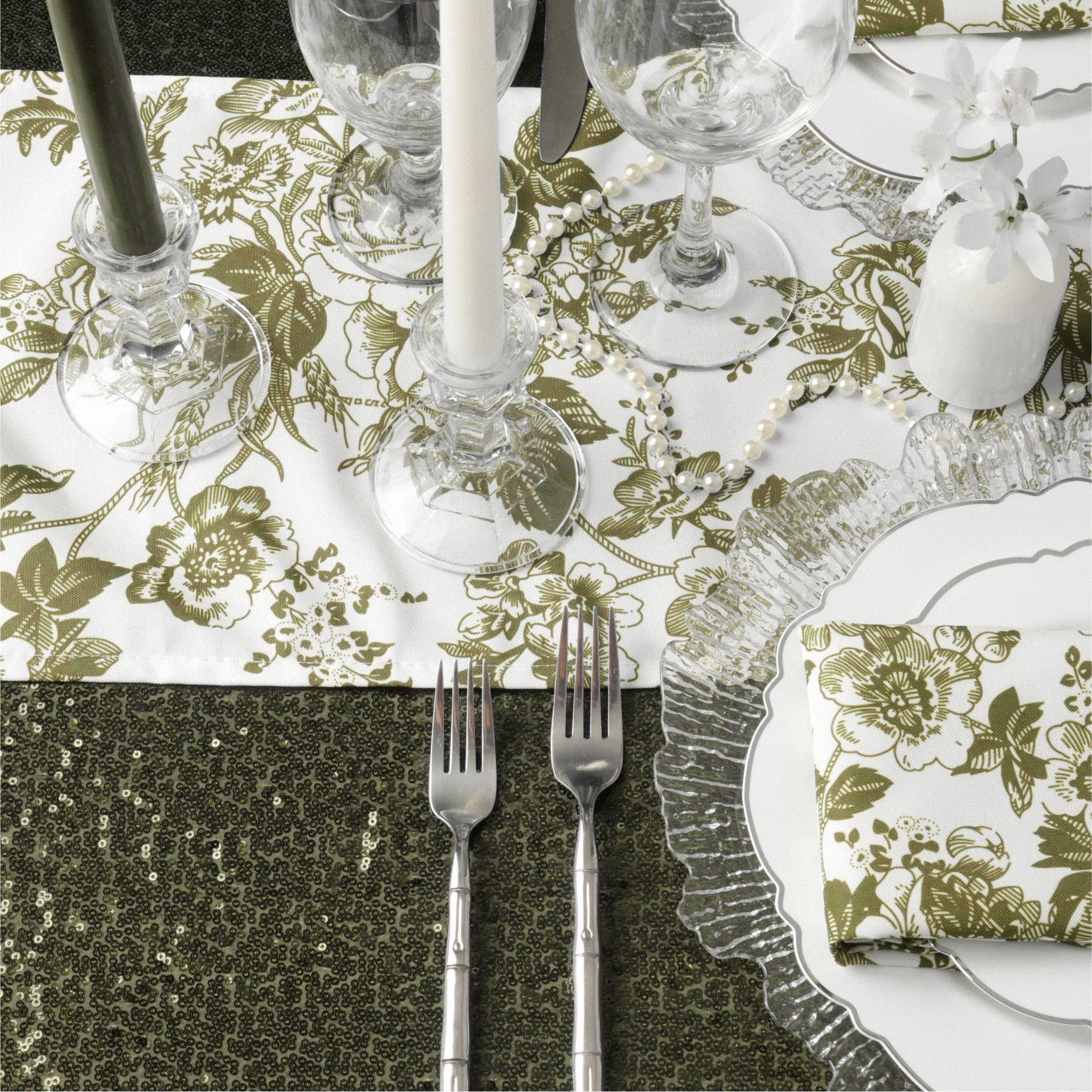 We promise that our olive green toile table runners are carefully crafted to meet our standards of elegance and durability. We take pride in offering high-quality party linens and supplies that enhance your home or event decor.