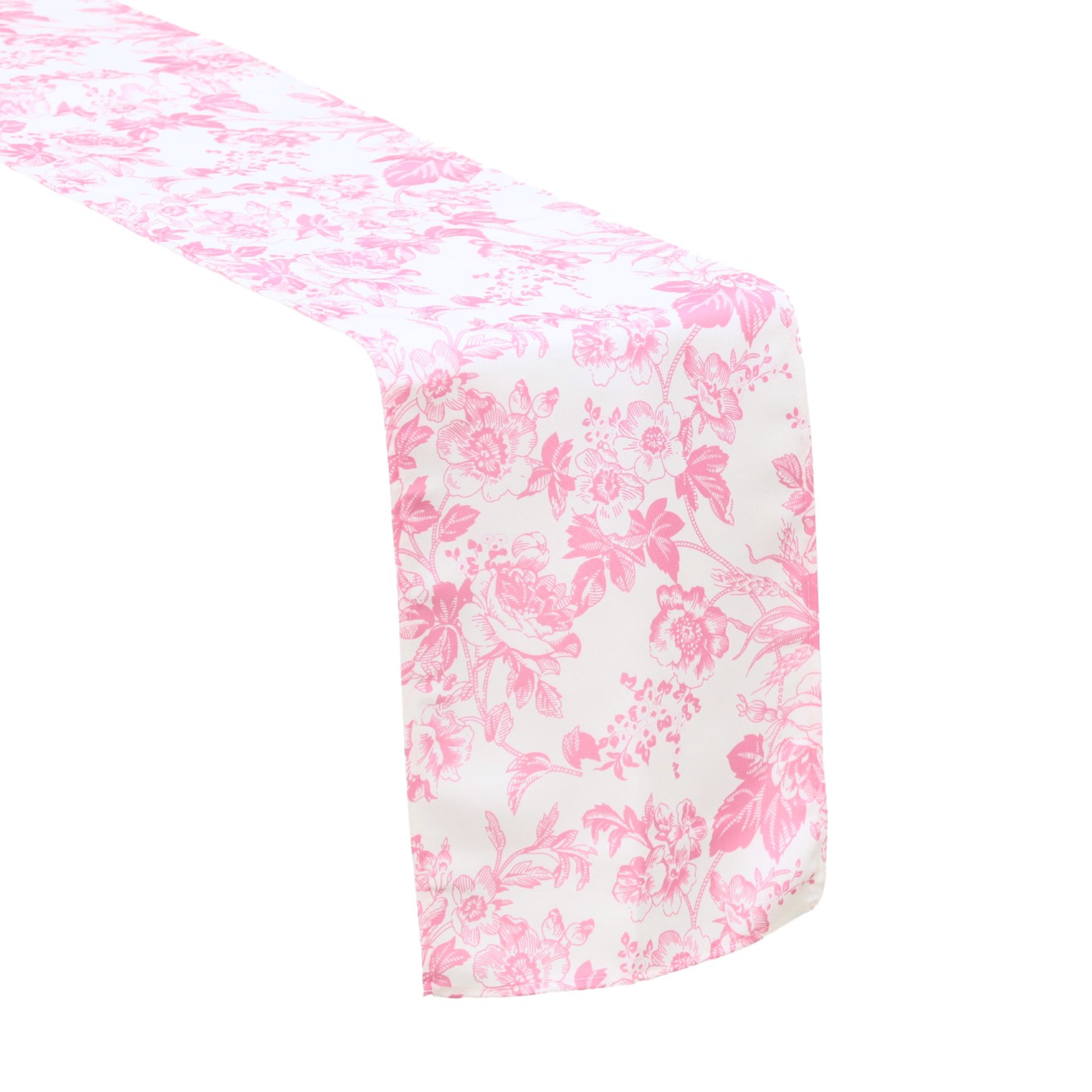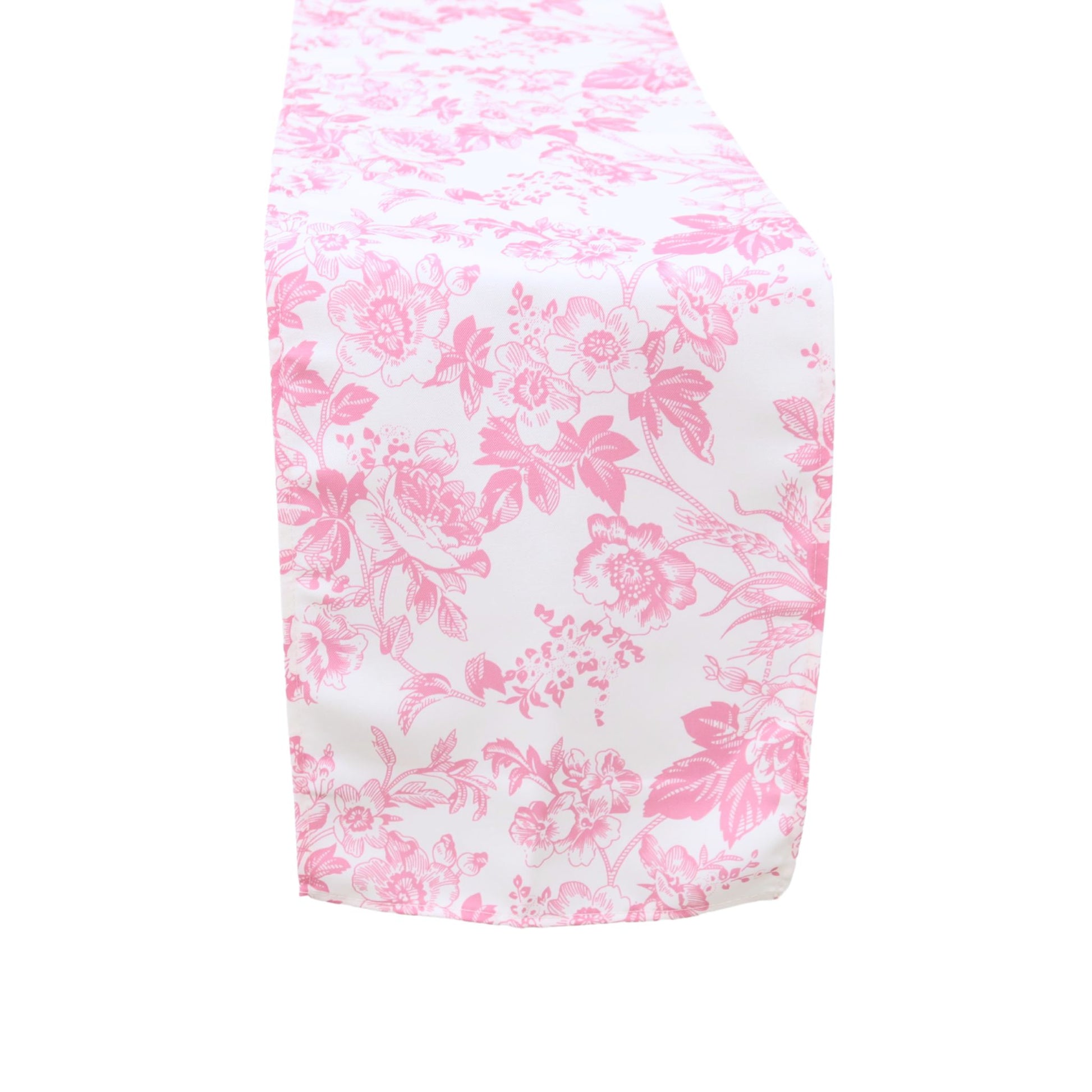 This runner comes in a soft pink French toile fabric pattern, with delicate floral and scenic illustrations printed in detail across the fabric. The timeless design adds a vintage aesthetic that pairs well with a variety of themes from garden parties to elegant weddings. Its gentle pink tones make it an excellent choice for springtime or romantic events.