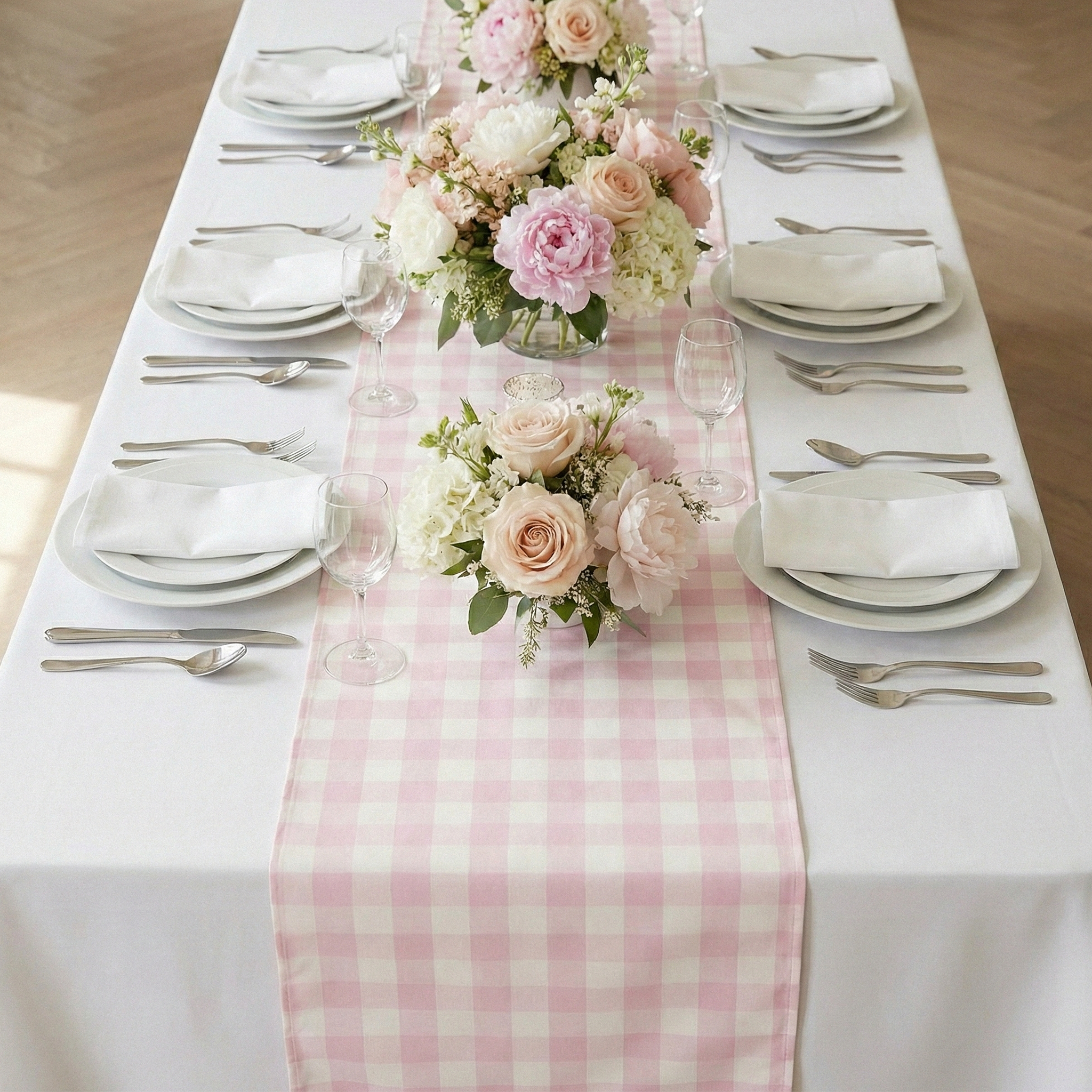 Styling with gingham runners instantly elevates your tables with a cozy, laid-back charm. Pair them with neutral linens for a soft, rustic look or contrast them with bold colors to make the checkered pattern stand out.