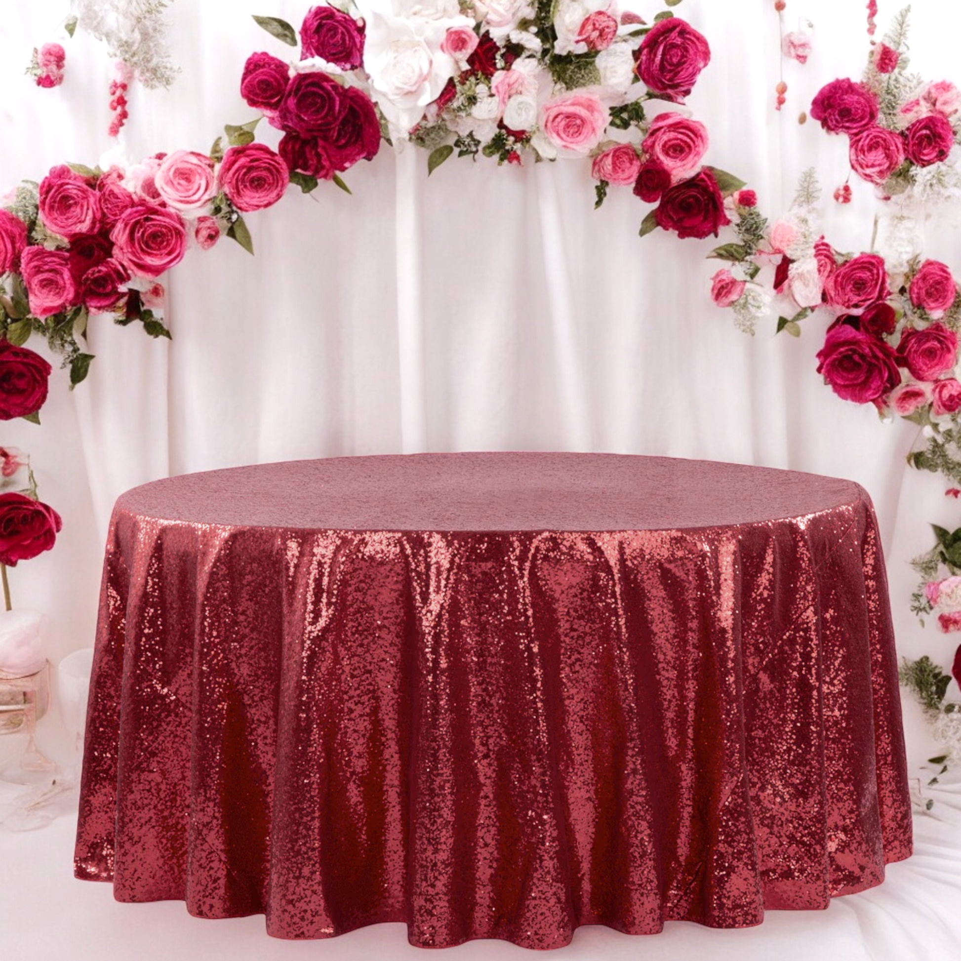 Our round sequin tablecloths are made of fine metallic burgundy sequins sewn securely onto a durable taffeta base. Get an instant touch of sophistication with the soft sheen of burgundy sequins that play with party lights. Use your tablecloths repeatedly with the sturdy material of taffeta fabric.