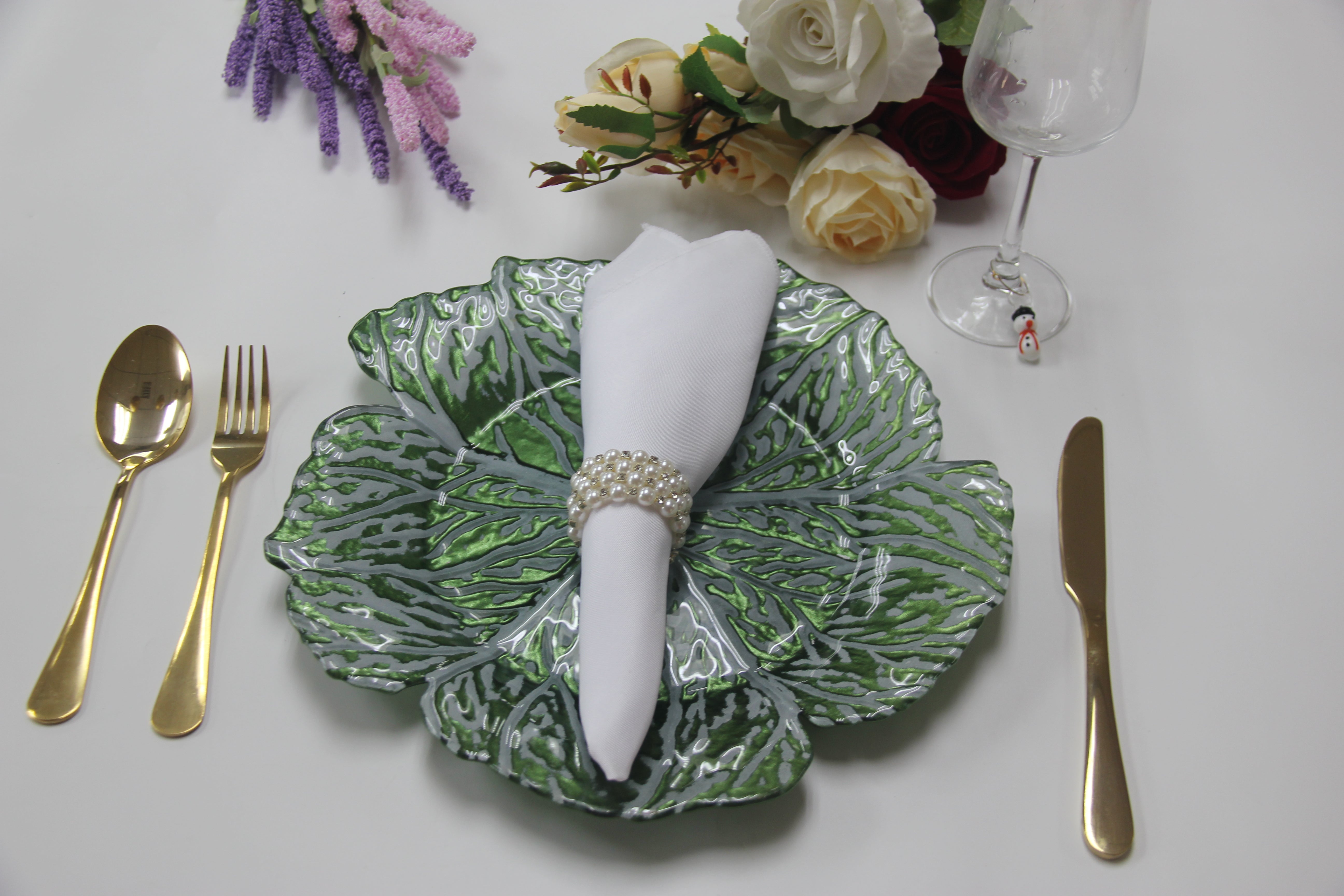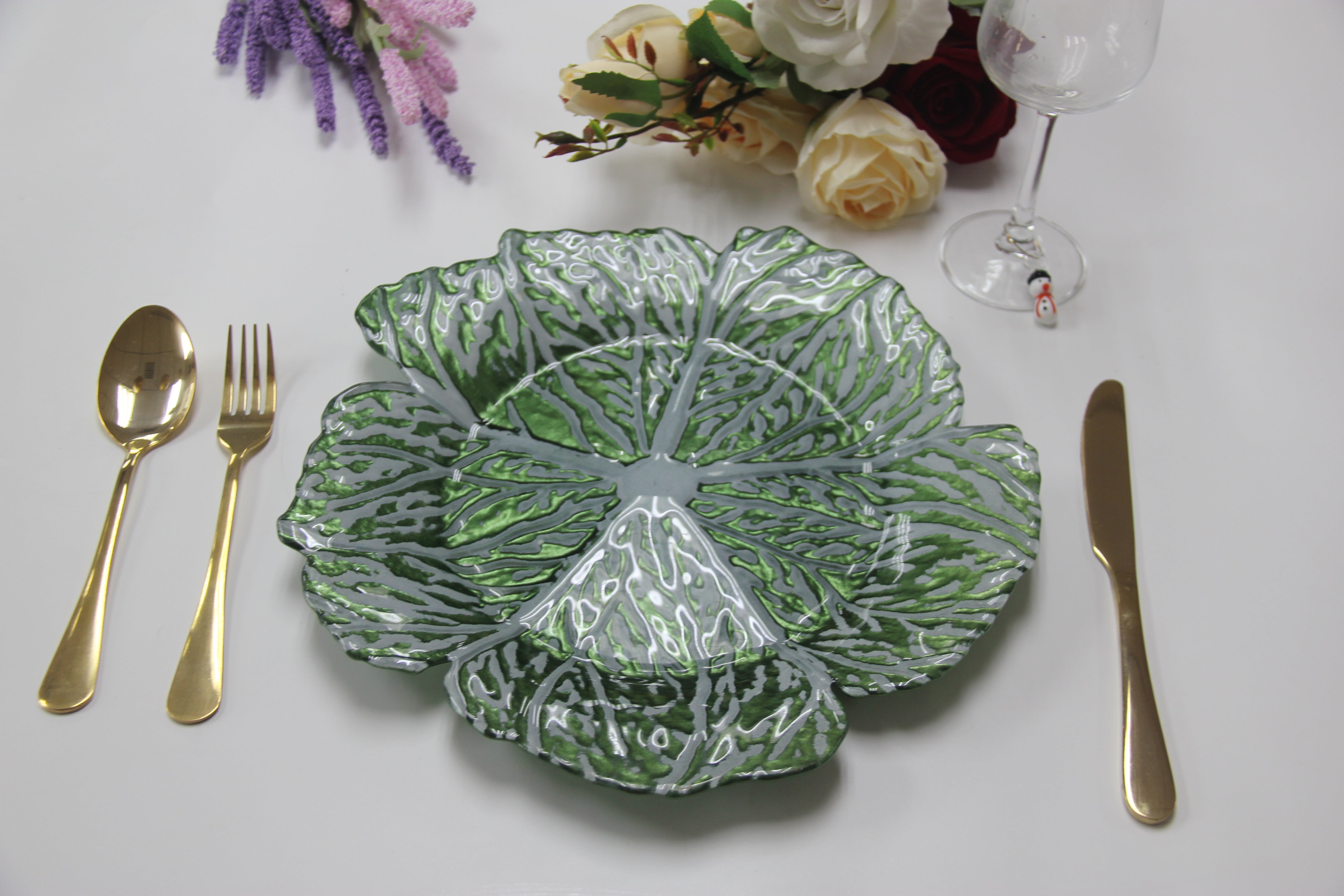 Crafted from durable green-tinted glass, each plate mimics the soft ruffles and veining of real cabbage leaves, making it a stunning decorative accent that blends rustic whimsy with elegant presentation. Whether you're an event stylist or DIY enthusiast, these cabbage glass charger plates are sure to wow your guests.