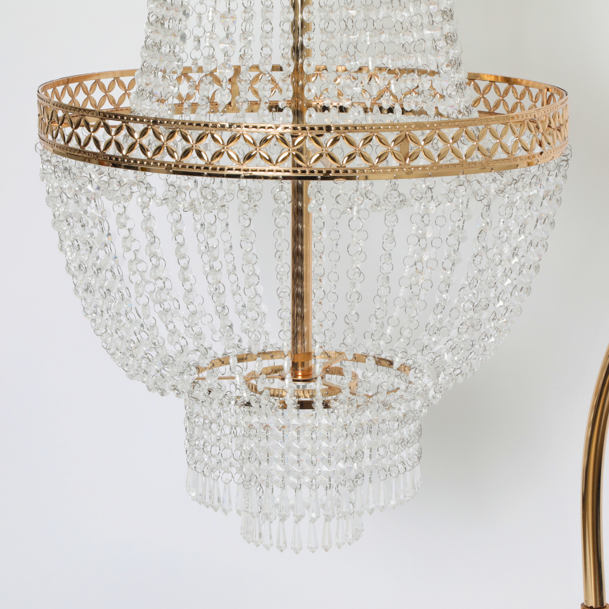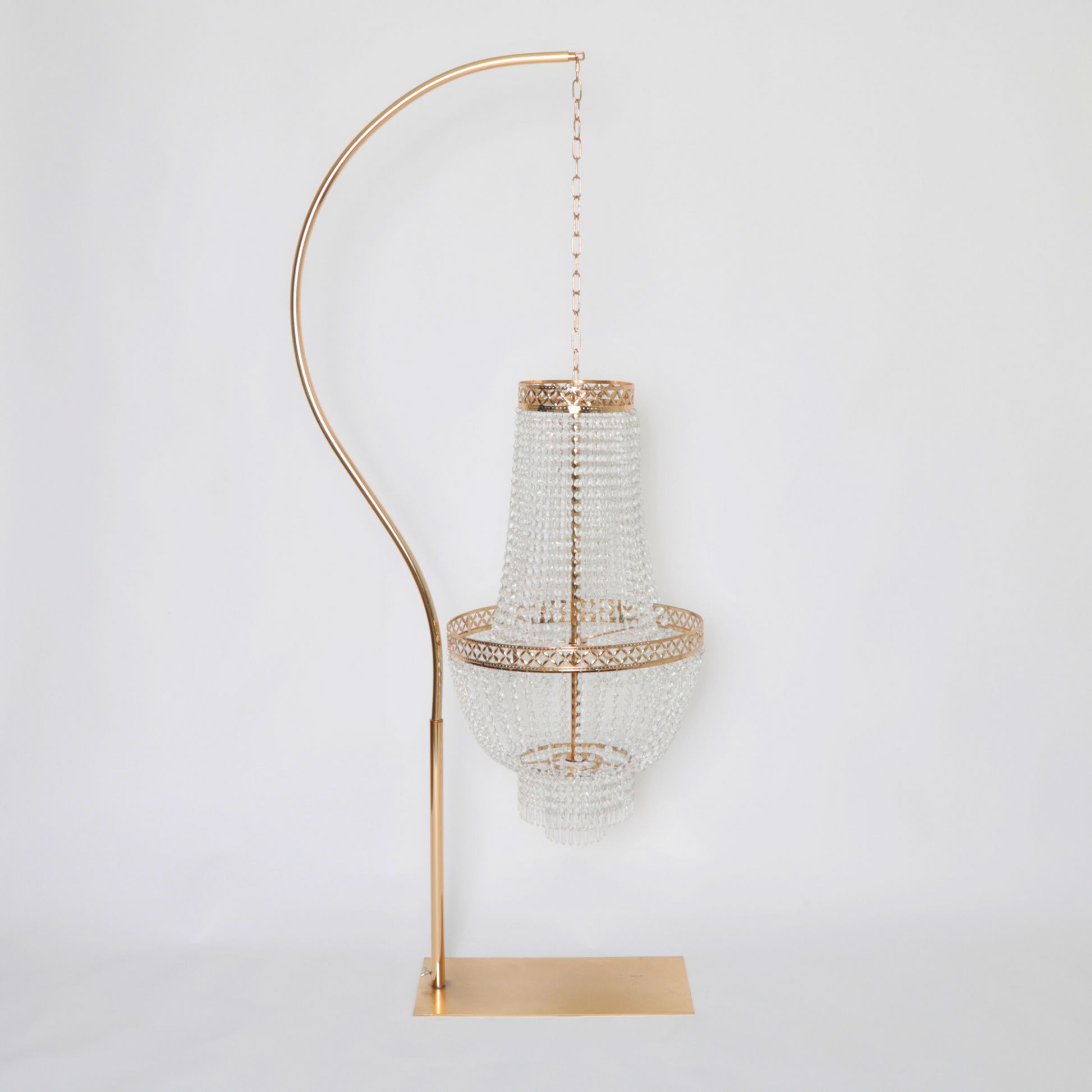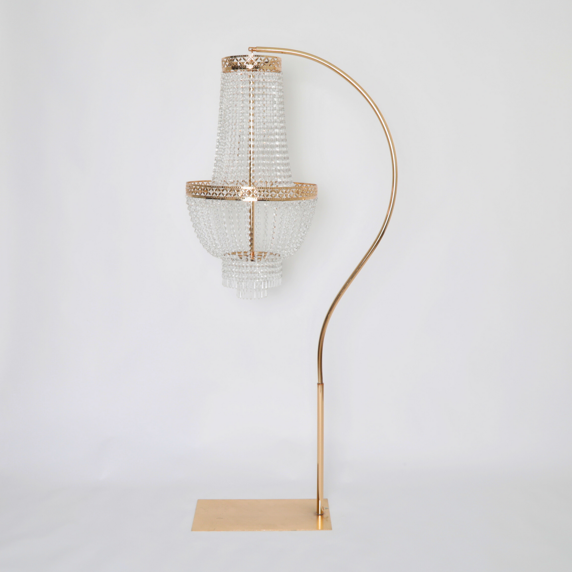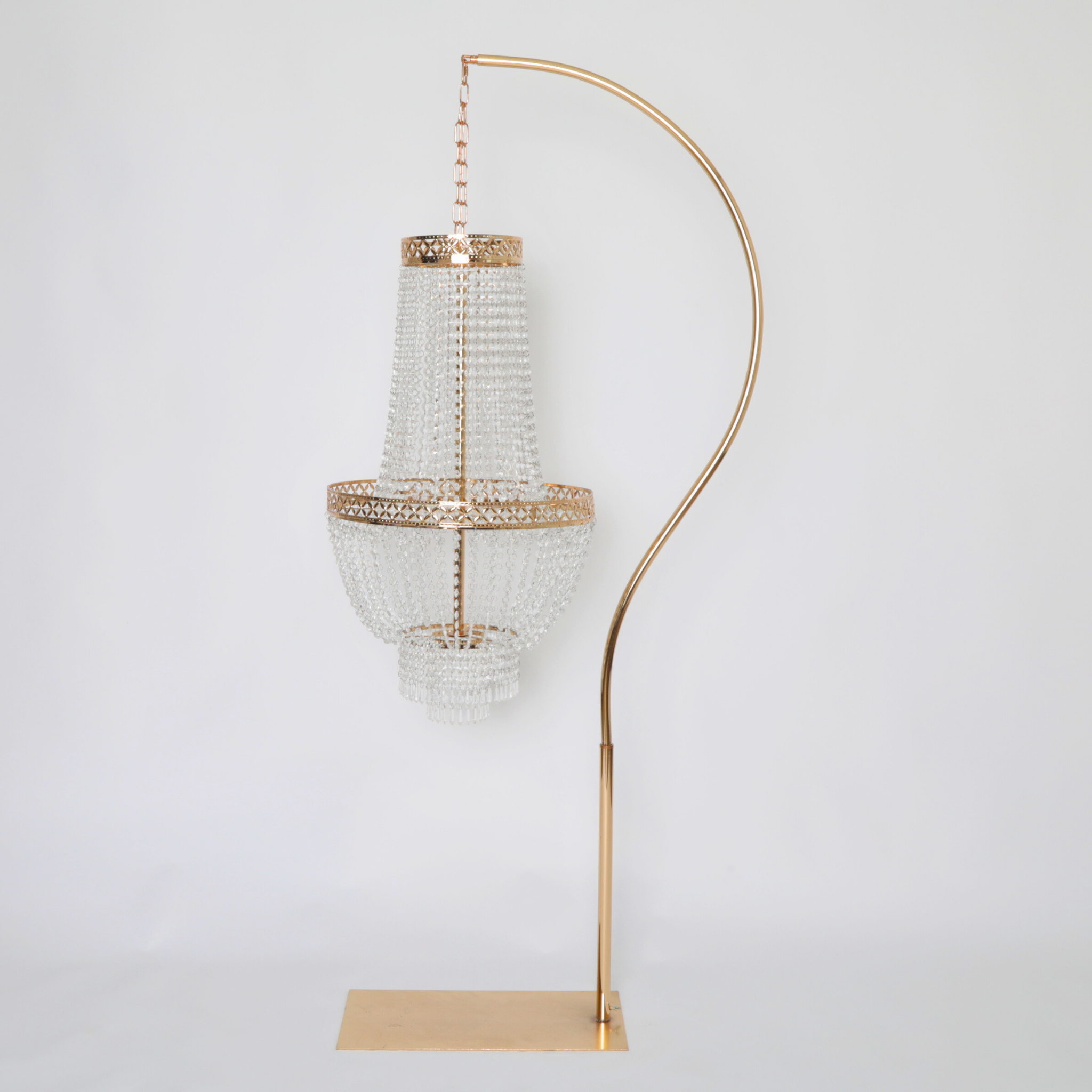 Hanging chandeliers on a stand provides flexibility that traditional chandeliers do not have. The latter needs ceiling suspension, which may not be available in some event spaces. On the other hand, a chandelier stand can be used anywhere in the venue, with or without a ceiling. You can use it to decorate outdoor events, spaces that do not allow hanging fixtures or venues with low ceilings.