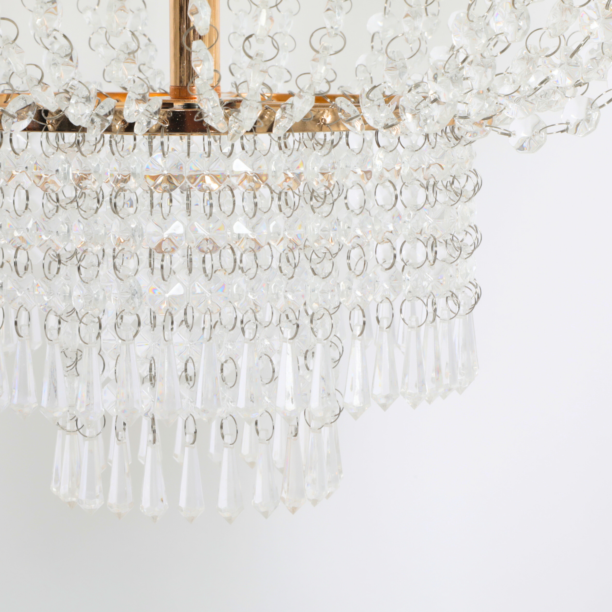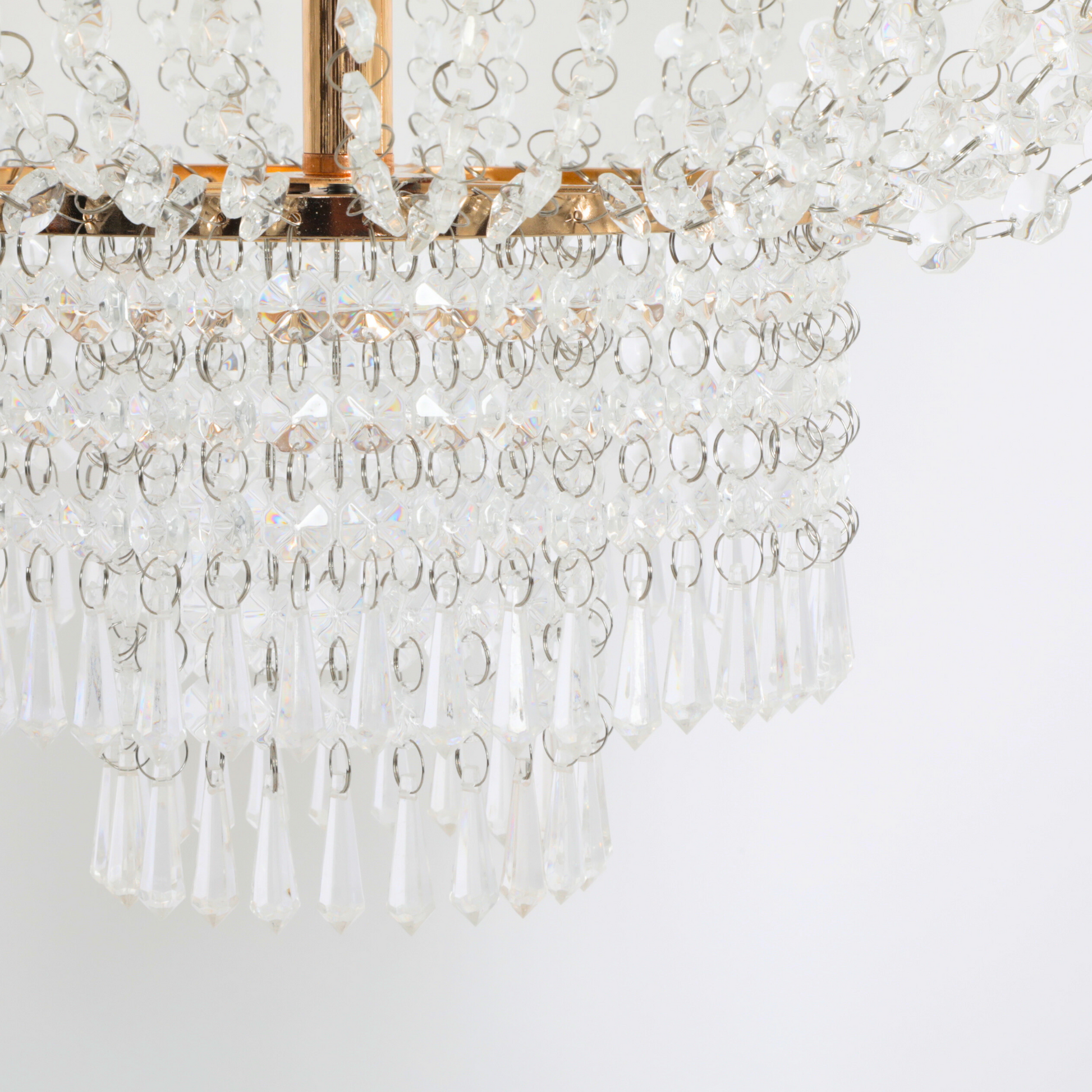 Its head is made of tiny crystals running from top to bottom. When light strikes through the decoration, it will reflect on the crystals, making the chandelier look dazzling.