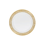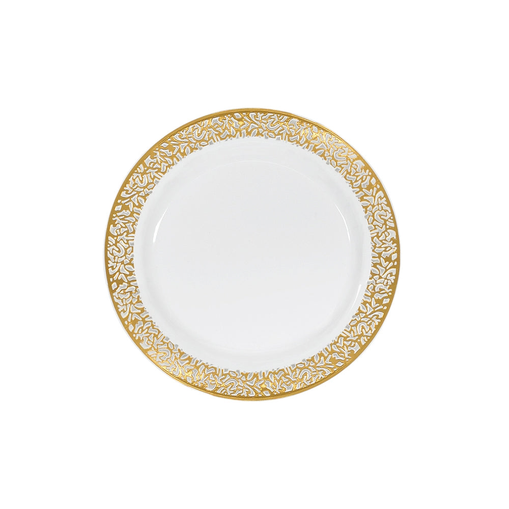 Our Small Lace Plastic Plates feature a cut-out gold trim design that mimics the beauty of natural lace. At 7.5" wide they're the perfect fancy, formal fit for appetizers, desserts, and salads. To enhance the look of your overall tablescape our Small Lace Plastic Plates pair well with our wholesale glass and acrylic charger plates. Our Small Lace Plastic Plates are easy to clean up and transport, making your event a breeze to set up.