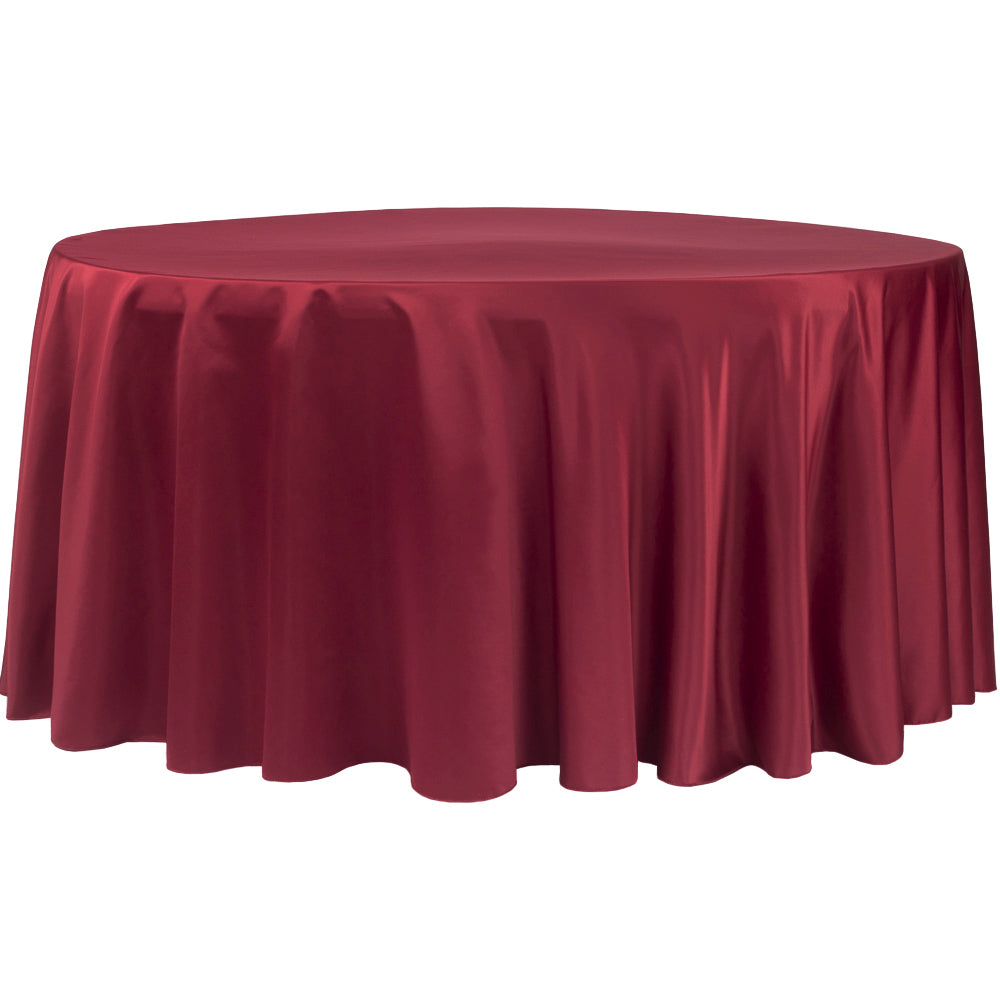 Our 120" Round Apple Red Lamour Satin Tablecloth fits tables up to 60" in diameter for a full-length drape that reaches the floor for a polished look. Match it with other event must-haves such as table runners, overlays, chair covers, and drapes.
