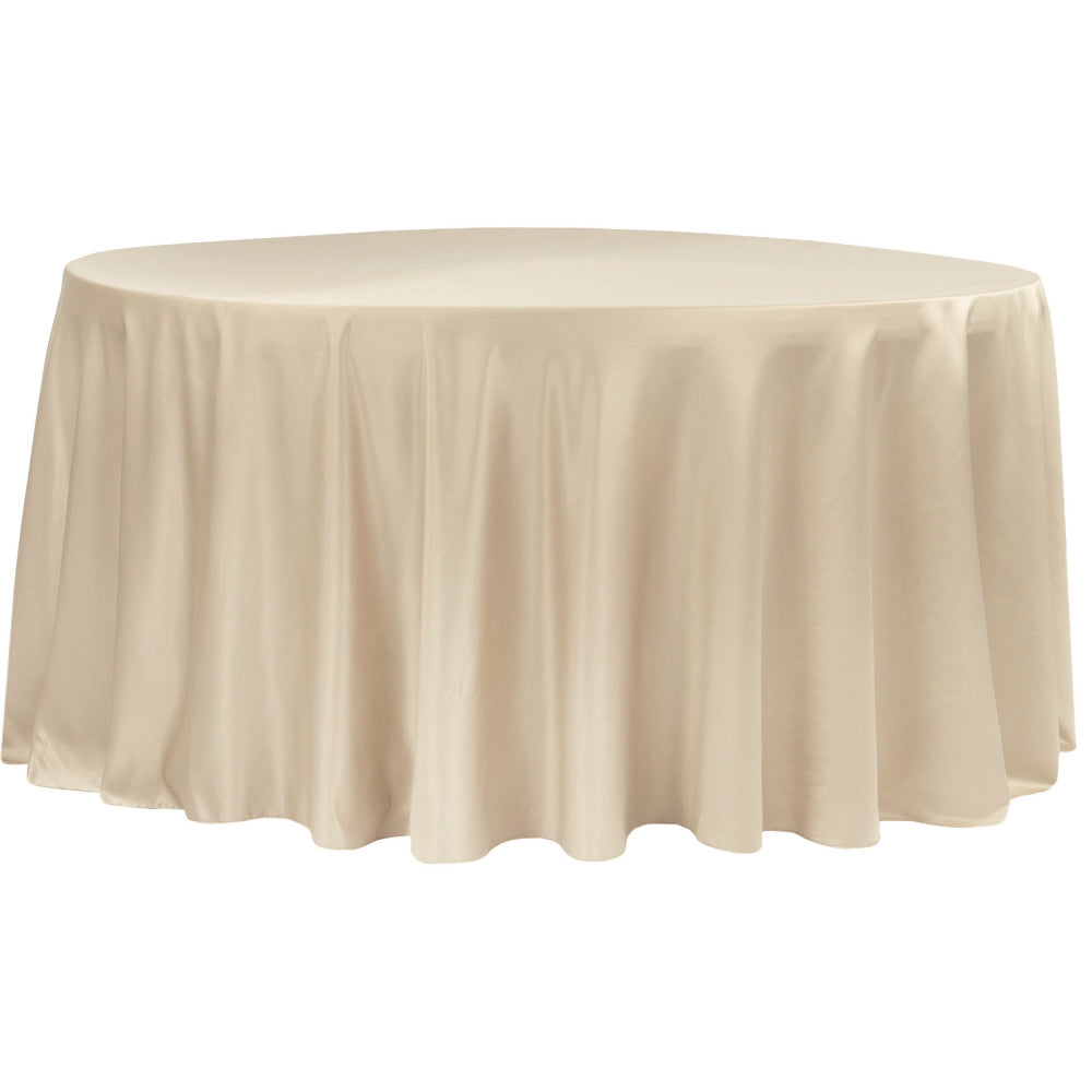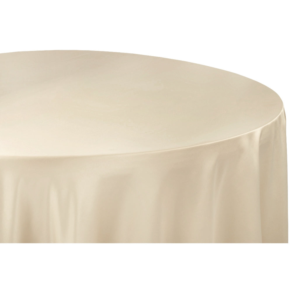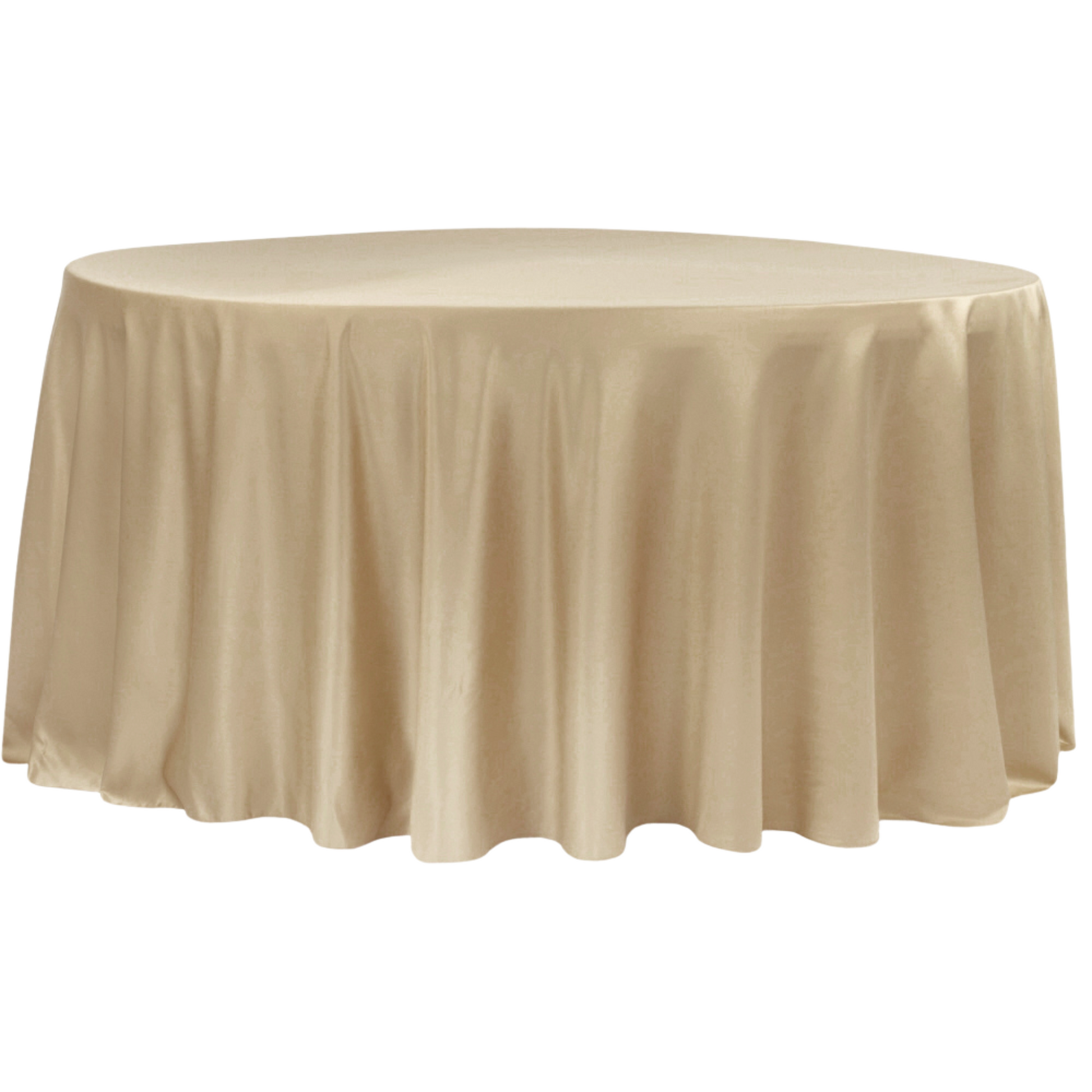 Our 120" Round Champagne Lamour Satin Tablecloth fits tables up to 60" in diameter for a full-length drape that reaches the floor for a polished look. Match it with other event must-haves such as table runners, overlays, chair covers, and drapes.