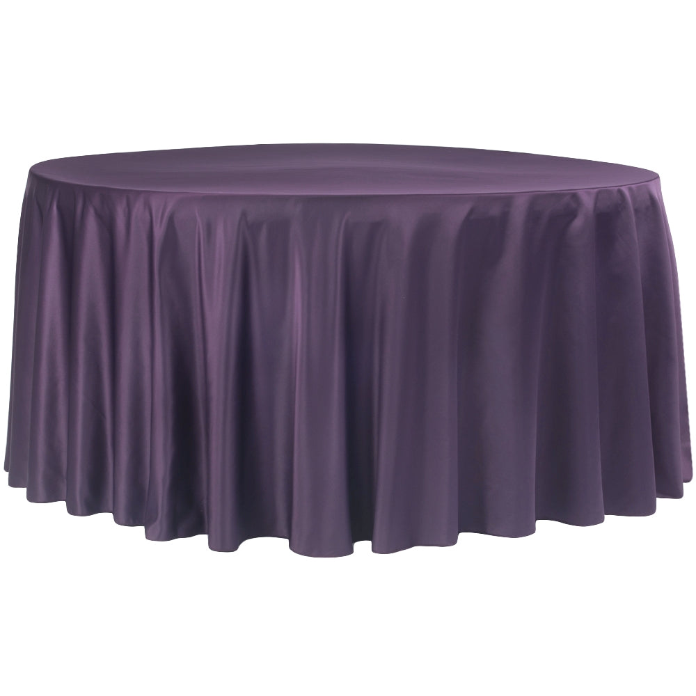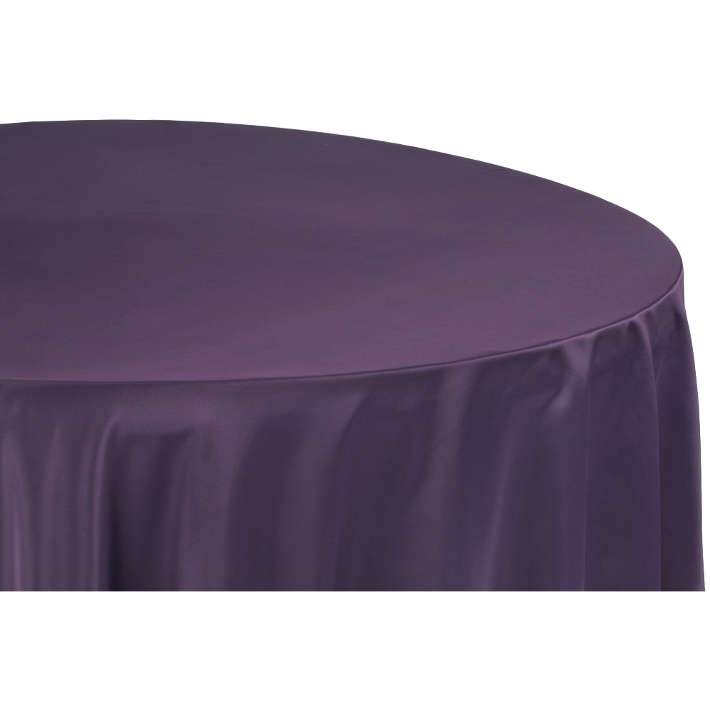 Our Eggplant/Plum Lamour Satin 132” Round Tablecloth