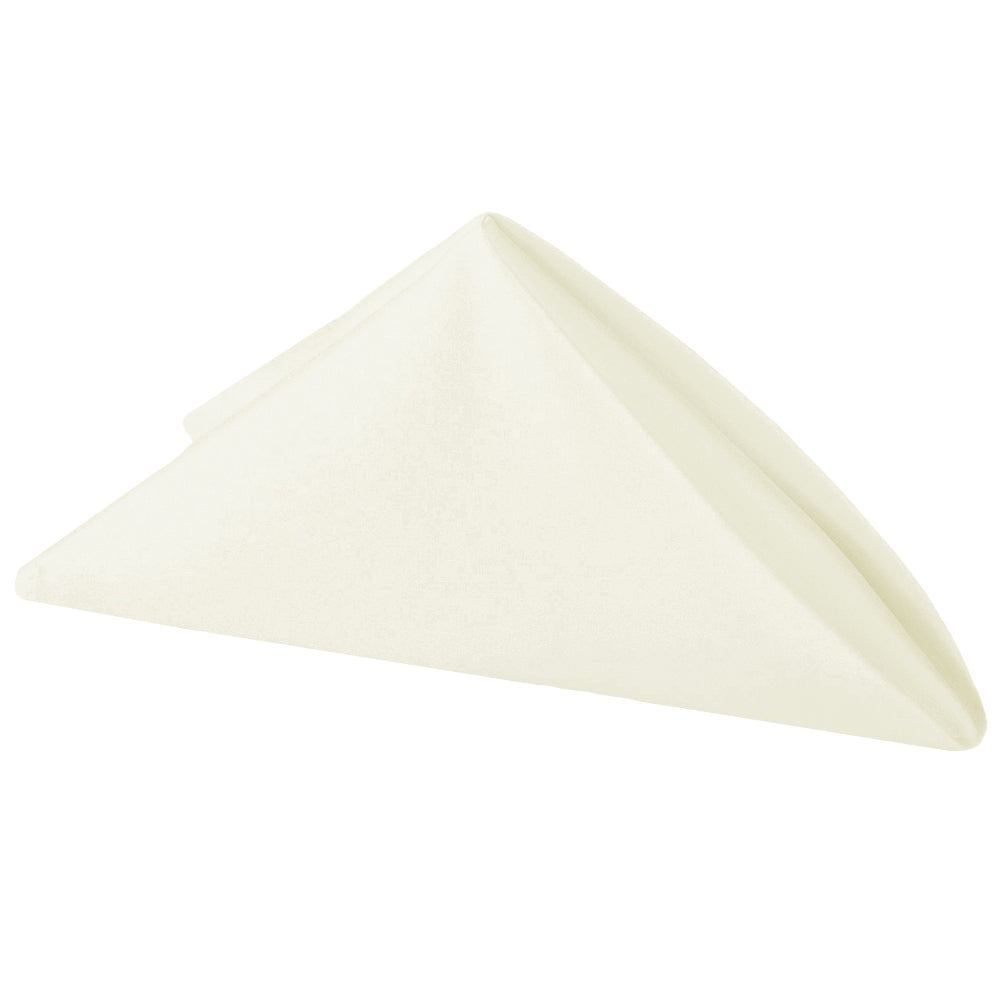 Each napkin is neatly hemmed for a neat, finished edge and comes in a generous 20" x 20" to provide ample space for creative napkin folds. These ivory Lamour napkins complement other event decor elements like stretch chair covers, chair sashes, and even floral backdrop walls. They're a simple way to create an upscale ambiance with minimal effort.