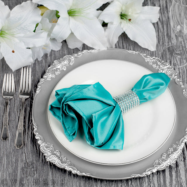 Complete your stylish tablescape with our turquoise Lamour satin napkins. Add them to your cart now and give your event the sophisticated touch it deserves. These smooth napkins are stunning, practical, and long-lasting, and fit beautifully into any event where style matters.