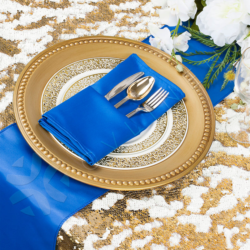 Bring to your tablescape a warm, shiny look with the royal blue runners as the focal point. Its soft sheen offers the perfect foundation for both minimalist and bold event themes. Pair it with white or silver tablecloths for a timeless monochromatic look. The neutral tones of this runner are suitable for weddings or formal dinners.