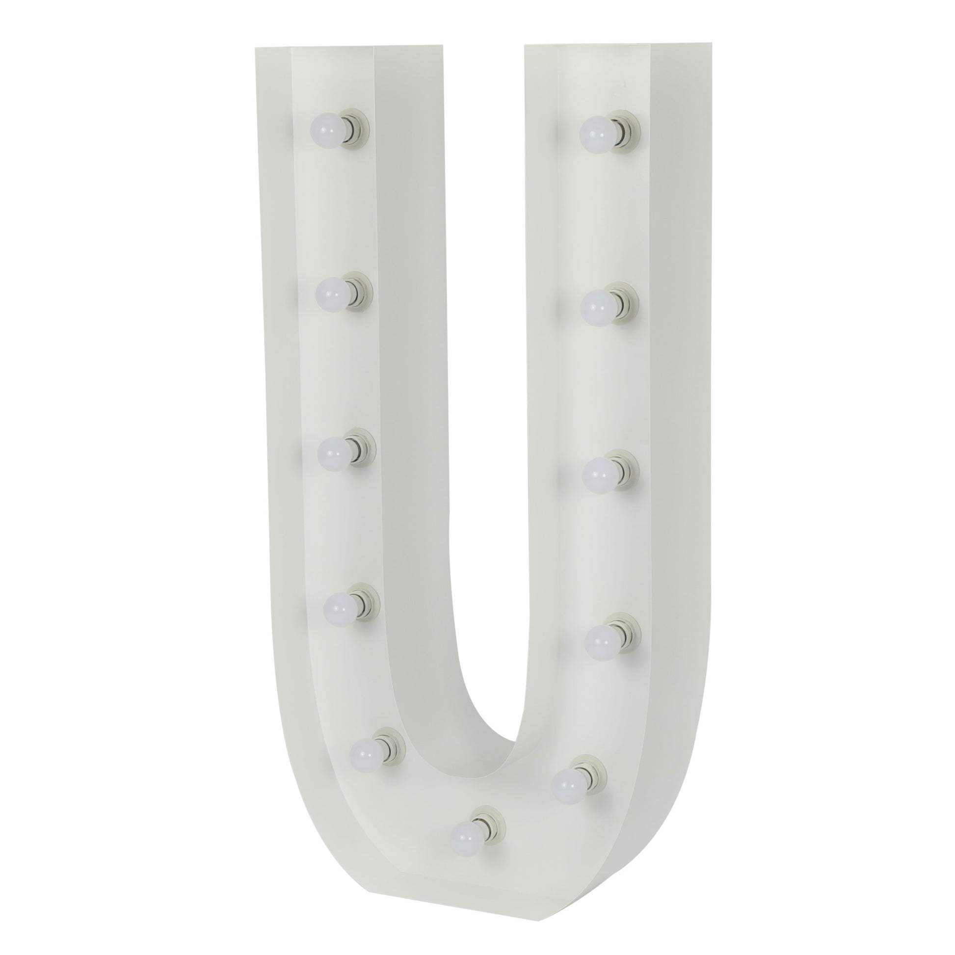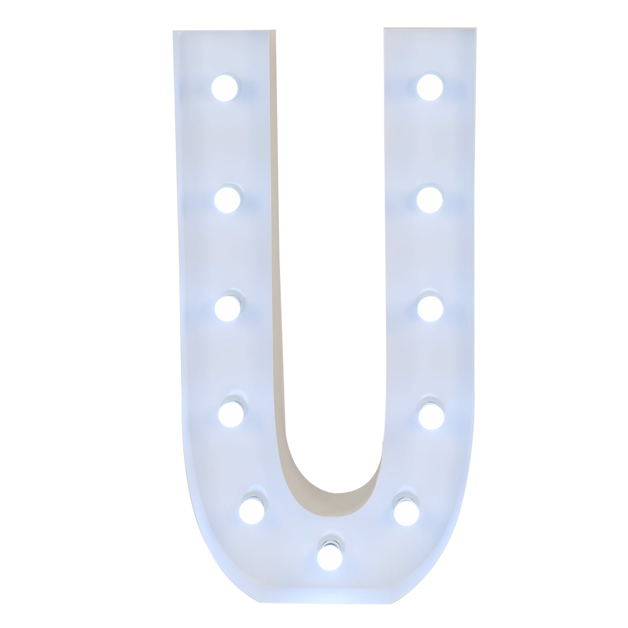 Make every occasion an unforgettable moment with our Large 4ft Tall LED Marquee Letter - U! Crafted of white galvanized metal, this freestanding marquee letter will light up any event space. Get creative and choose from any combination of marquee letters, numbers, or symbols for your own custom party message. The bright LED bulbs will illuminate your messages and create a warm or radiant atmosphere.