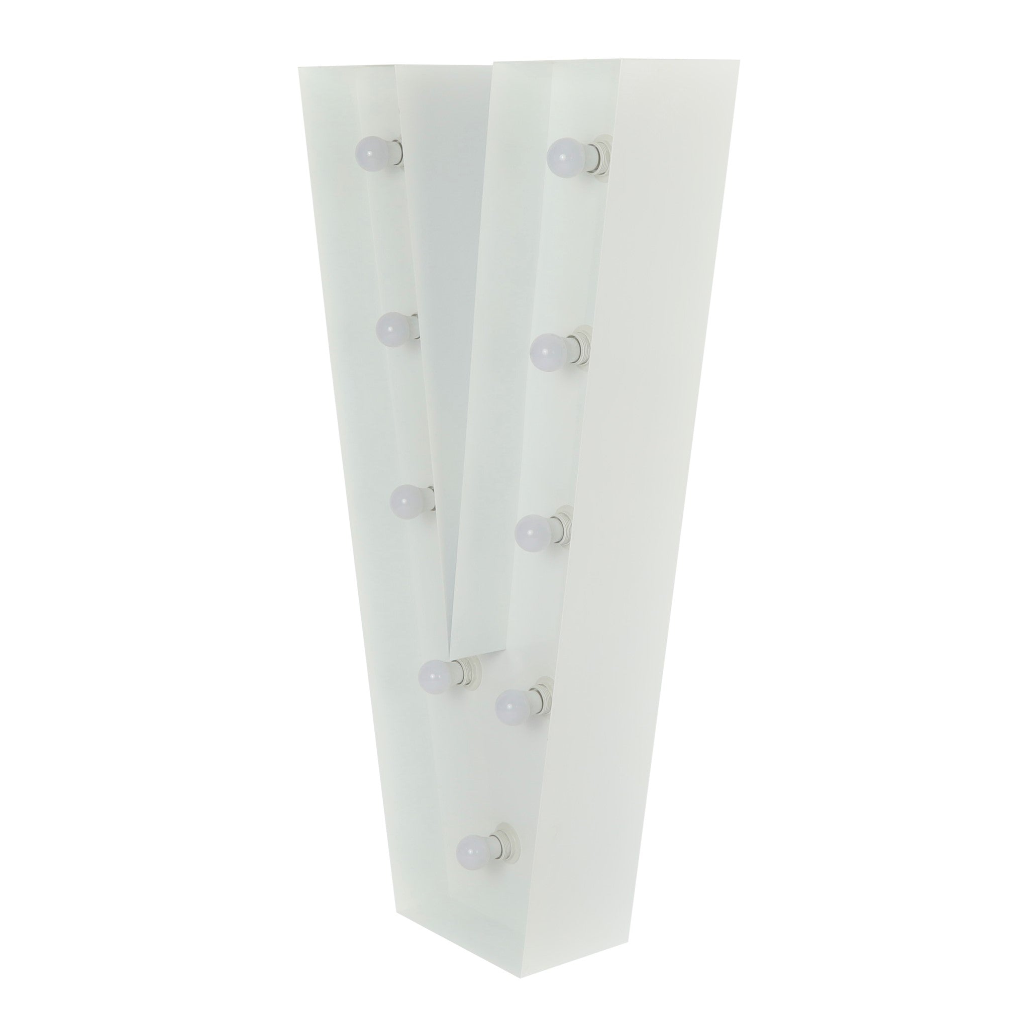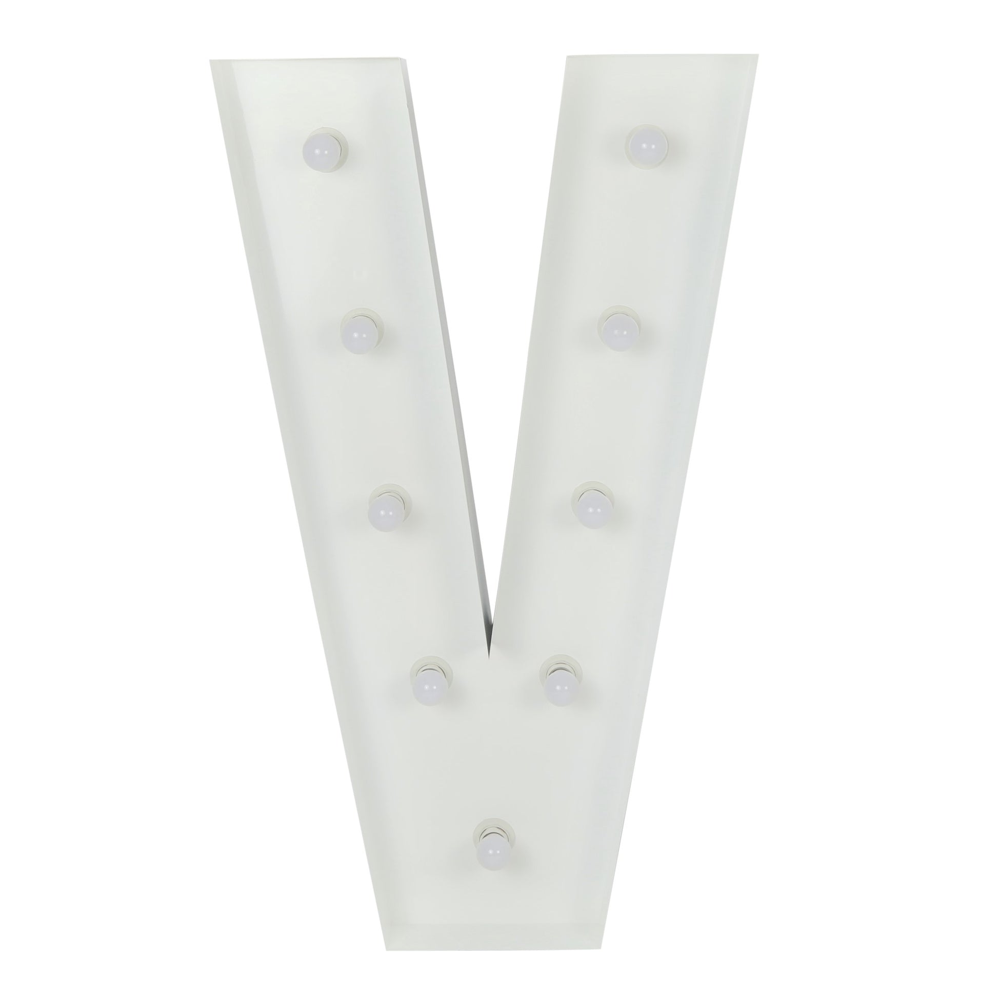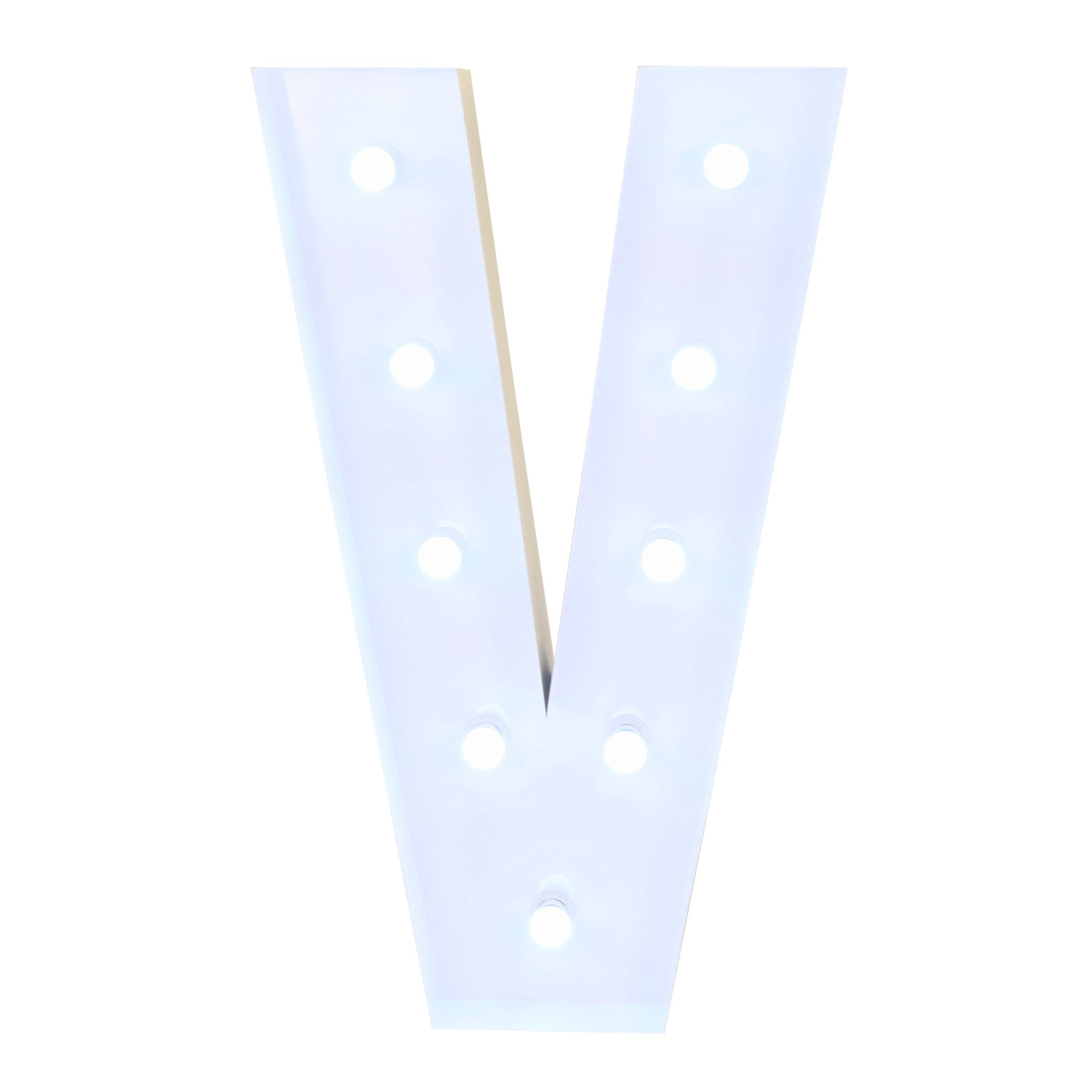 Crafted of white galvanized metal, this freestanding V marquee letter will light up any event space. Choose from any combination of marquee letters, numbers, or symbols and create a custom party message. The bright LED bulbs will illuminate the messages and create a warm or radiant atmosphere.