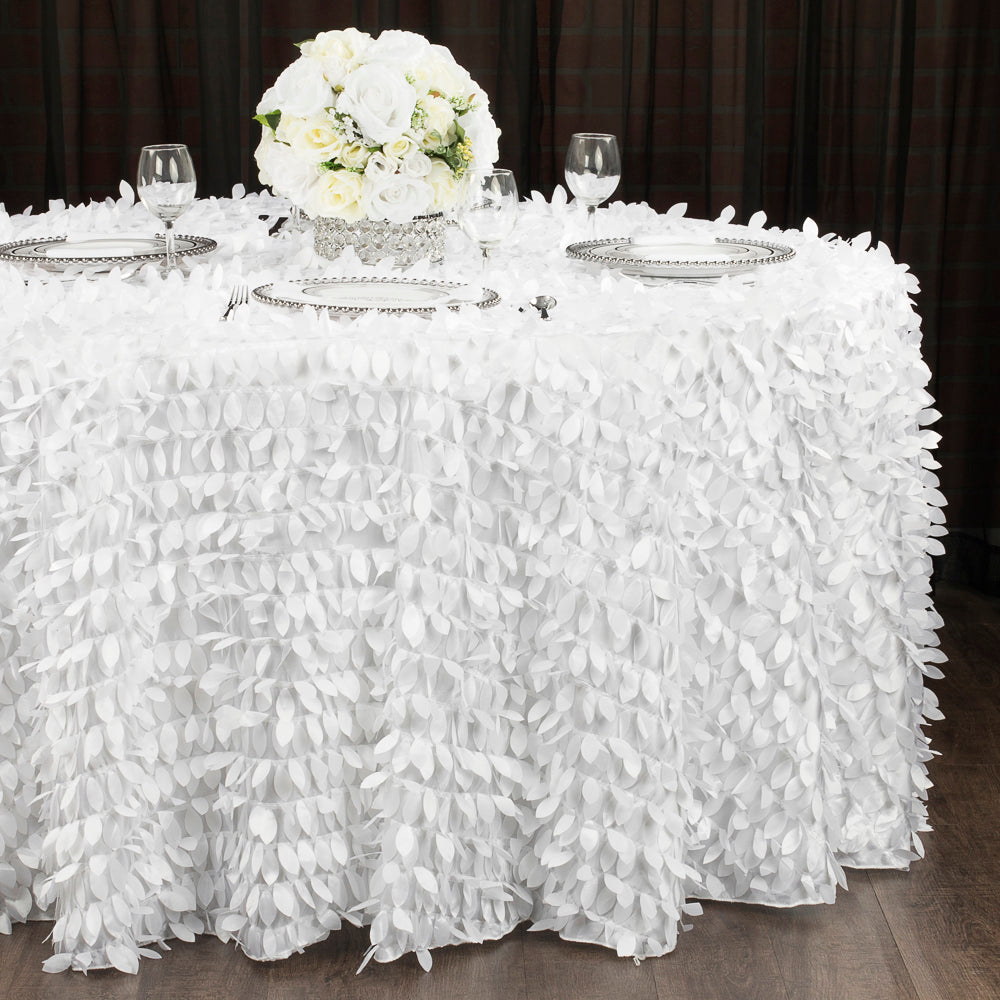 Enchant your guests with our lovely Leaf Petal Taffeta tablecloths! Each tablecloth is covered in shining and romantic hand-sewn leaf petals to create a stunning look to your wedding or event decor. Taffeta is a high-end fabric that is true to color, lightweight, and has a smooth texture to give a soft sheen throughout your venue. Candle and soft light reflect well on taffeta to create the perfect ambiance for your special day.