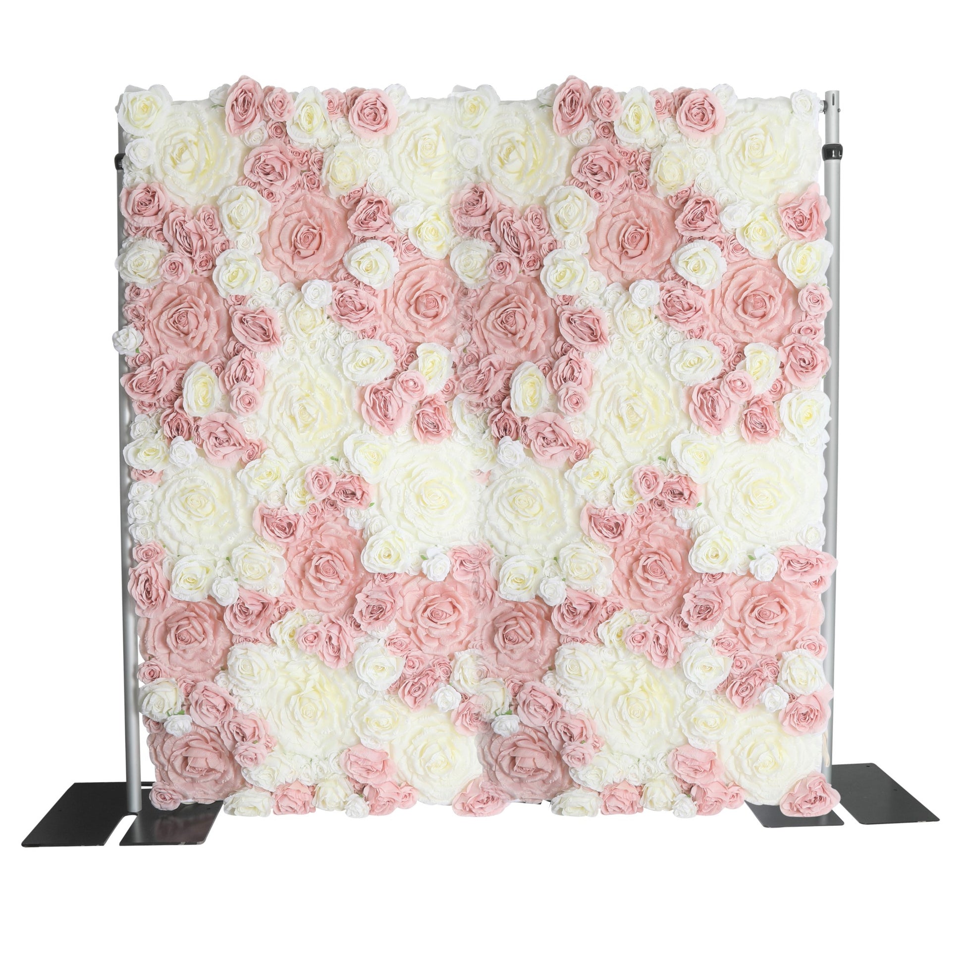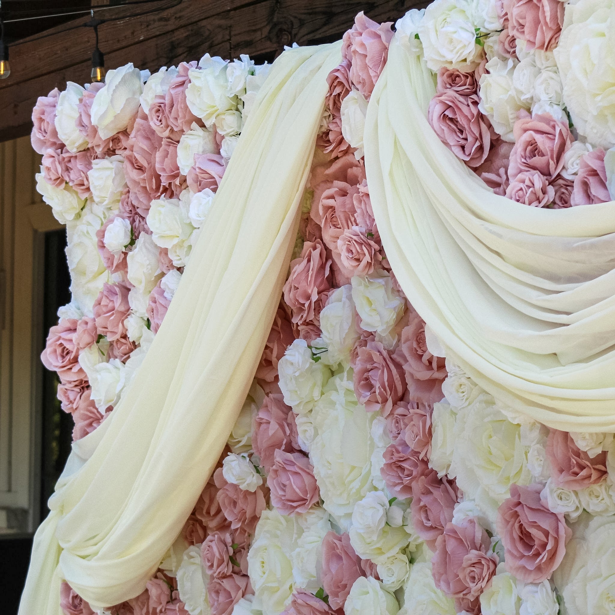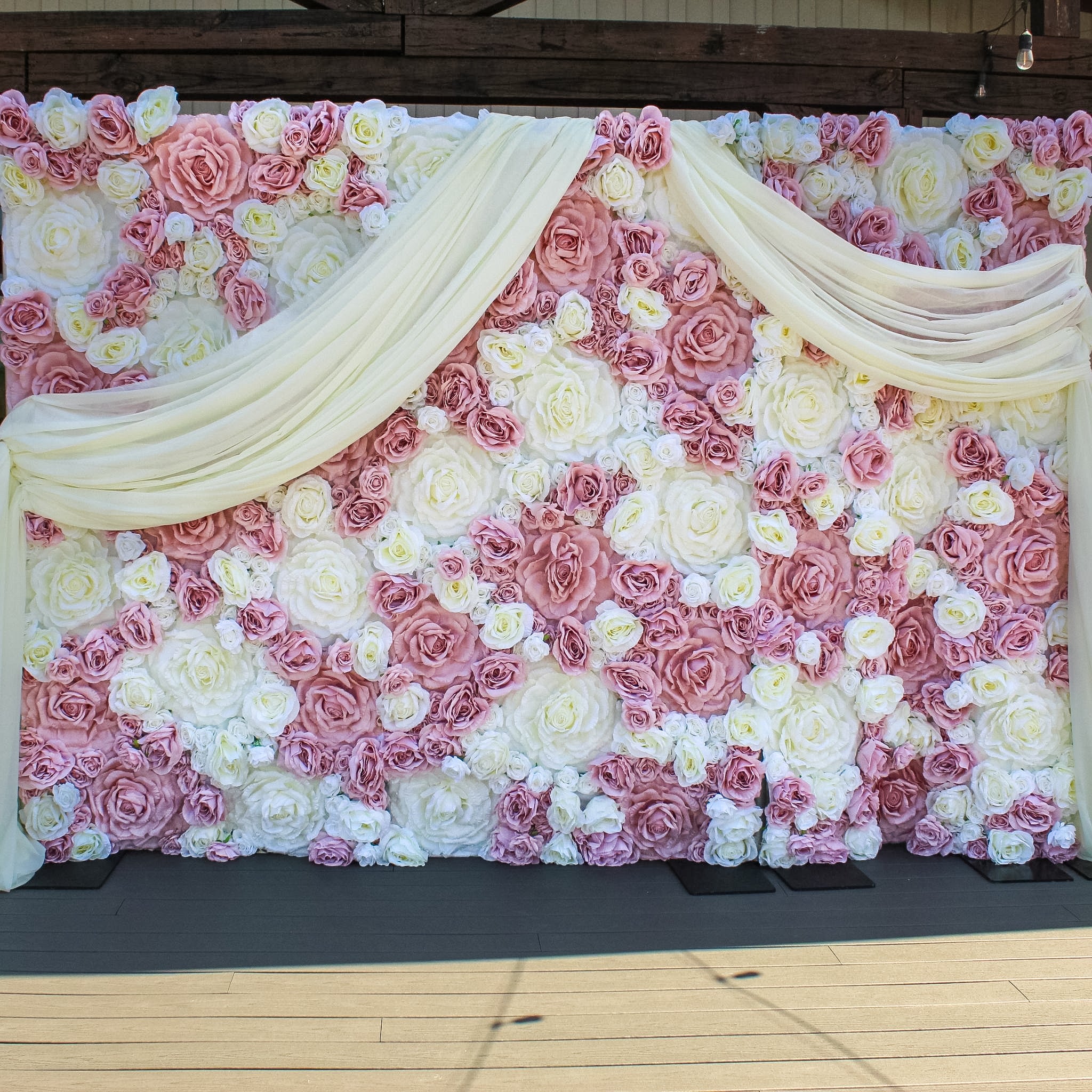 Let's explore how our exquisite pink/ivory roll-up flower wall backdrop can elevate your next event.