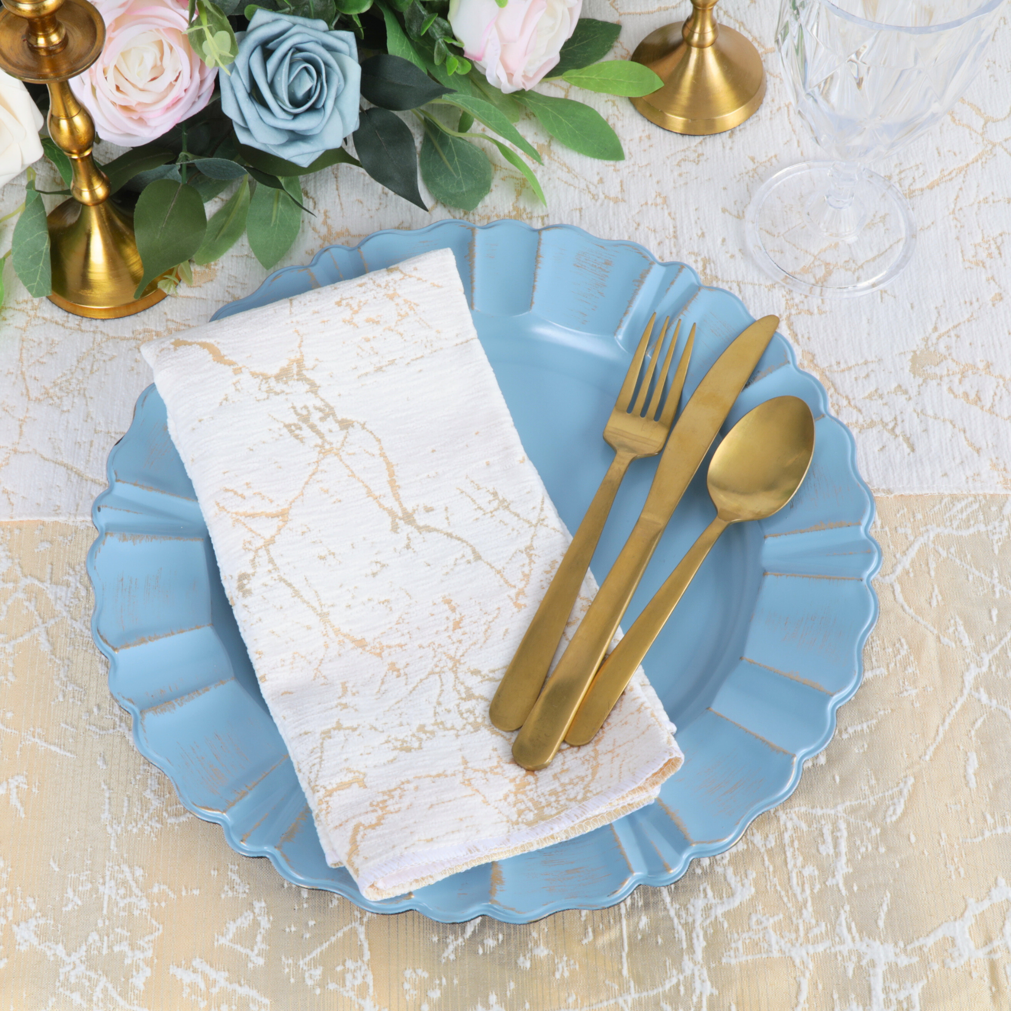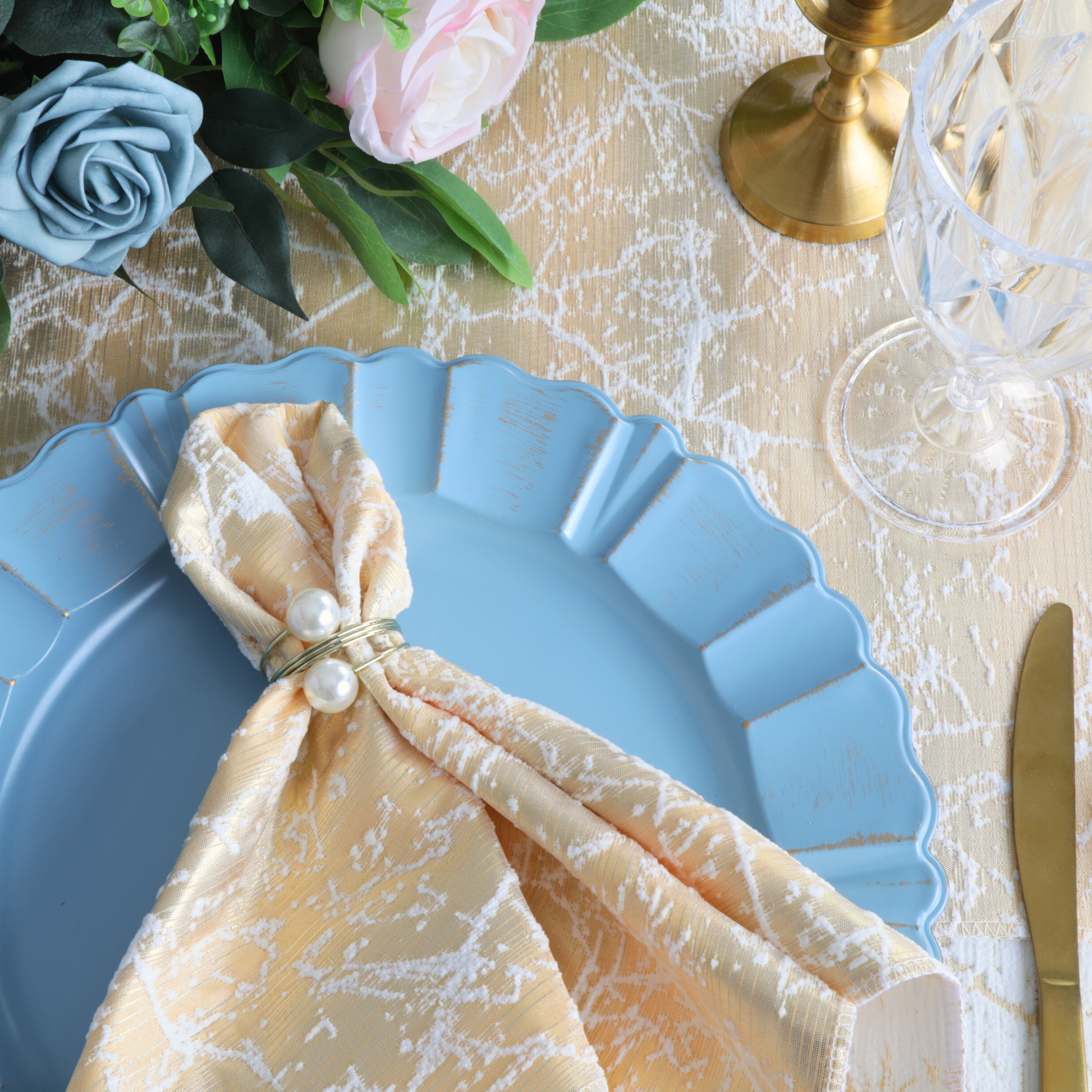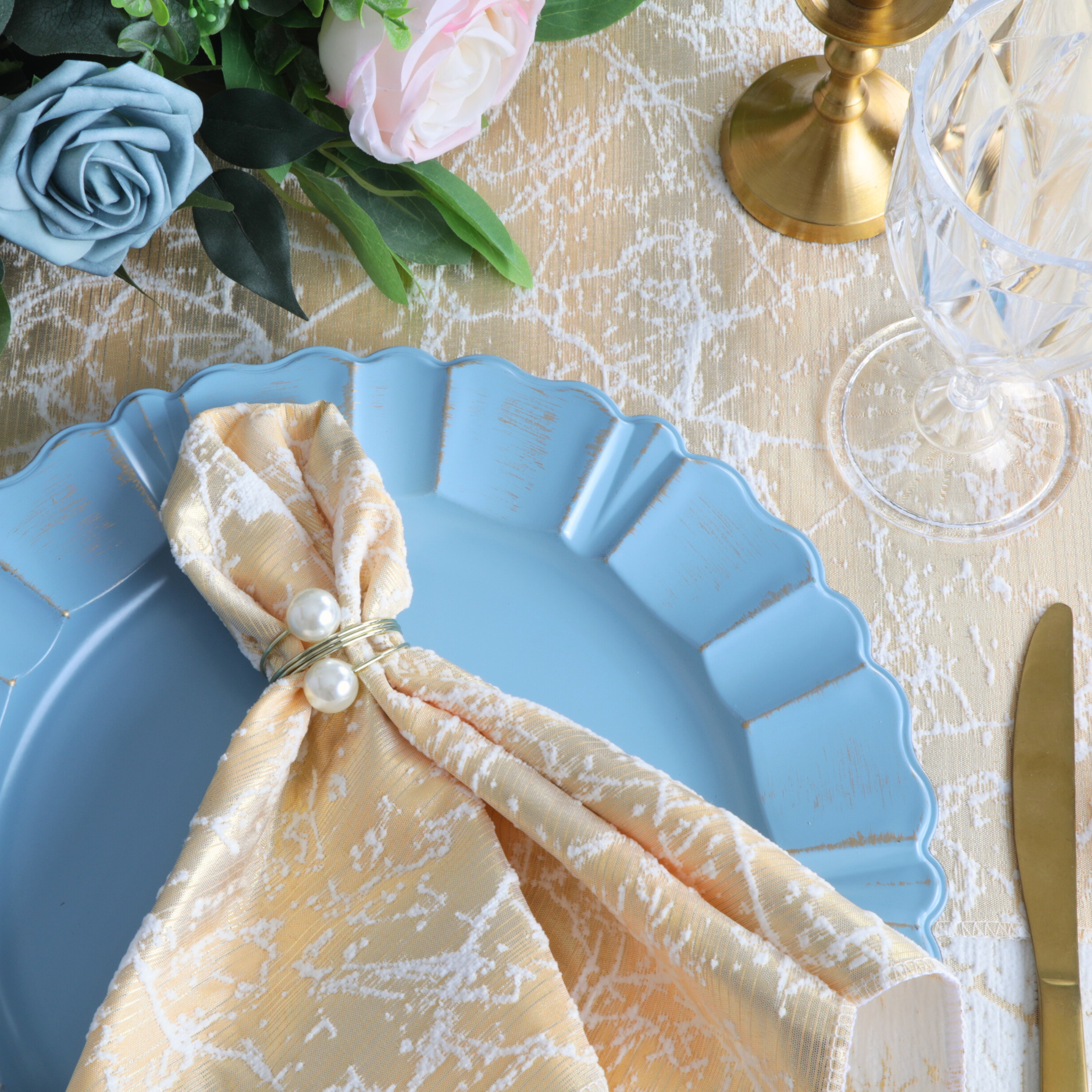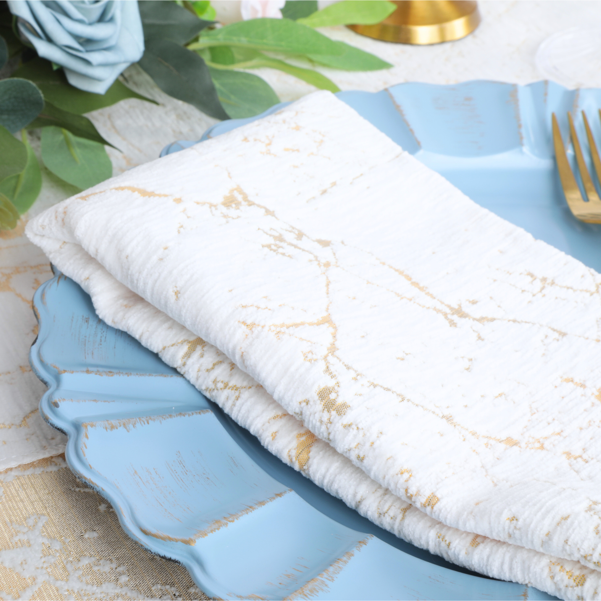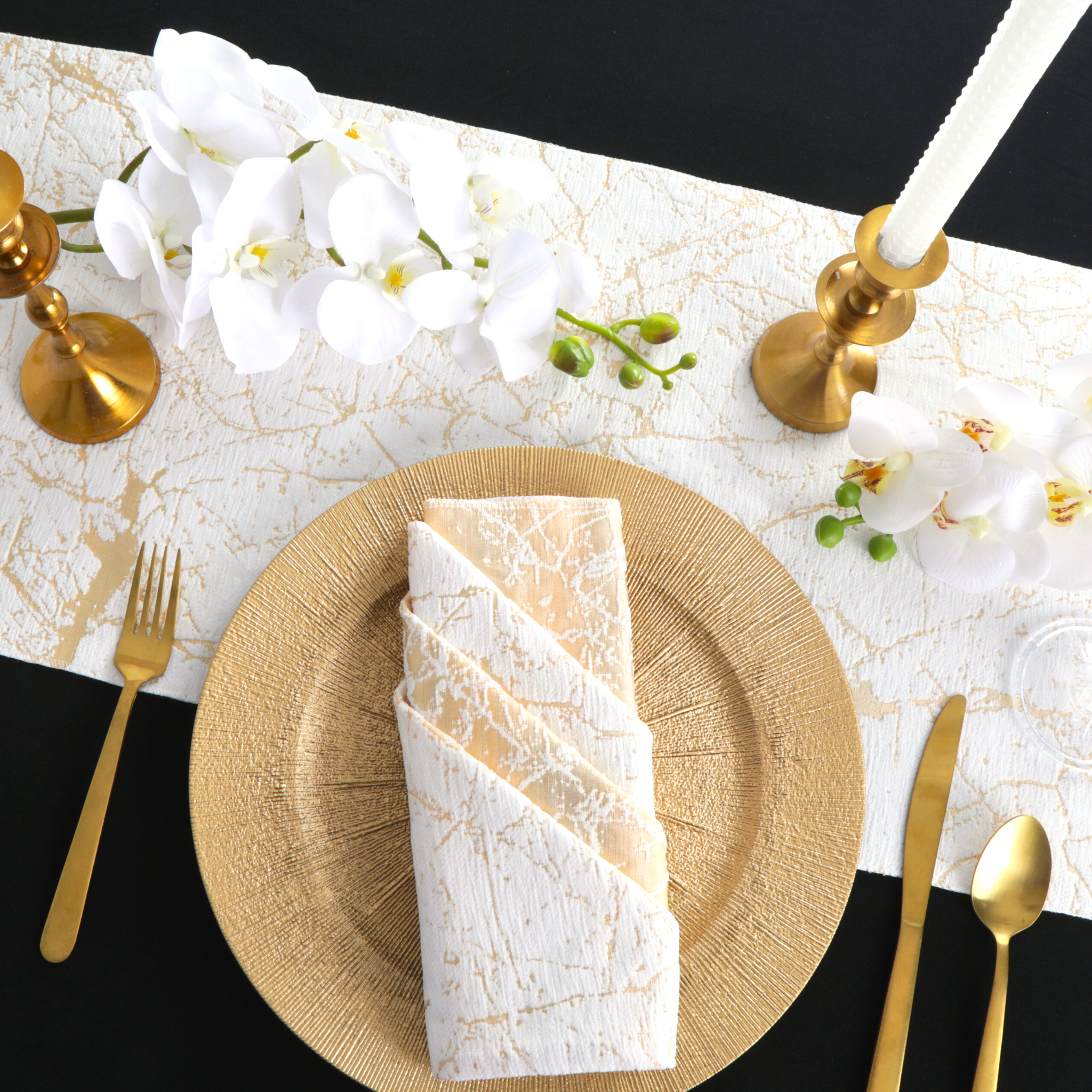 Marble cloth napkins are perfect additions to classic tablescapes that need a touch of detail and texture. These napkins go perfectly well with classic white or black polyester tablecloths. Bring out the details on these napkins by placing them on top of black or gold reef charger plates.