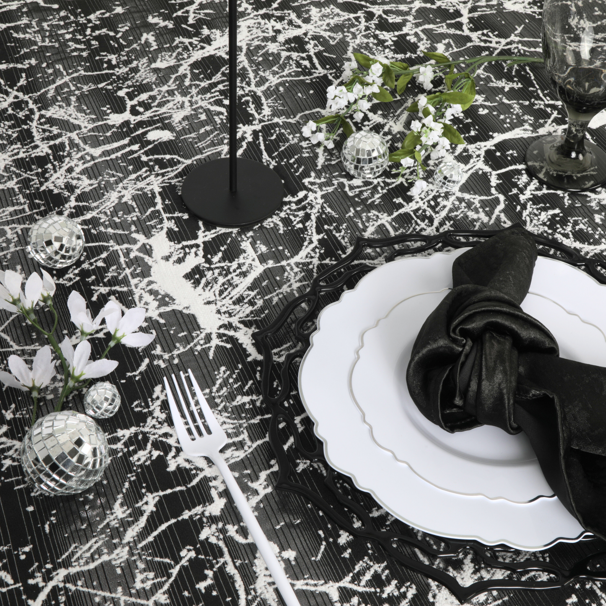 Our shimmering black Marble Reversible Jacquard Tablecloth is meticulously crafted from high-quality polyester for unmatched elegance and versatility. This ensures durability and easy care, perfect for both everyday use and special occasions alike.
