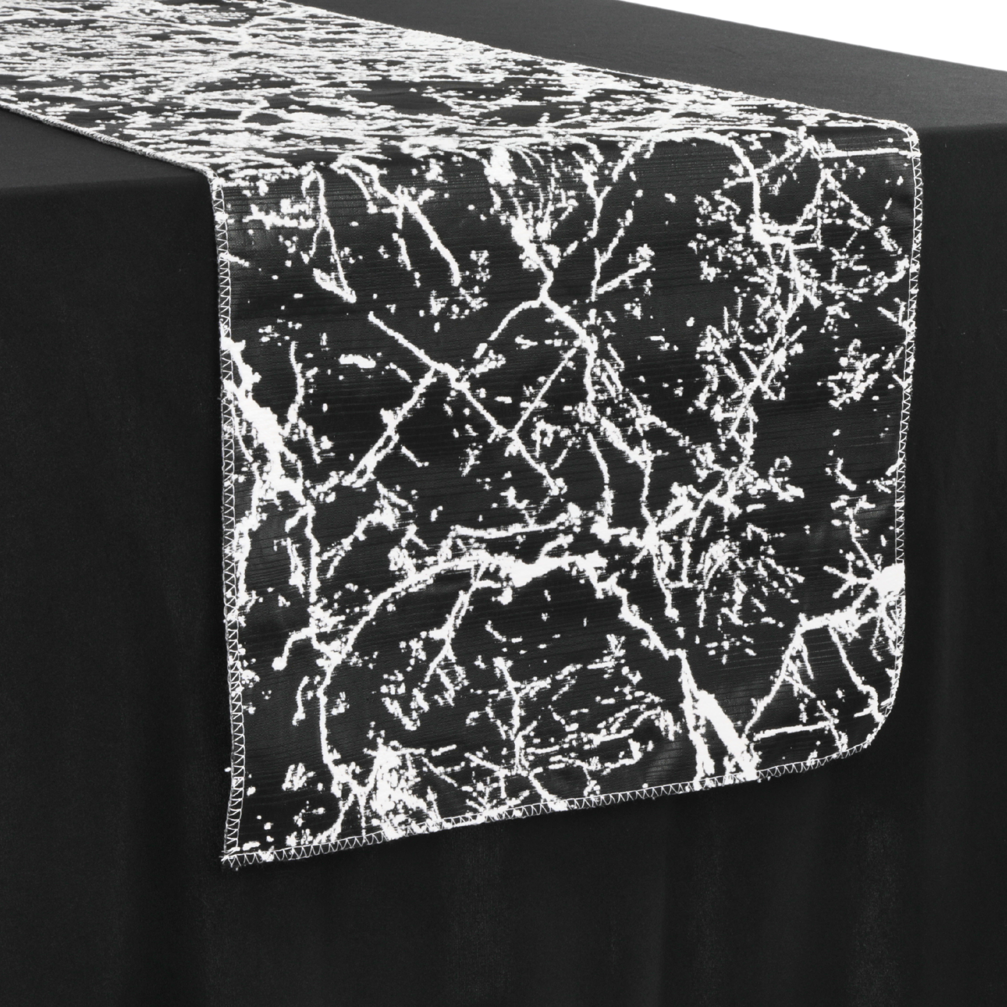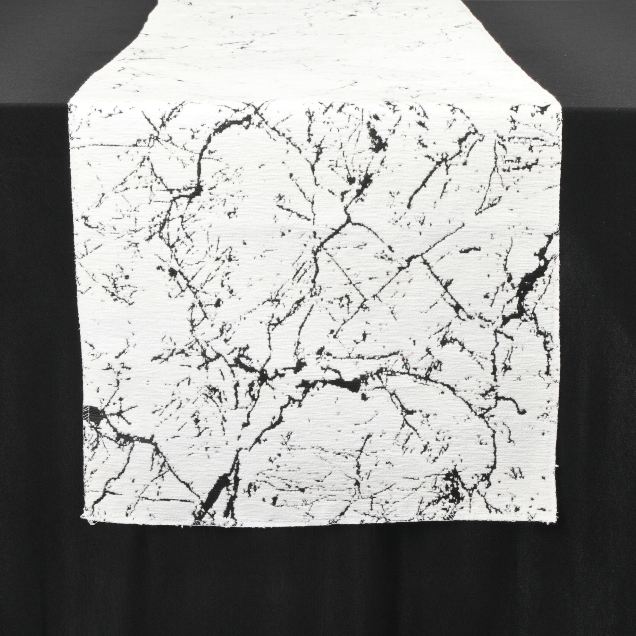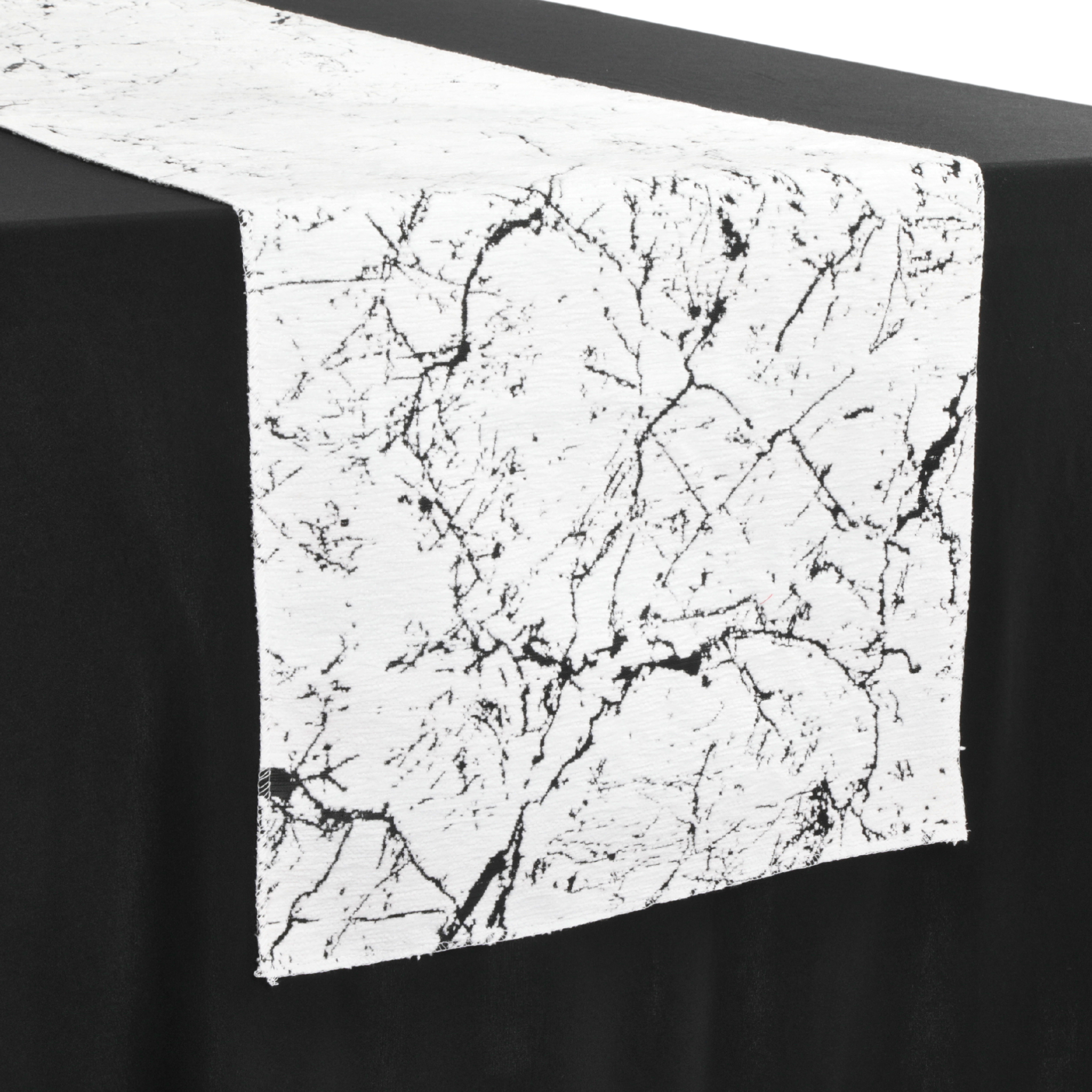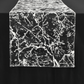 Refined, luxurious, and stylish, our 14" W x 108" L marble reversible jacquard table runner in black is the perfect statement piece for upscale event decor. This runner is designed for those who love a bold aesthetic as it adds a modern, artistic flair to any tablescape.