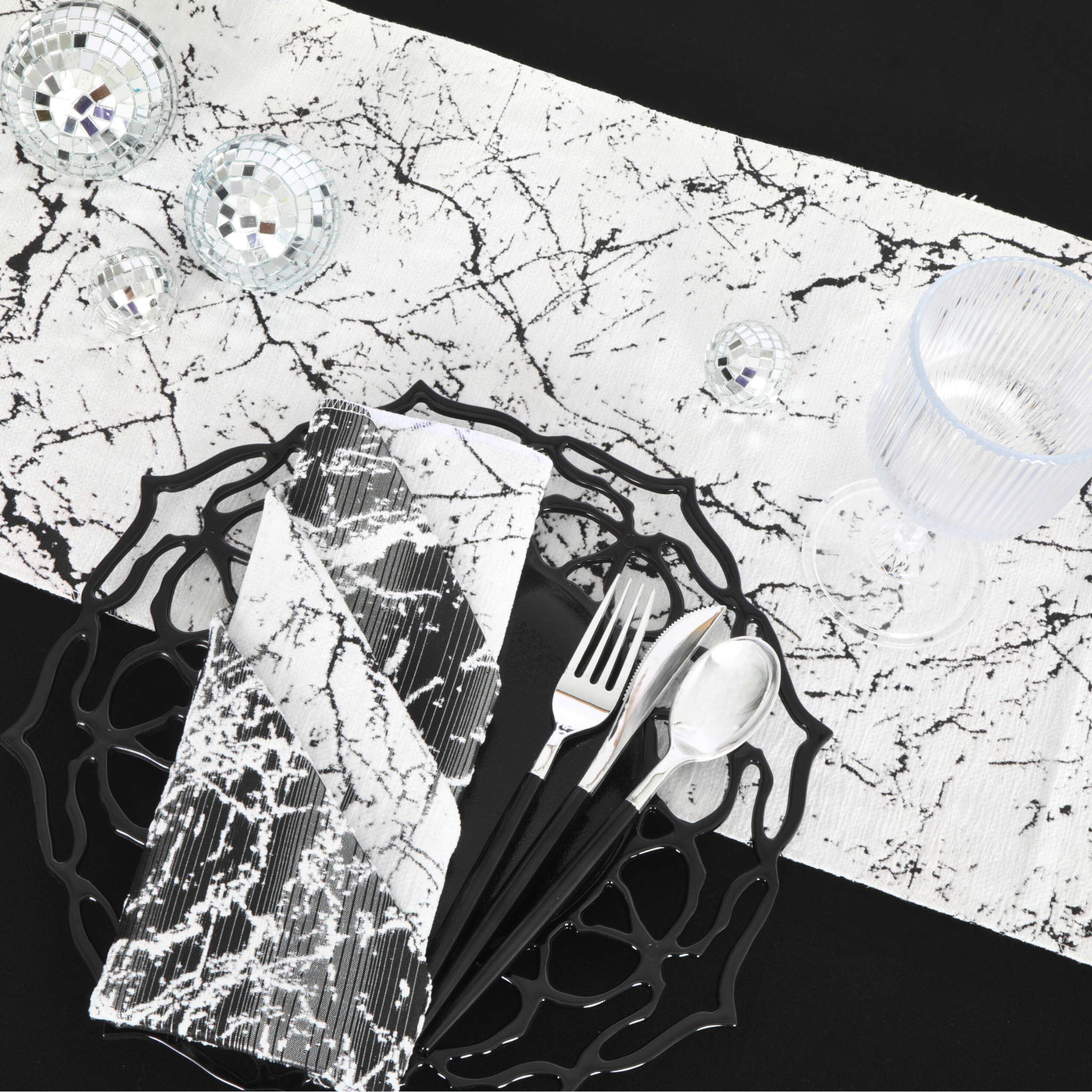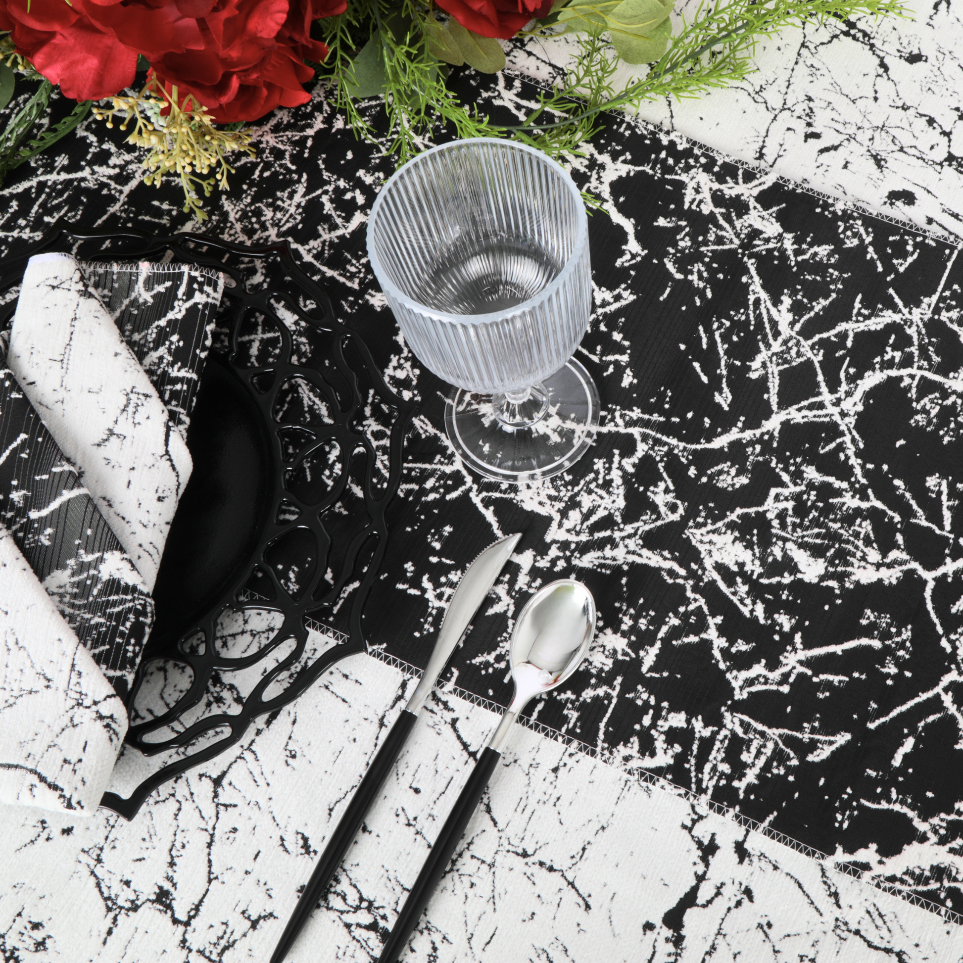 Creating a breathtaking tablescape begins with the right foundation, and our black marble reversible jacquard table runner is the ideal piece to set the tone for an extravagant event.