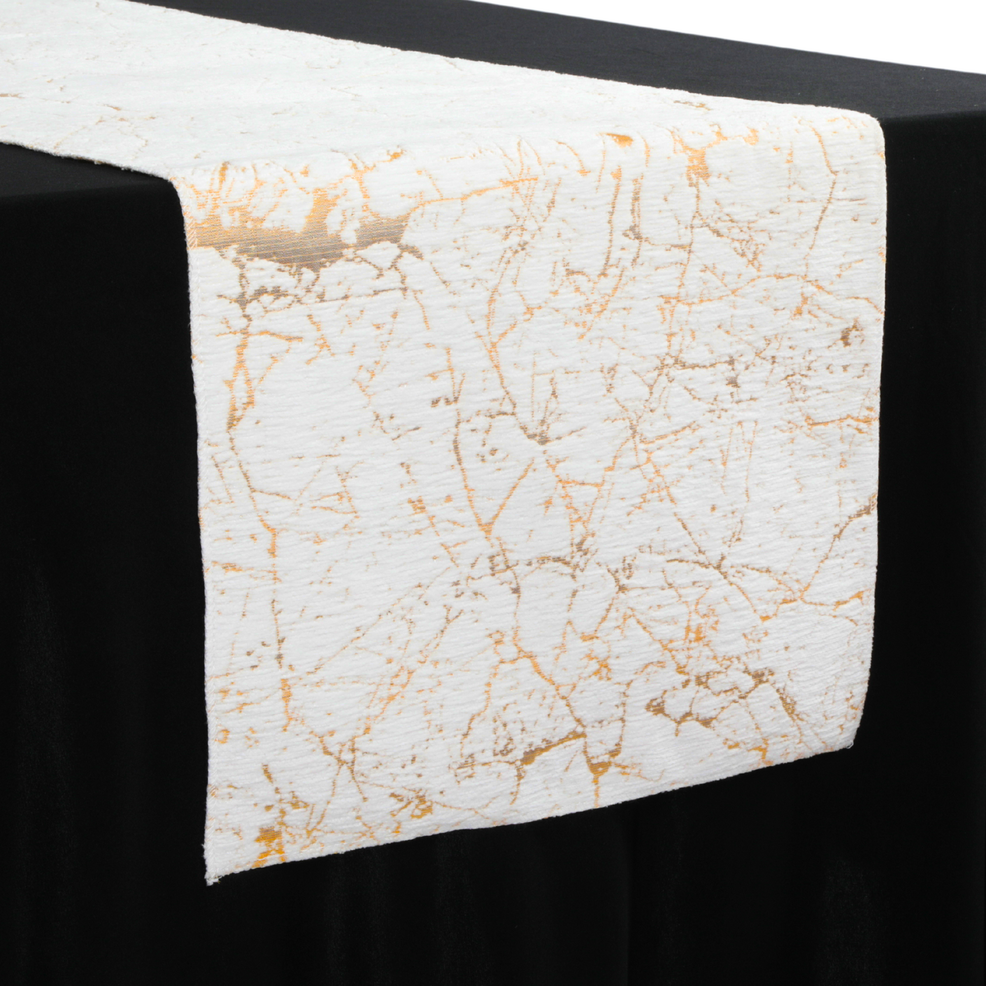 Refined, luxurious, and stylish, our 14" W x 108" L marble reversible jacquard table runner in gold is the perfect statement piece for upscale event decor. This runner is designed for those who love a bold aesthetic as it adds a modern, artistic flair to any tablescape.