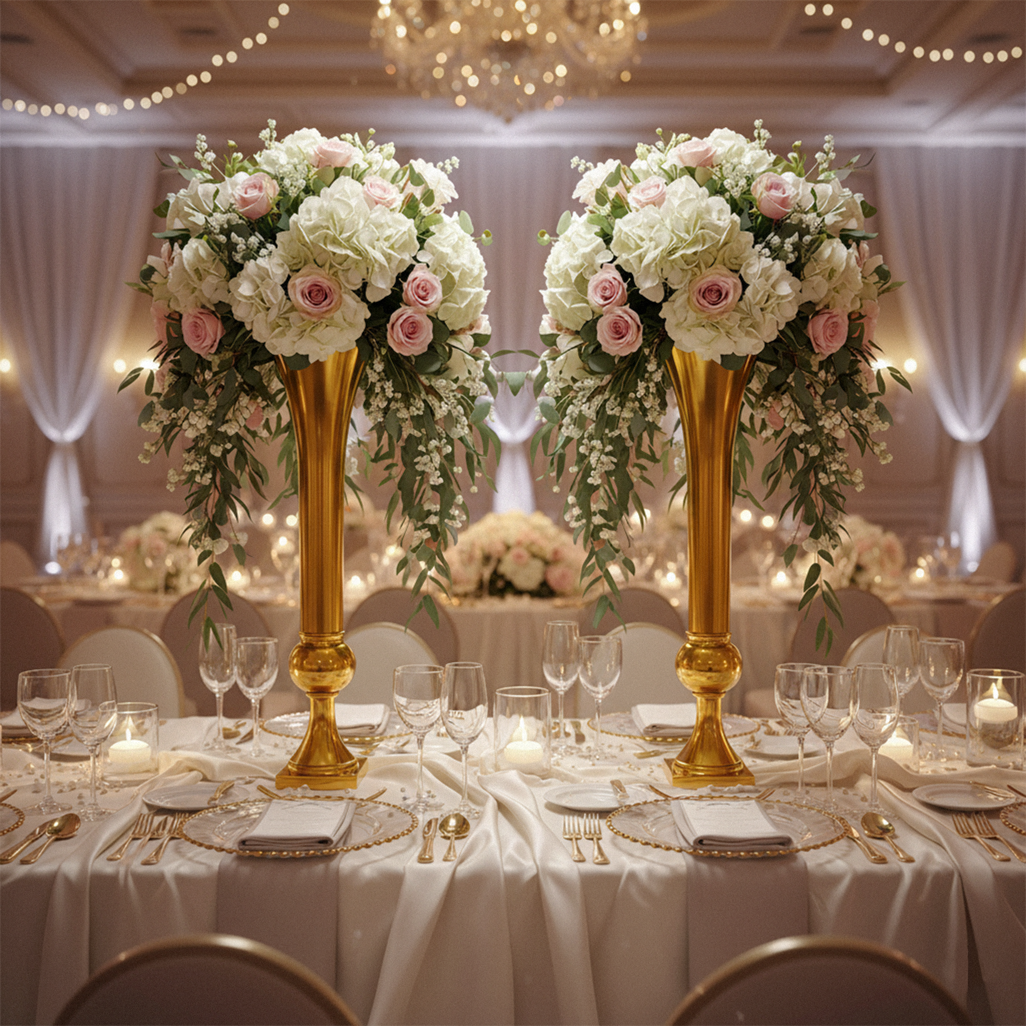 Take your event to new heights by styling your tablescape with our metal trumpet centerpieces. Choose tablecloths that match the elegance of these gold vases to create a gorgeous base. Opt for classic white tablecloths for a clean backdrop.