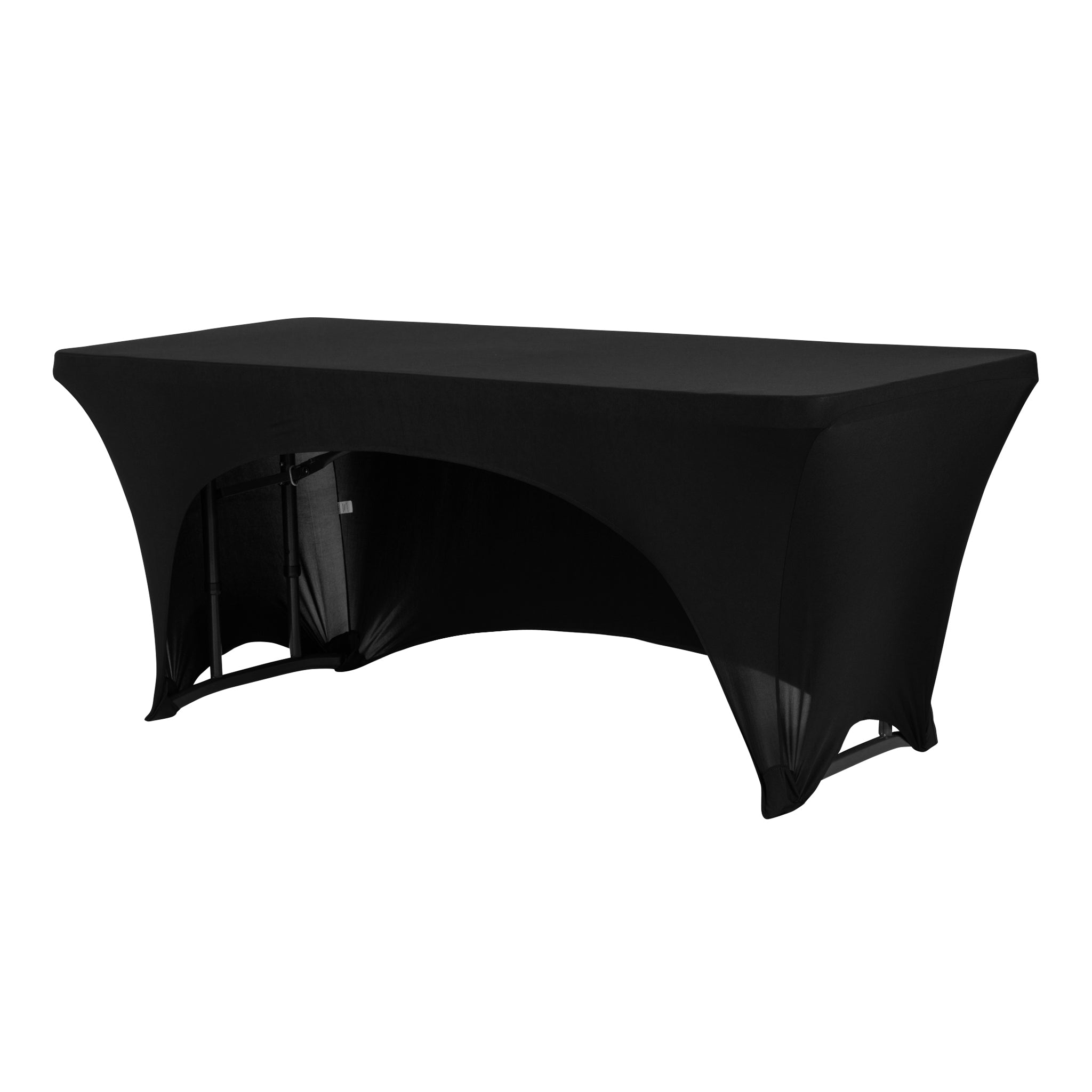 Made from high quality, wrinkle-free flexible spandex materials, our Open Back Stretch Spandex Table Cover 6 FT Rectangular - Black exemplifies a sleek and modern look suitable for any special occasion. Why rent tablecloths for trade shows or weddings when you can buy them cheaper and reuse them time and again? The modern sophistication of our wholesale rectangular spandex tablecloth delivers a smooth, wrinkle-free look that is ideal for wedding banquets, restaurants, meeting rooms, catered functions, conventions, trade shows, or any occasion that requires someone to sit behind the table. The open-back design of this stretch tablecloth is ideal for easy reach and storage of such items as goody bags, welcome bags, product swag, and brochure boxes.