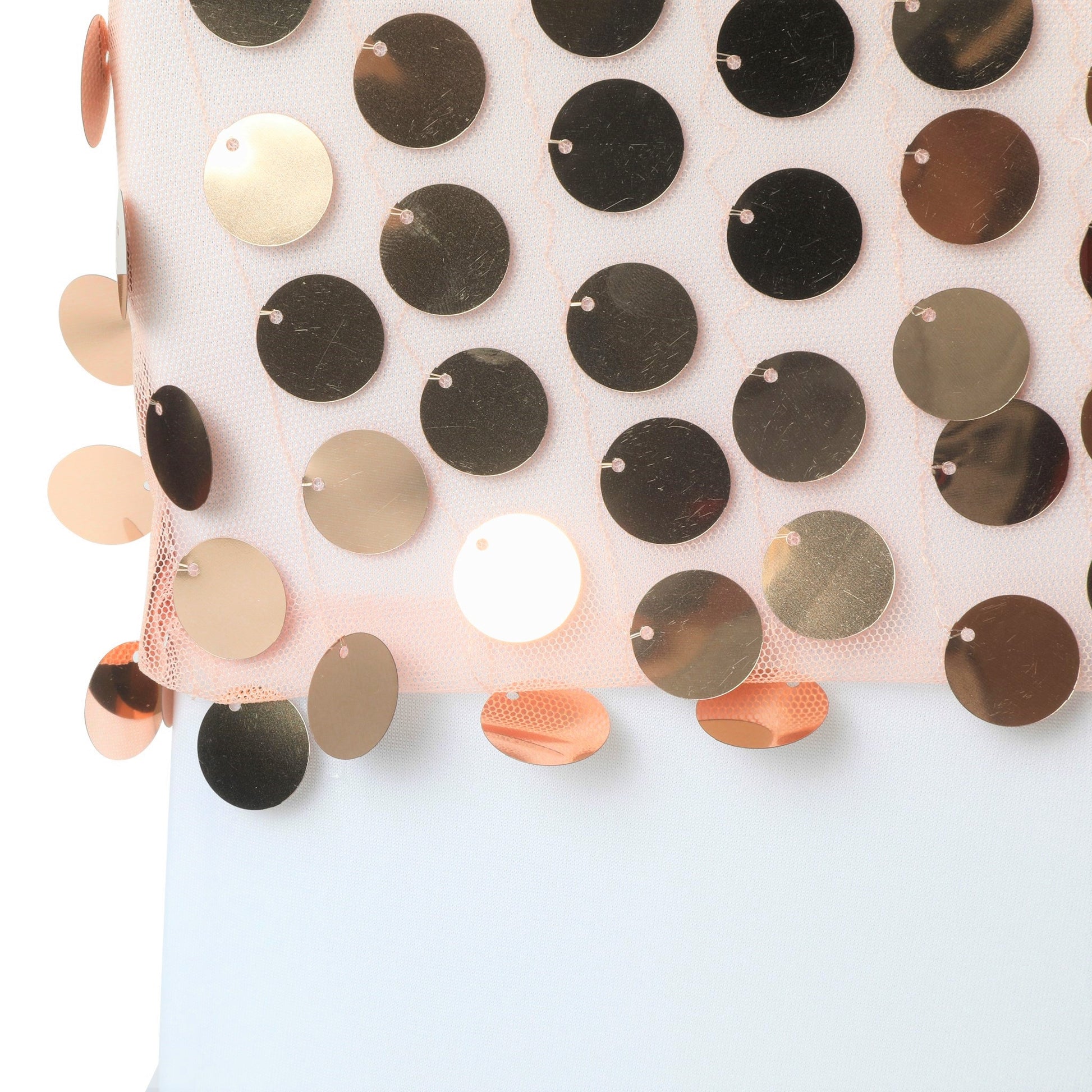 We also offer rose gold table runners in bulk and champagne sequin chair bands that you can mix and match for more decorating options