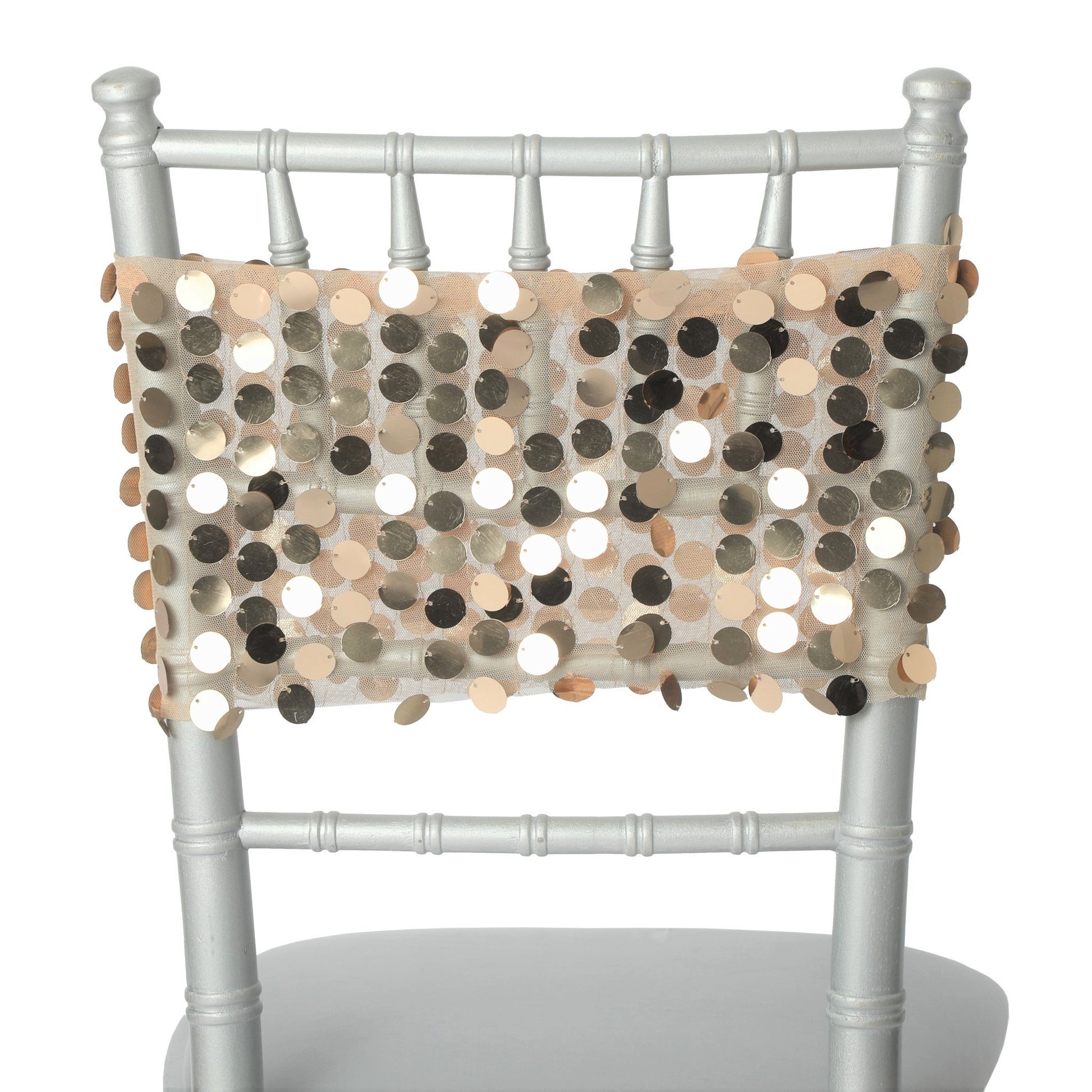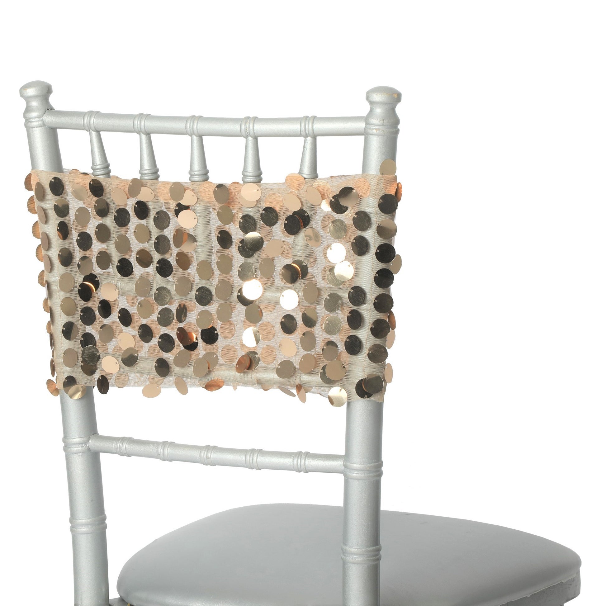 One order comes in packs of five beautifully crafted chair bands. These Payette sequin event linens are backed with mesh lining making them durable and elegant.