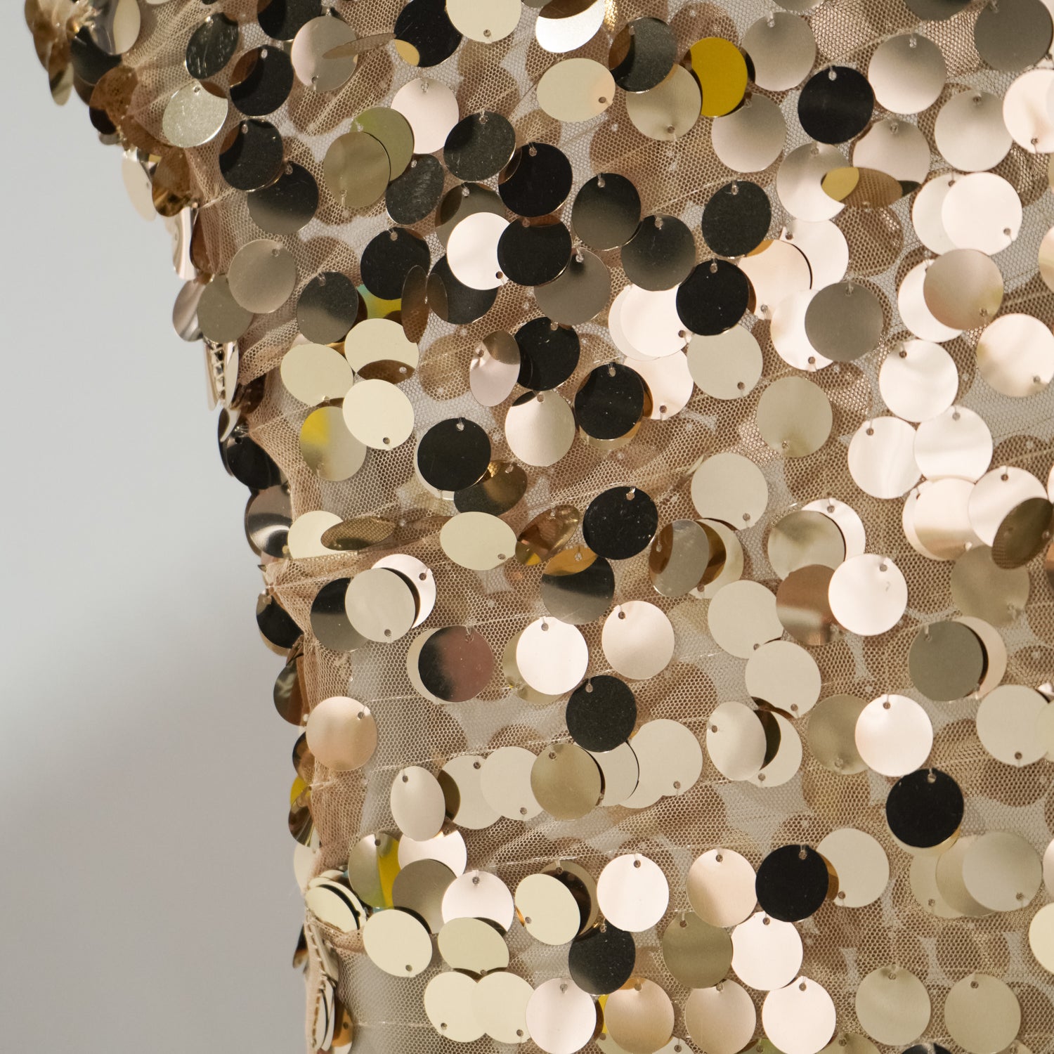 Elevate your event venue with a dash of sophistication and charm using our captivating champagne payette sequin open center arch cover. Orchestrate an intimate gathering or put the final embellishments on a grand celebration with this product. This decor is crafted to bring a touch of glamor to your event.