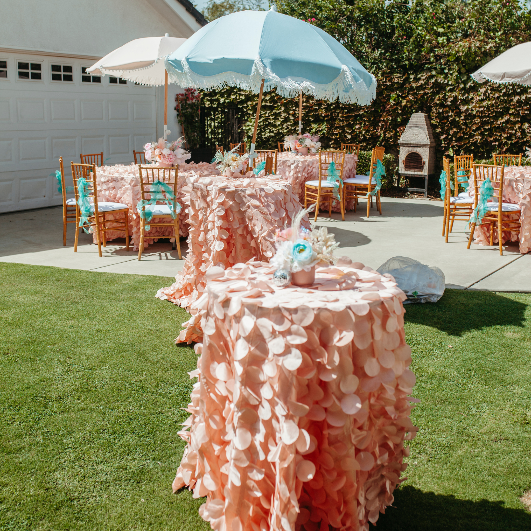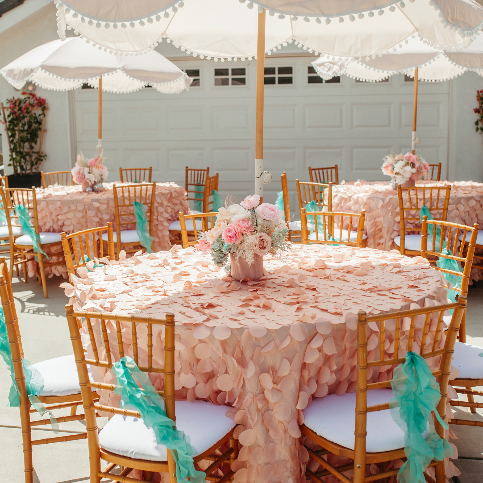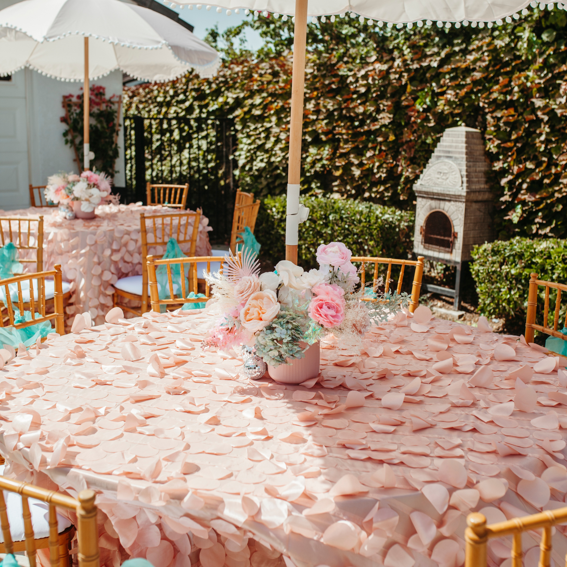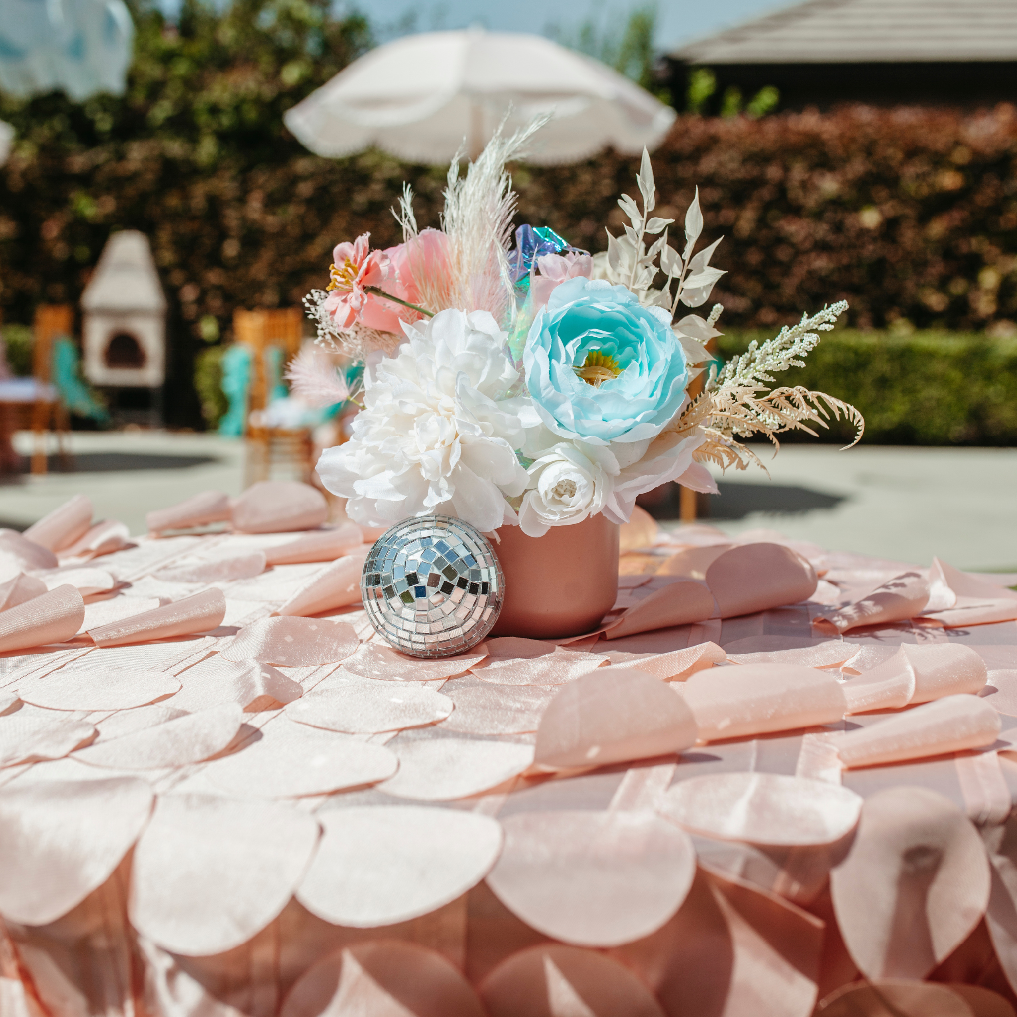 Add some refined fun to your event with our Petal Circle Taffeta Tablecloths! Each tablecloth is covered in playful geometric circles that are hand-sewn into our durable taffeta base to create a chic and unique look for your wedding or event decor. Taffeta is a high-end fabric that is true to color, lightweight, and has a smooth texture to give a soft sheen throughout your venue. Candle and soft light reflect well on taffeta to create the perfect ambiance for your special day!