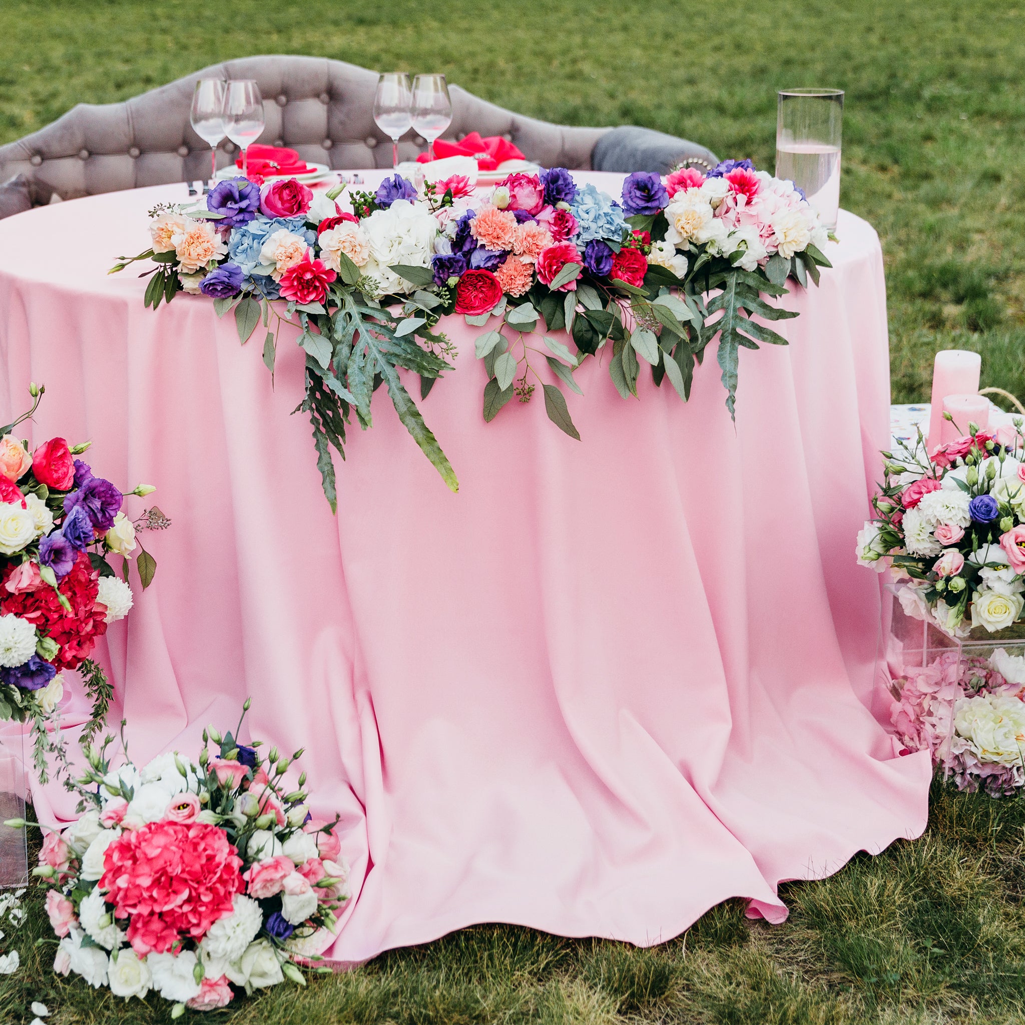 Polyester is an efficient and economical choice for a tablecloth; it can easily be used at weddings, trade shows, showrooms, events, or even your home! Made from 100% tough polyester, our tablecloths are a durable material that is easy to maintain. An advantage to using Polyester is that it's extremely versatile and can be dressed up for an ultimate glam event, dressed down for a shabby-chic rustic wedding, and can even be used as a clean and modern look for a minimalist event! Pair with any texture, such as Organza or Satin Rosette, to enhance your event decor.