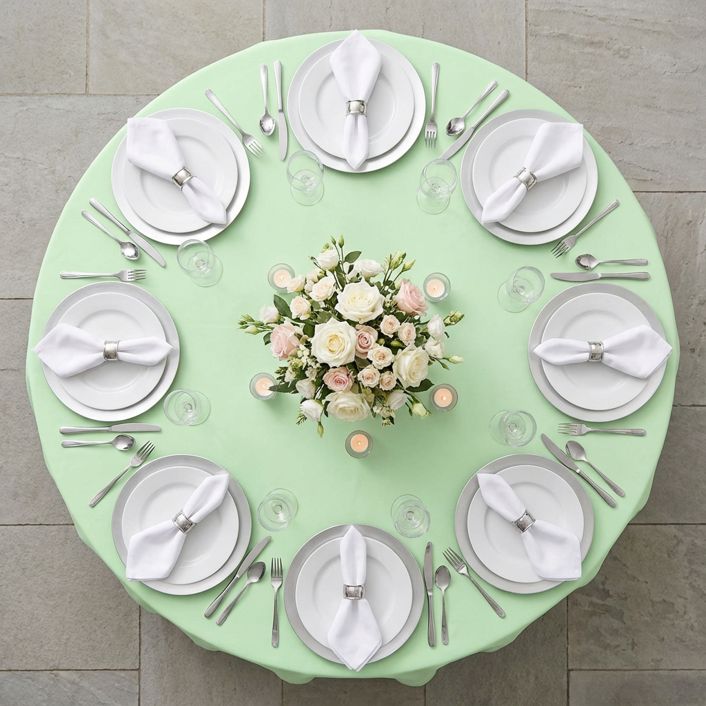 Adding style to your tablescape using our Mint Green 120" Polyester Round Tablecloth is a dream come true for event planners who love combining softness with lavishness. Start by placing a gold or rose gold table runner along the center of the table to introduce a warm contrast that is sure to catch the eye instantly.