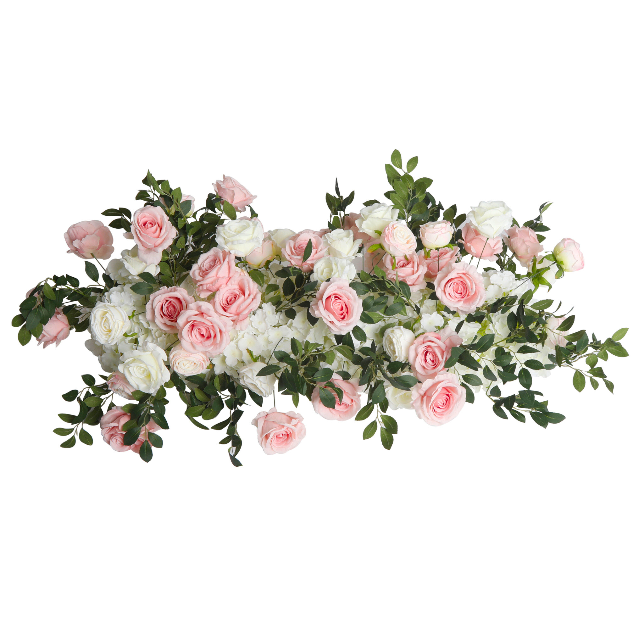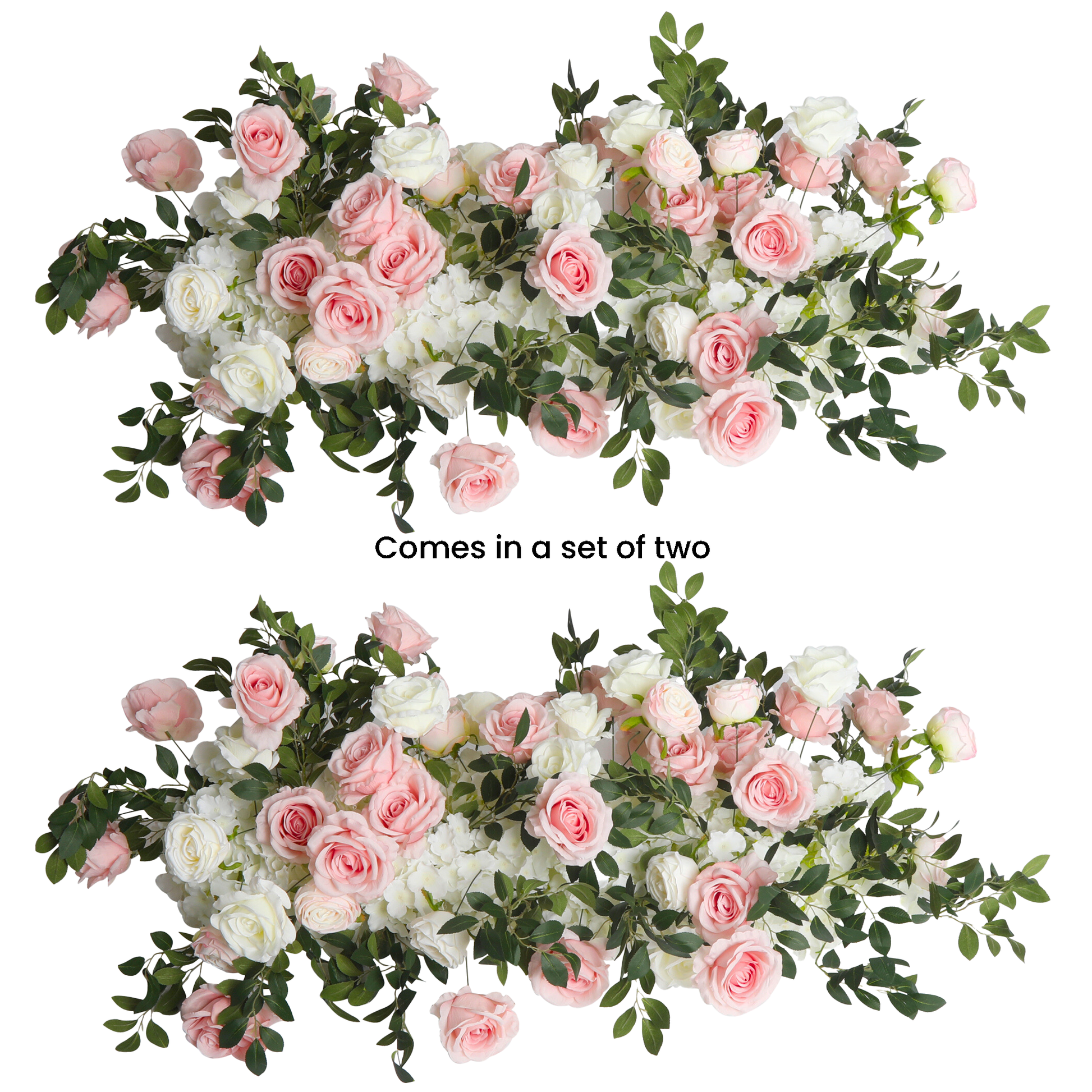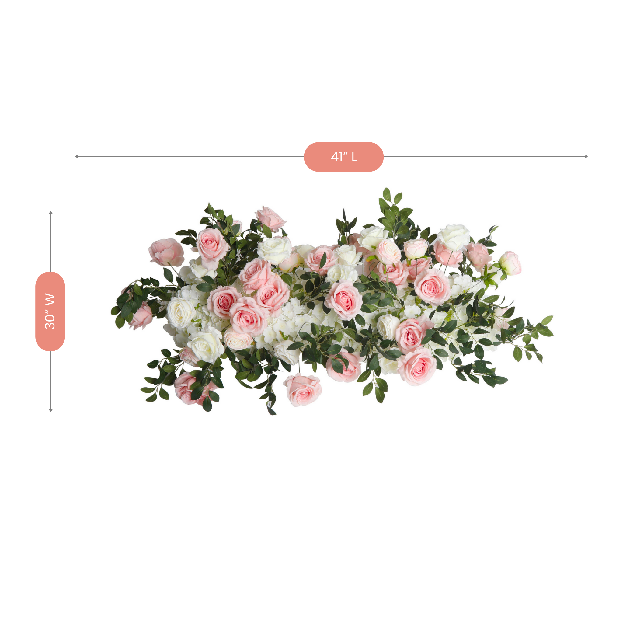 This flexible decor item can easily double as a beautiful wedding arch and a captivating table runner. Every piece is crafted with soft pink and white exquisite faux roses, peonies, and hydrangeas.