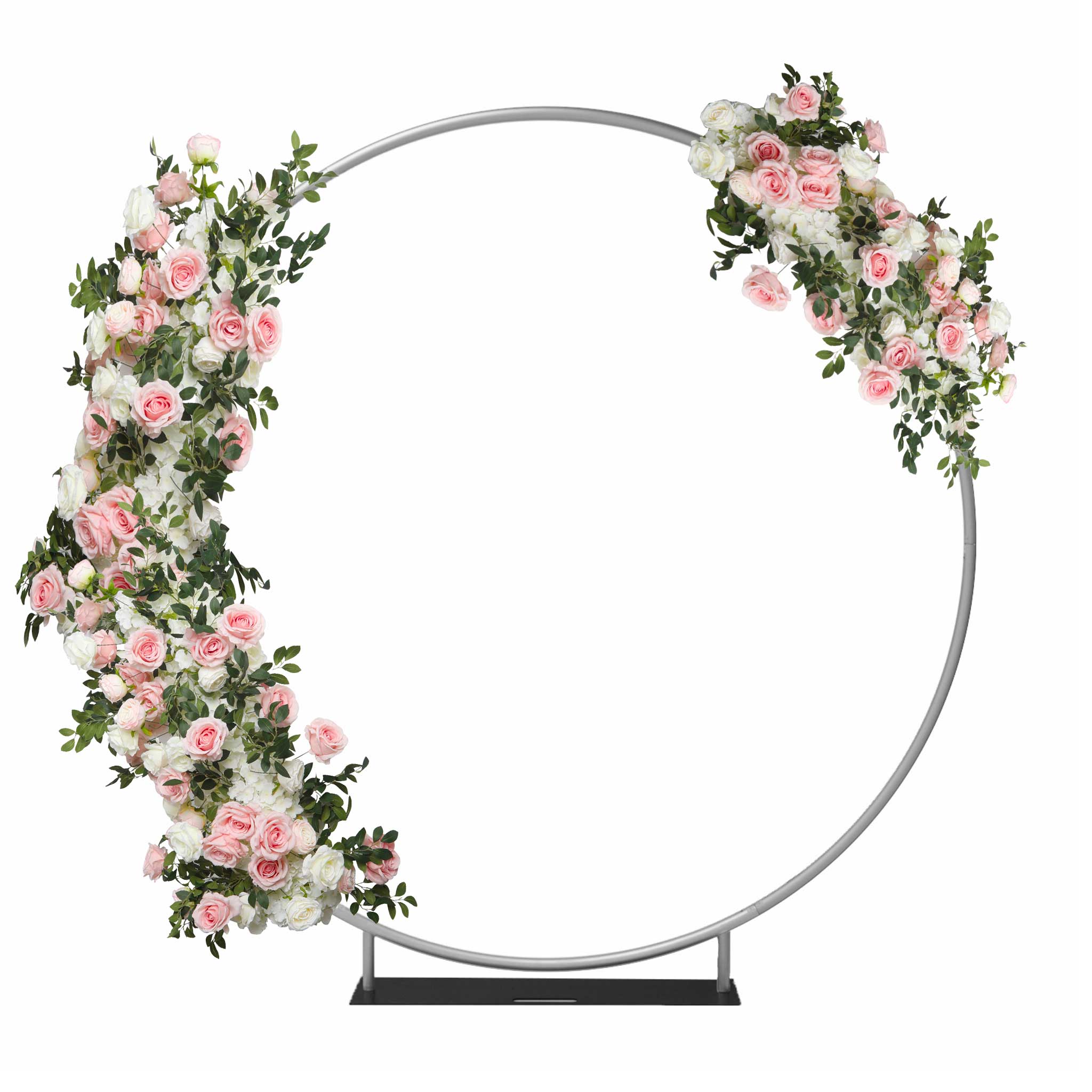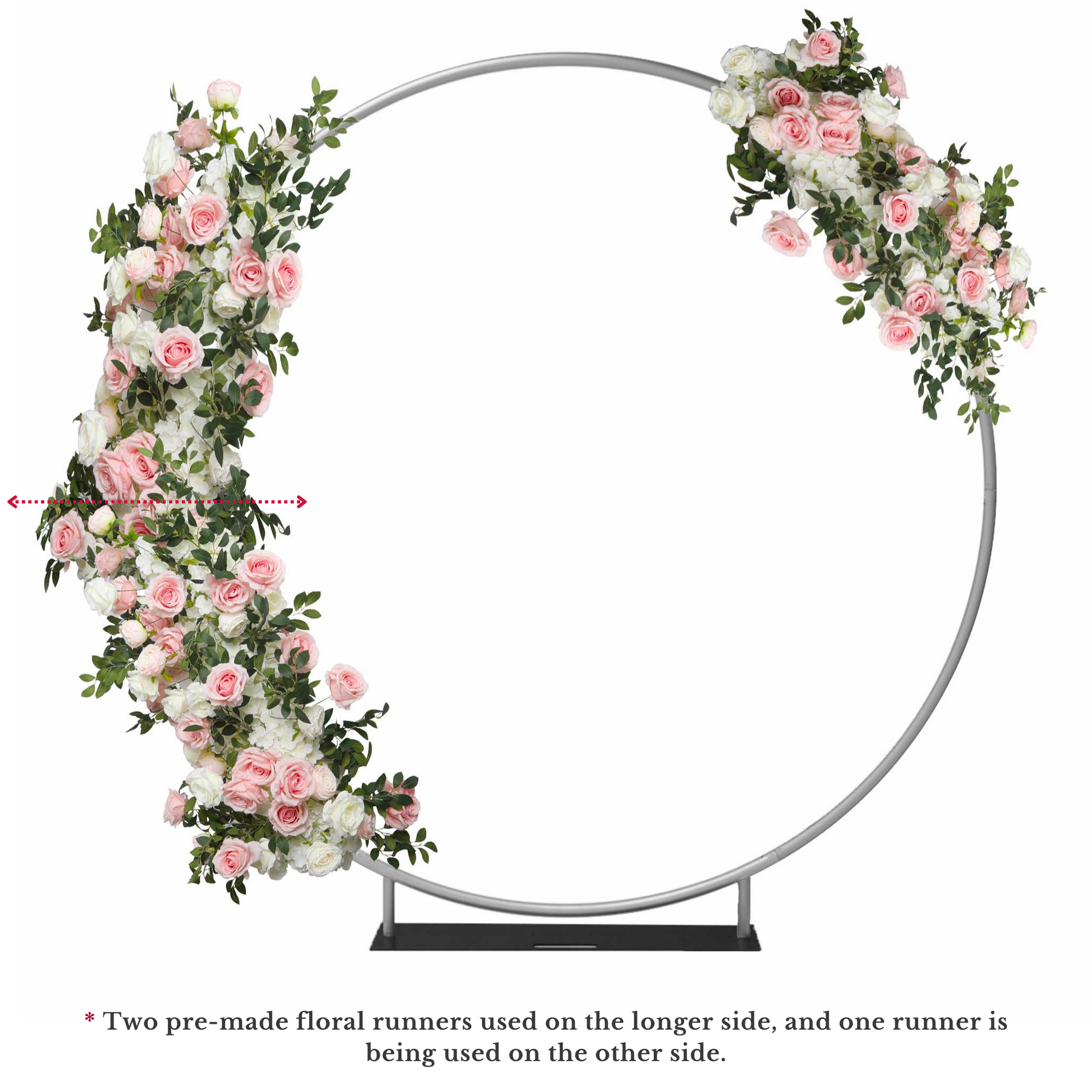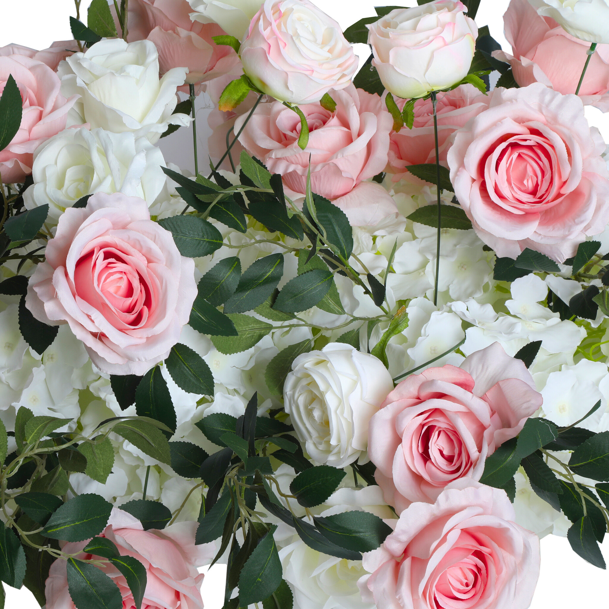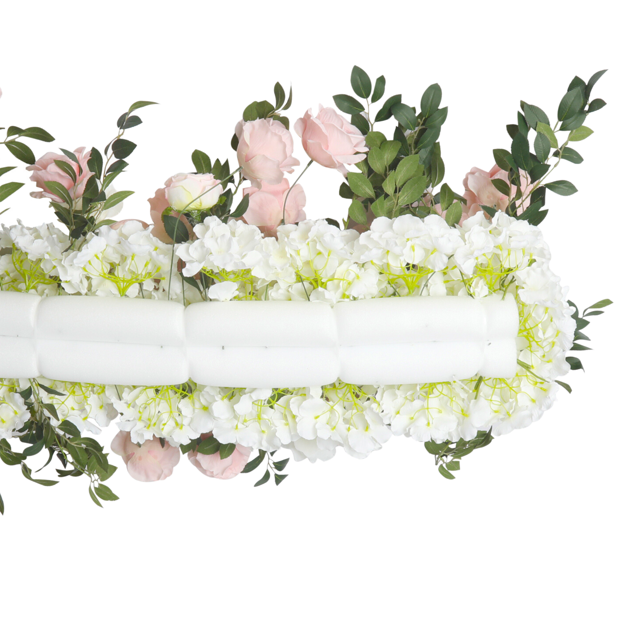 This flexible decor item can easily double as a beautiful wedding arch and a captivating table runner. Every piece is crafted with soft pink and white exquisite faux roses, peonies, and hydrangeas.