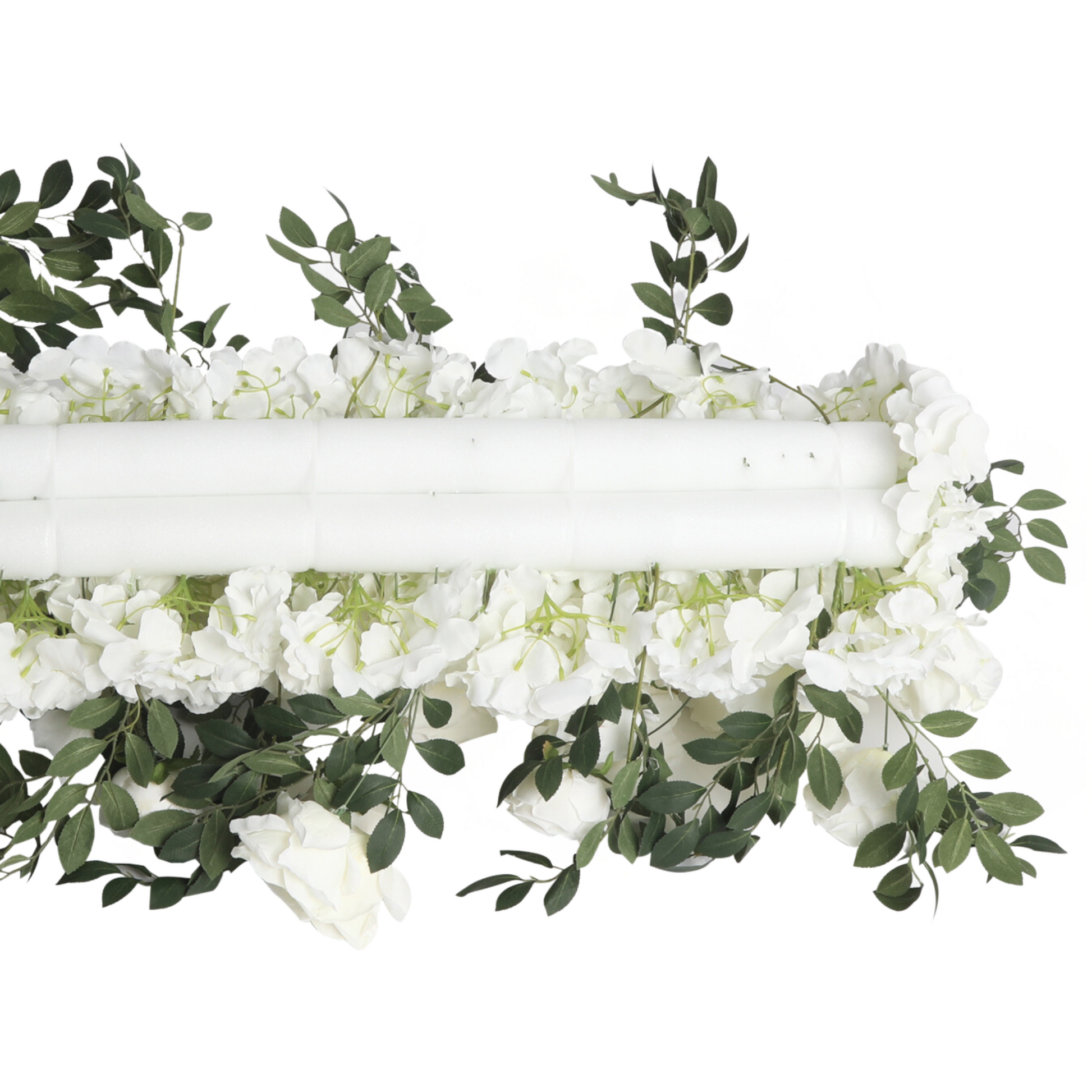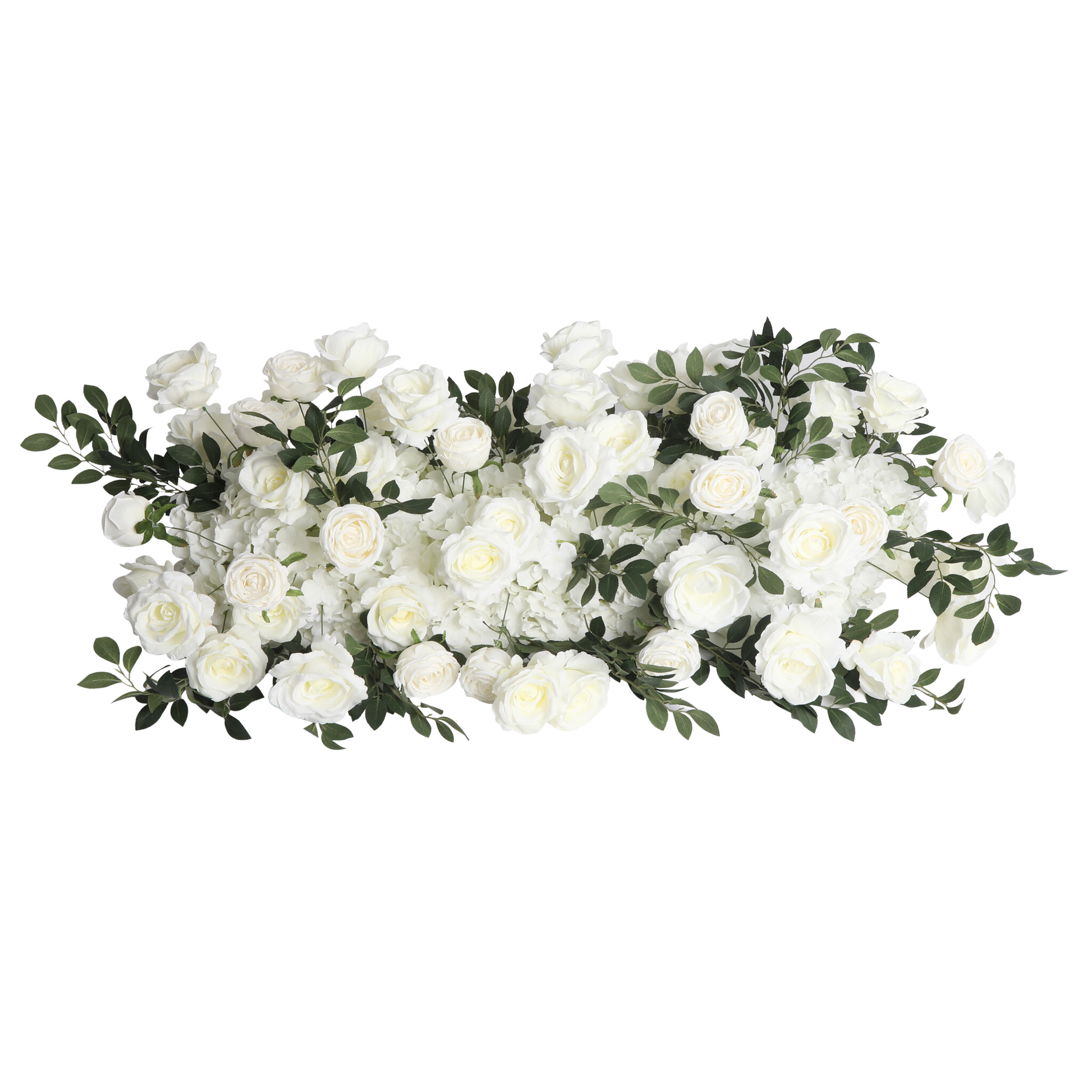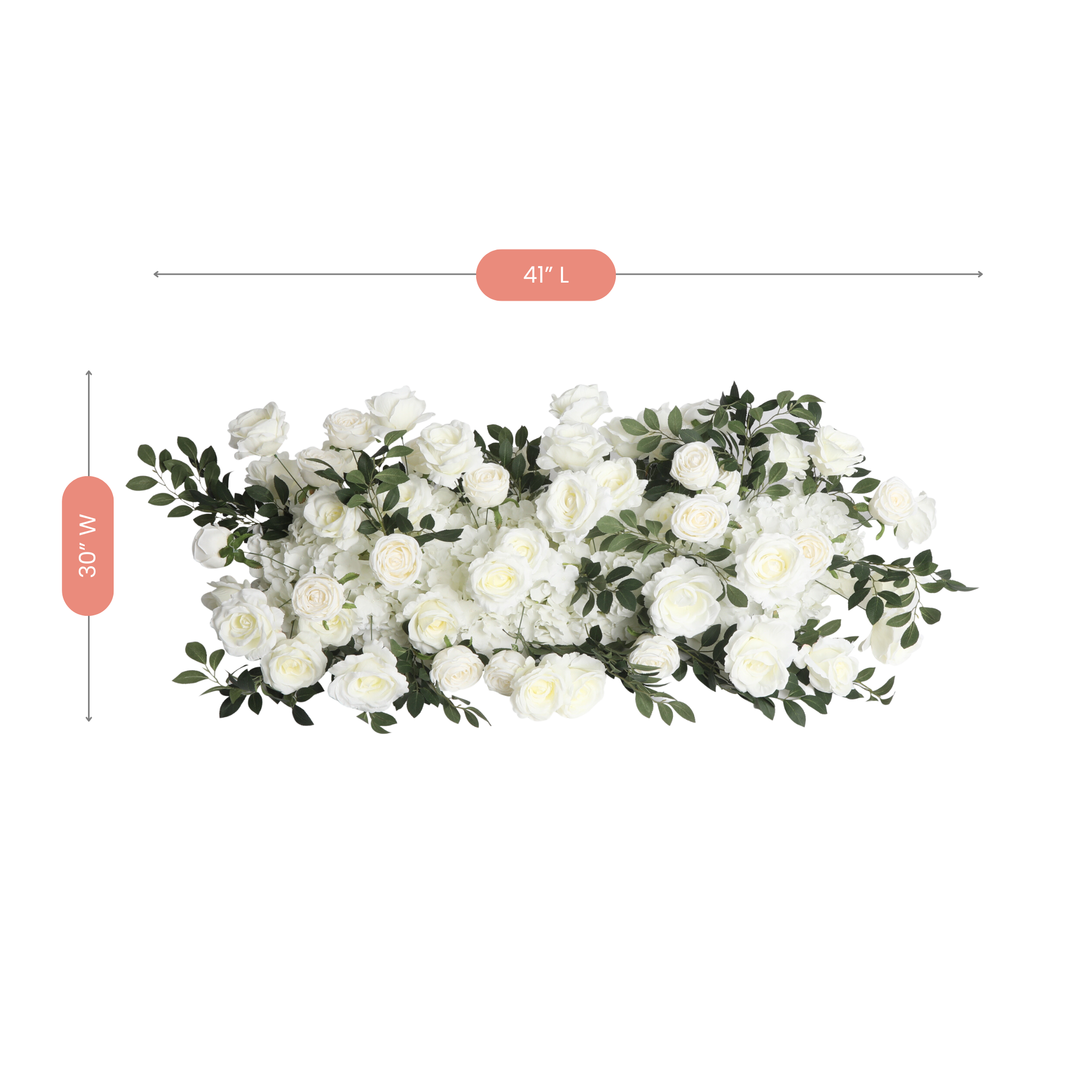 This flexible decor item can easily double as a beautiful wedding arch and a captivating table runner. Every piece is crafted with soft pink and white exquisite faux roses, peonies, and hydrangeas.