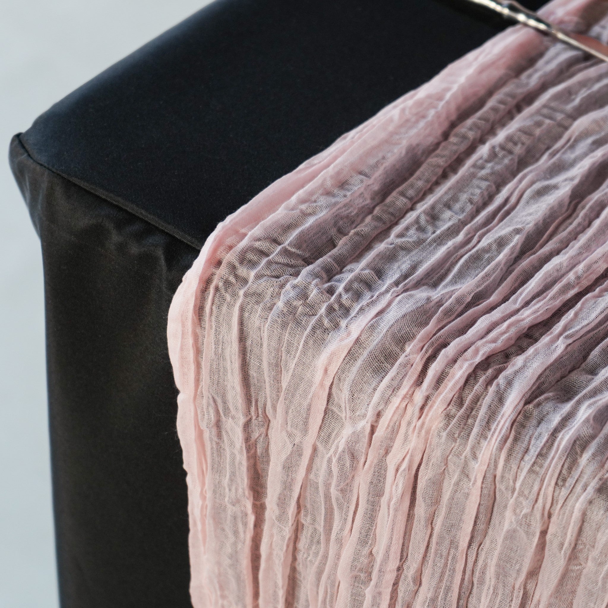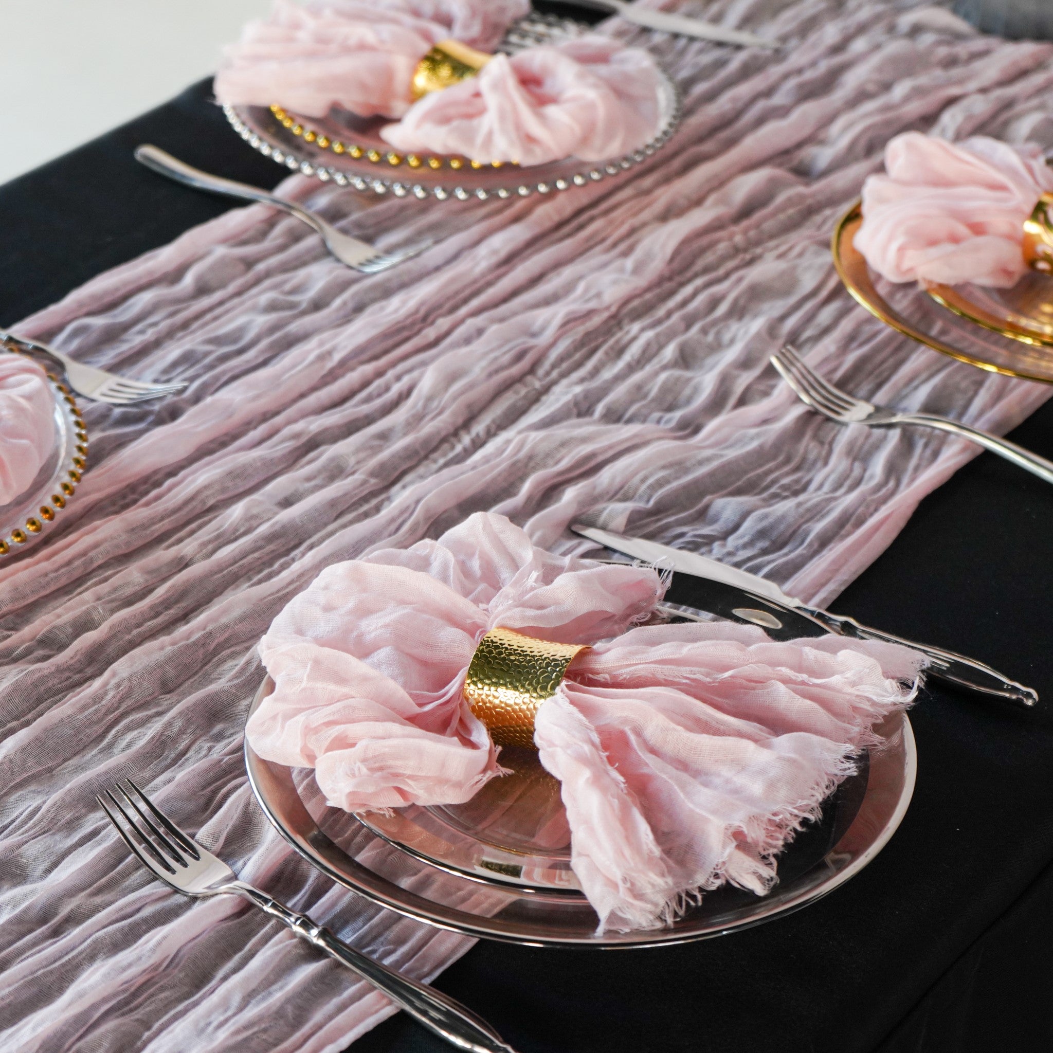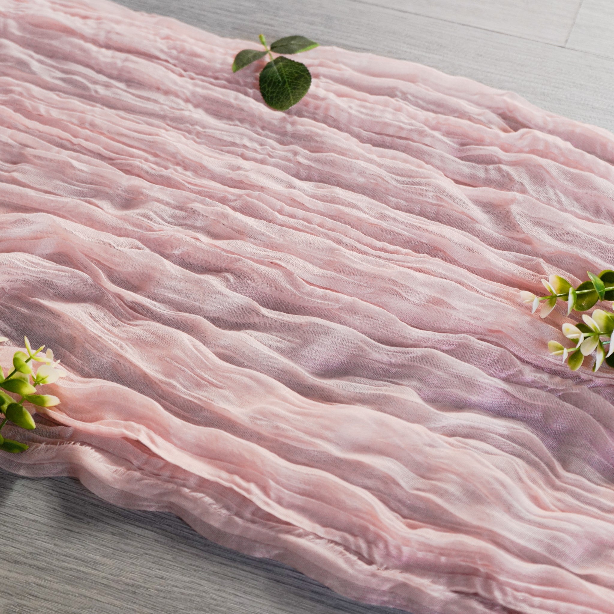 Create a beautiful tablescape with a lovely and minimalist Premium Cheesecloth Table Runner 16FT x 25" - Blush/Rose Gold. This premium cheesecloth runner is so beautiful to use along with soft candlelight, lush greenery for minimalist weddings, or wood pieces for a cozy farmhouse aesthetic.