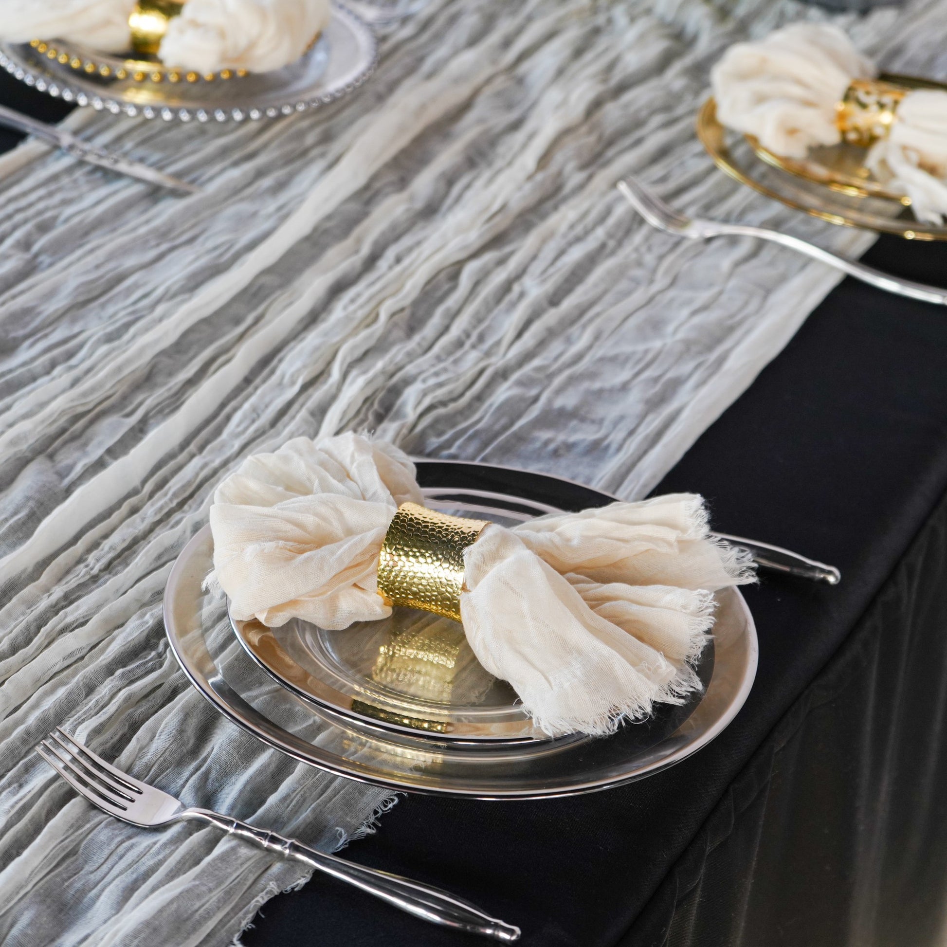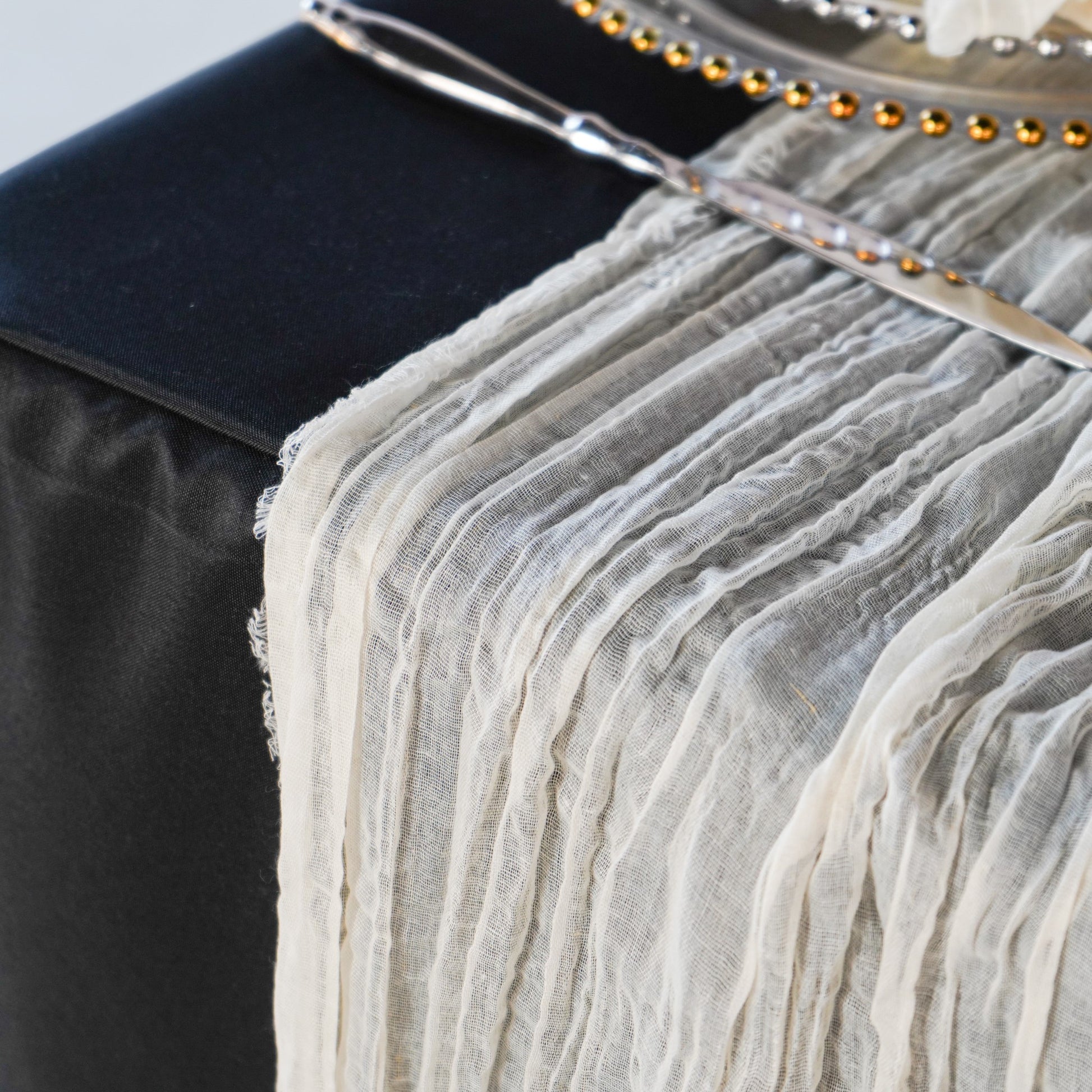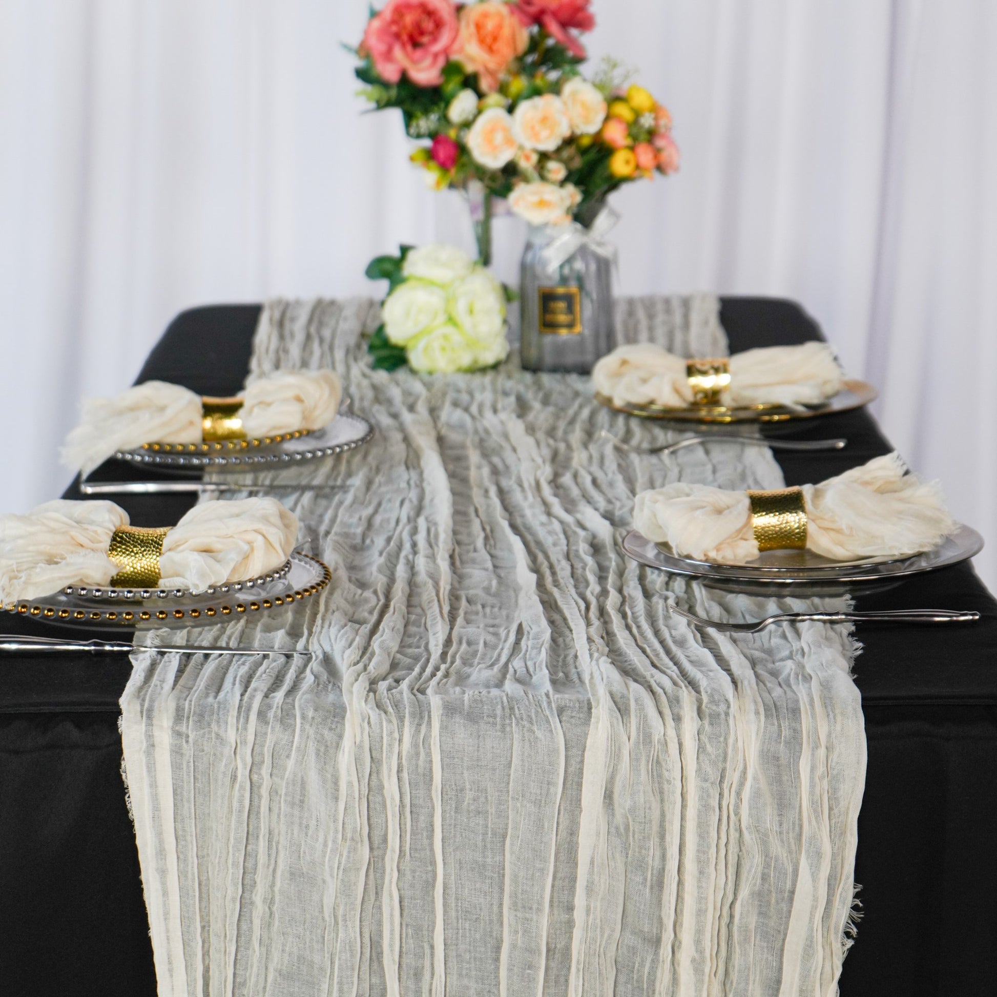 Looking for cheesecloth table runner decor ideas? More than just for tablescape decor, this cheesecloth table runner is long enough to be used for wedding arch decor, to drape across a fireplace mantle, or accentuate especially tables with this light and airy table linen. Use this wholesale cheesecloth table runner for any event and fall in love with its easy chic charm!