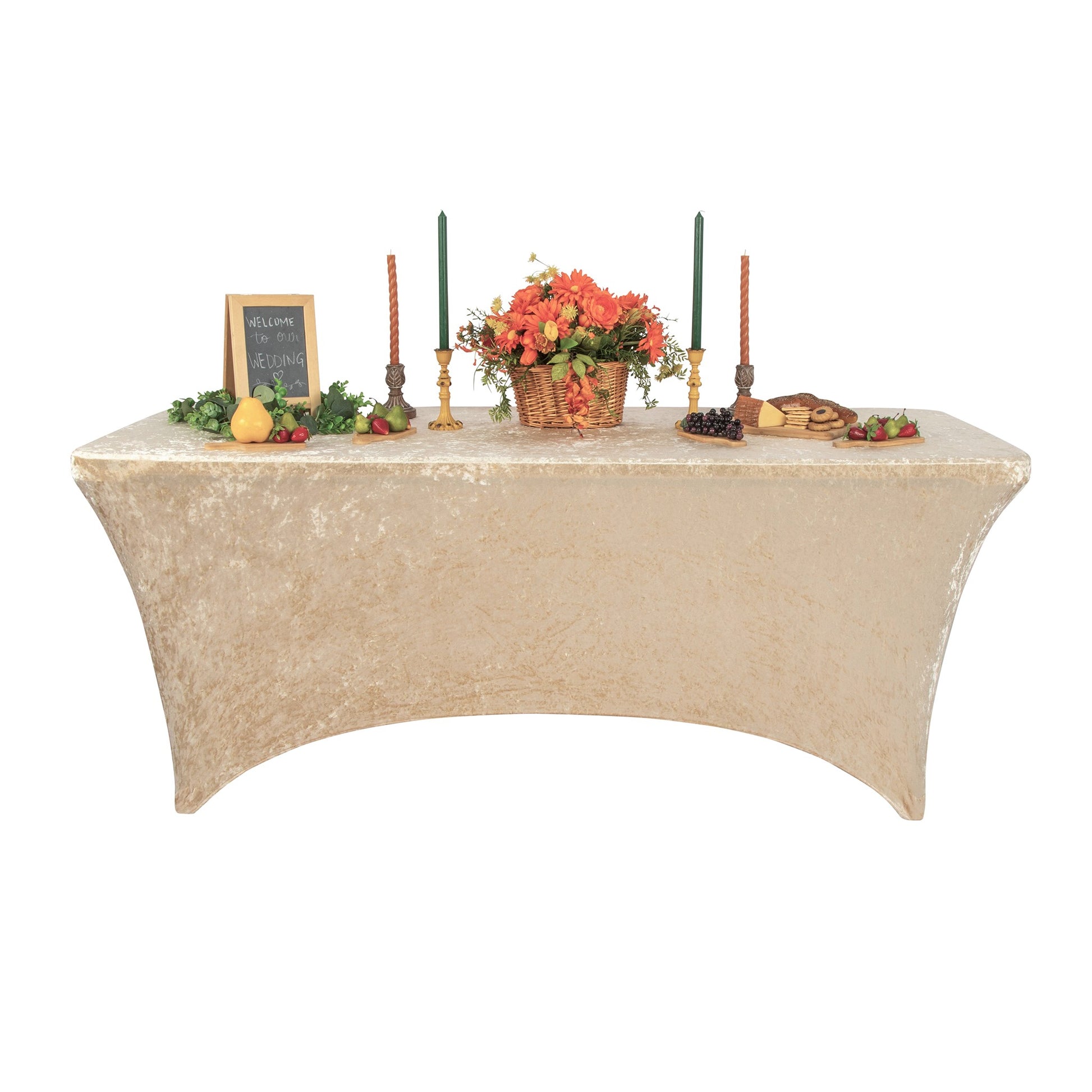 If you're looking for a trendy way to decorate buffet tables, our luxe Velvet Spandex Table Cover 6ft Rectangle - Champagne is just the thing! Our velvet spandex table covers are made of the softest velvet and spandex to provide a luxurious feel and easy-to-use table covers for catering food tables, dessert tables, buffet tables, gift tables, and more!