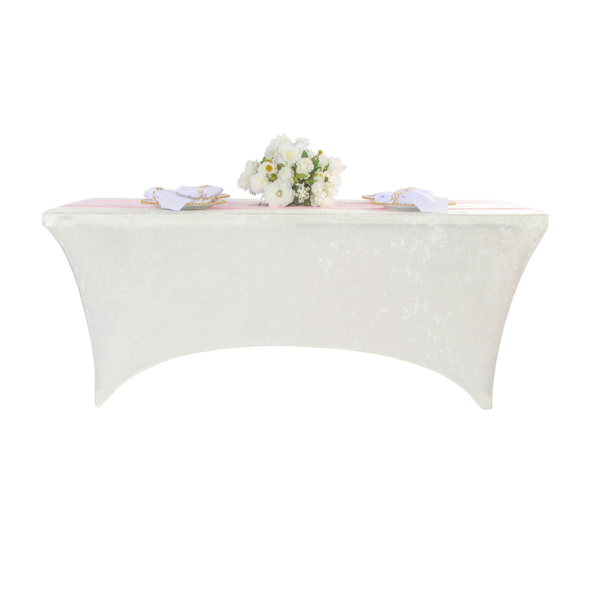 Our velvet spandex table linens are easy to slip on and decorate with, making them the perfect choice for busy party planners. Fitted velvet rectangular tablecloths cover the top and sides of your table and feature four reinforced pockets for the leg feet to hold it securely in place during any special event.