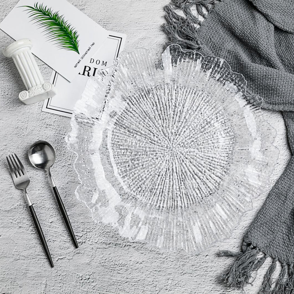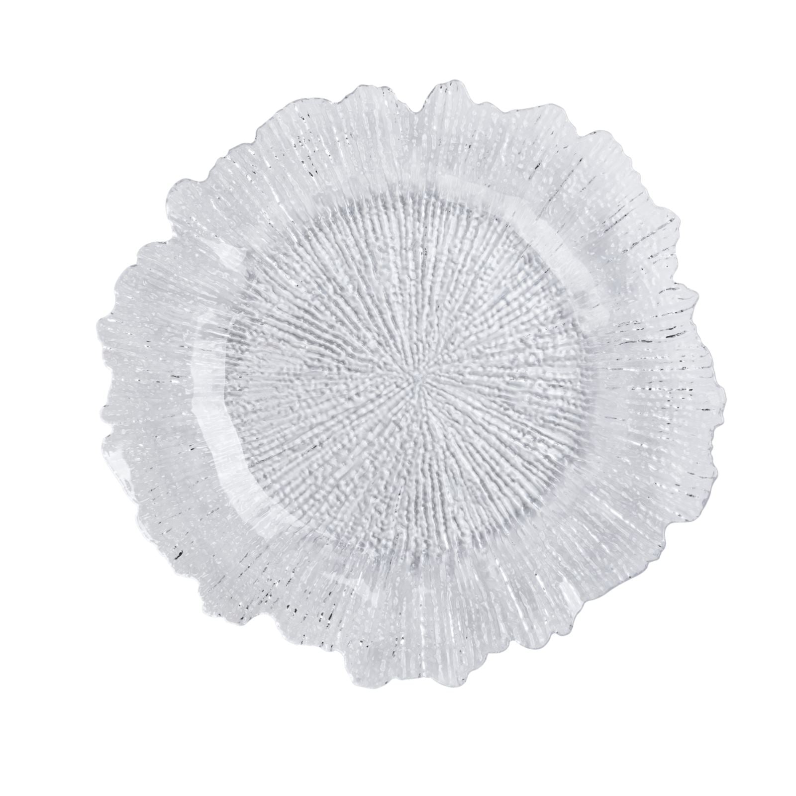 Charger plates are used as a base for dinner plates to help prevent spills on tablecloths. Add a touch of elegance to your wedding tablescape with Clear Reef Charger Plates.