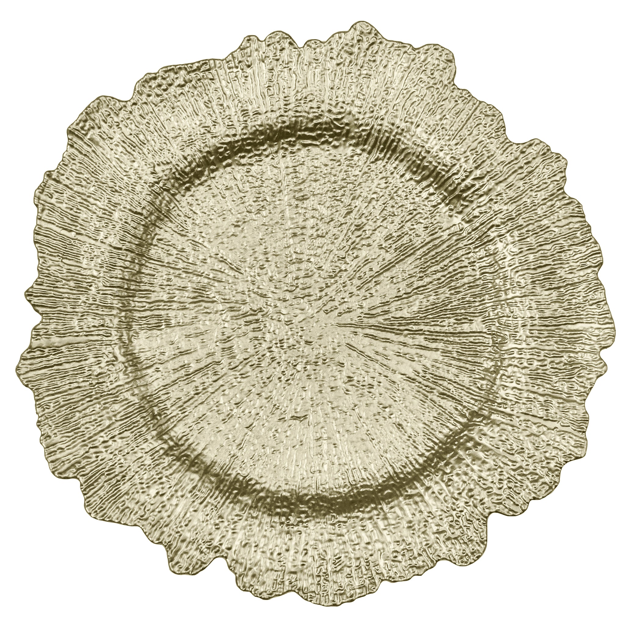 Explore our champagne and Clear Reef Charger Plates bulk options for your parties. Our champagne charger plates, plastic or glass, are perfect for different settings. Use them for golden wedding anniversaries, catered events, birthday parties, and other special events.