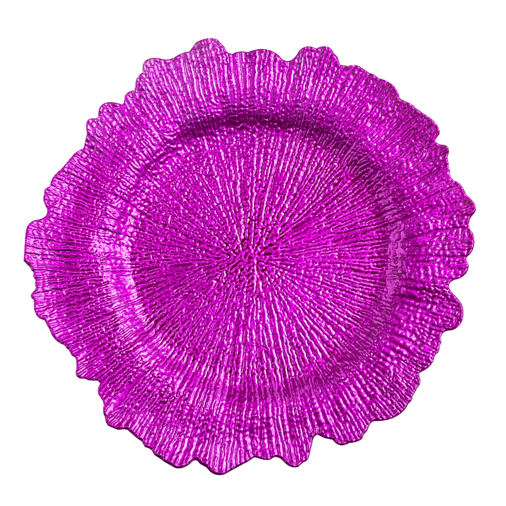 Explore our fuchsia and Gold Reef Charger Plates bulk options for your parties. Our gold reef charger plates, plastic or glass, are perfect for different settings. Use them for golden wedding anniversaries, catered events, birthday parties, and other special events.