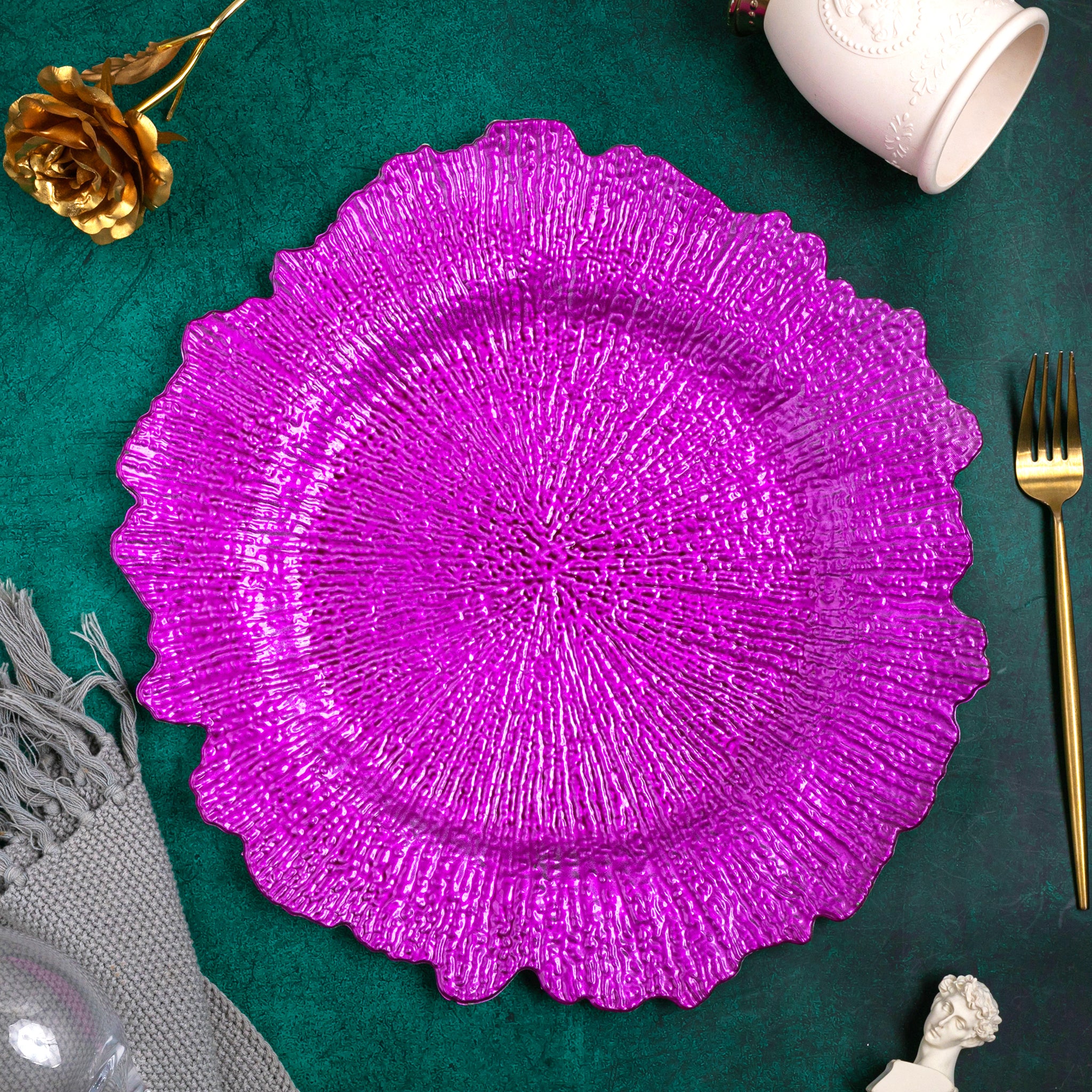 Enjoy a night of luxurious dining by elevating your tablecloth with Fuchsia Reef Charger Plates. Order your fuchsia and gold reef charger plates in bulk and get major savings with our wholesale prices.
