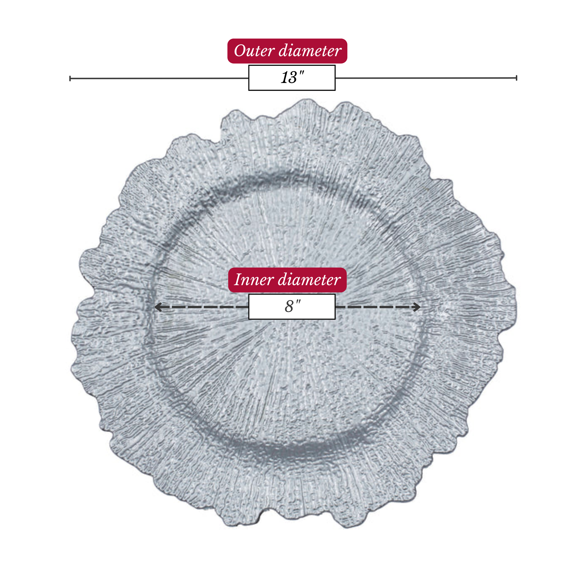 Charger plates are used as a base for dinner plates to help prevent spills on tablecloths. Add a touch of elegance to your wedding tablescape with Silver Reef Charger Plates.