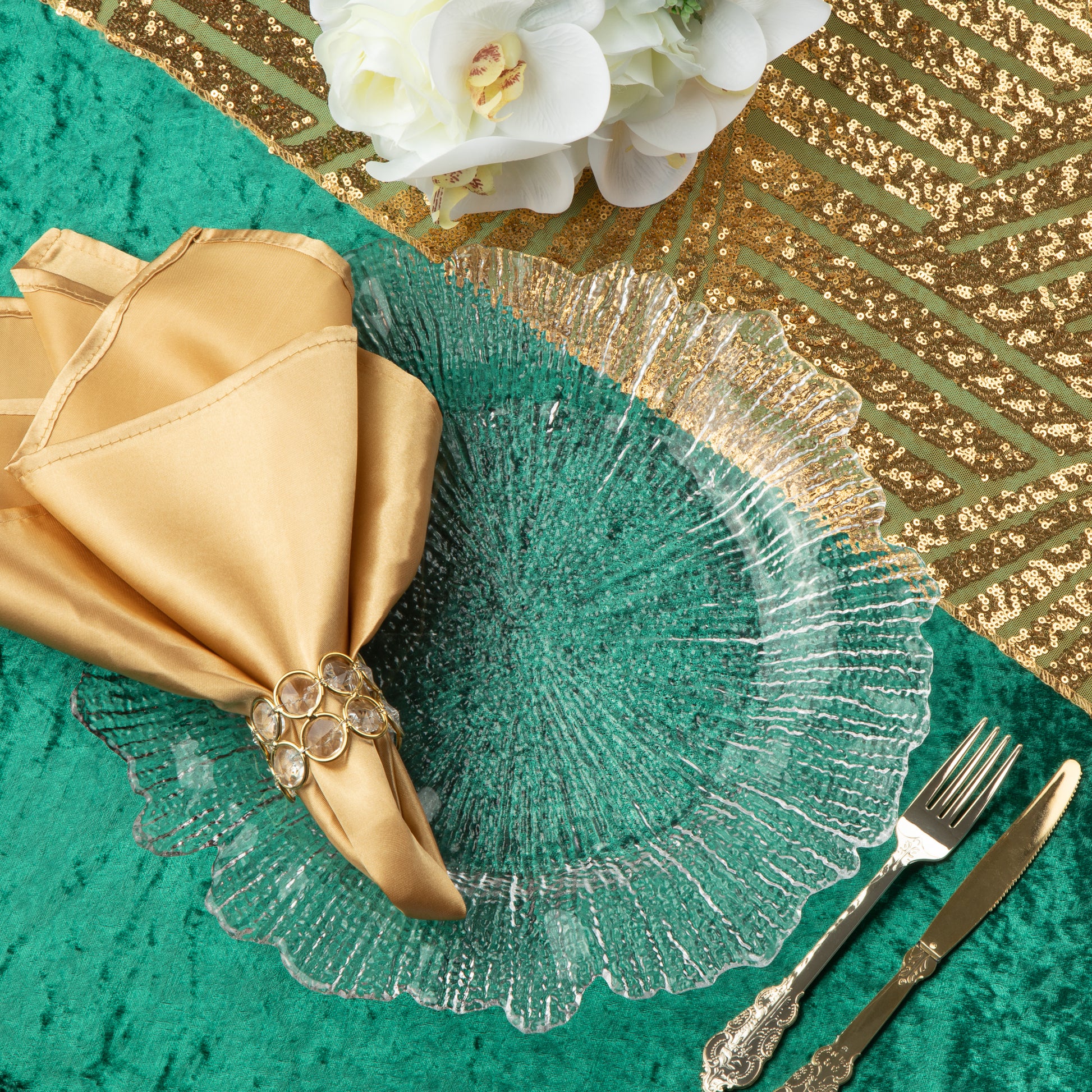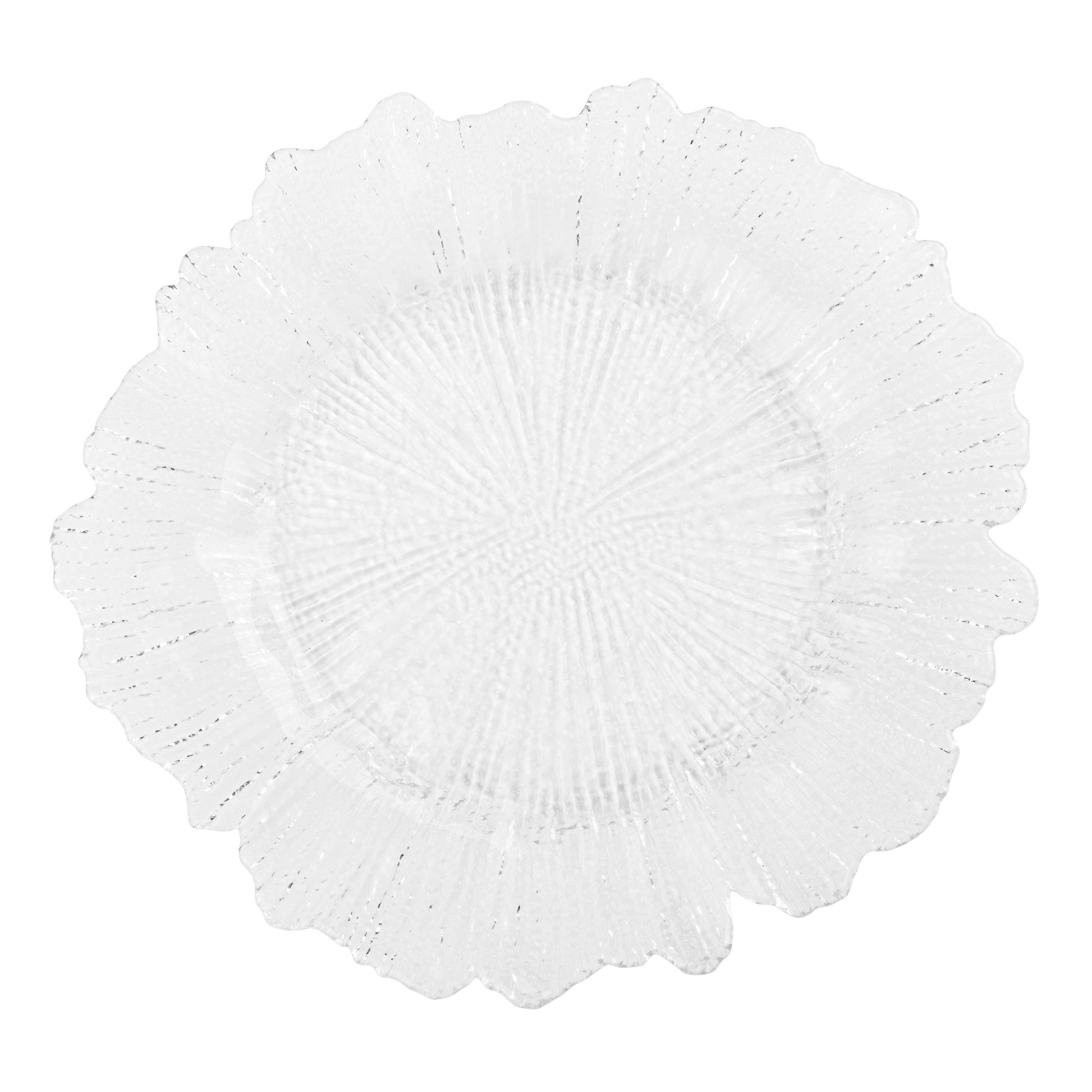 Add personality and texture to your table with our beautifully designed Reef Glass Charger plate! These eye catching, metallic hued sunburst glass plates will be the perfect addition to your wedding, brunch, or shower. Not only do they look fabulous, but they're also functional and can save your tablecloth from possible staining. Charger plates are purely for furnishing, so be sure to have dishware to place on top. Don't be afraid to make a bold statement on your tables! Price shown is per single charger plate. Sold by single piece or by case of 12 pieces only.