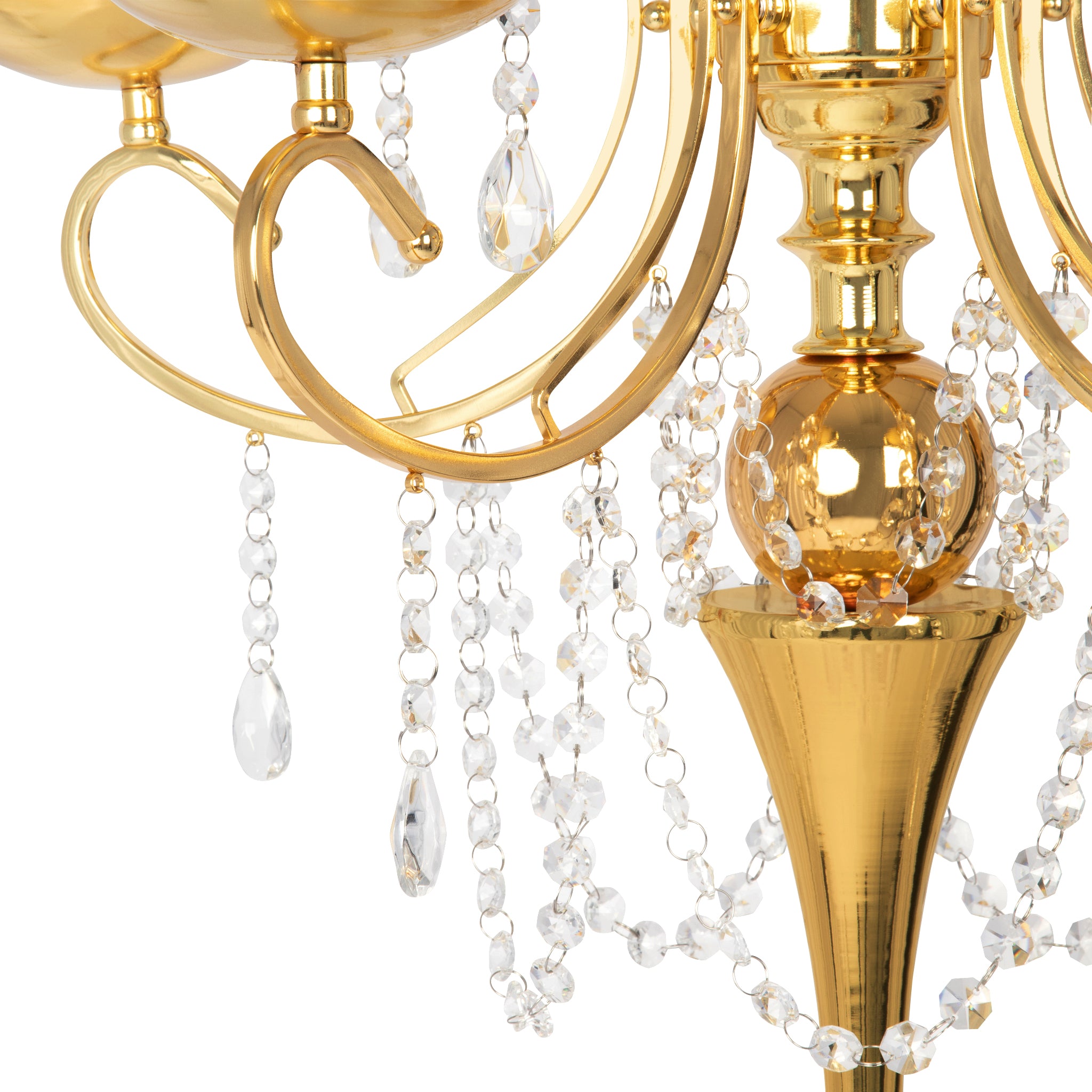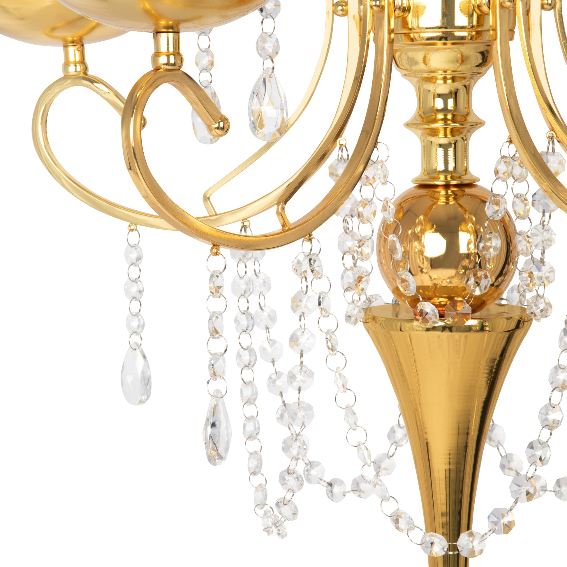 Our elegant Royal Hanging Crystal Candelabra Centerpiece - Gold gains old Hollywood glam with its cascade of glittering crystals. This six candle tabletop candelabra boasts a stunning color and dazzling design, creating a work of art for your tabletop. Acrylic drops and curved arms further add a sophisticated feeling. Highlighting five arms and standing 27” tall with a 7” D base, this dazzling centerpiece gives a visually appealing look. The design fits most standard sized candles, suitable for a battery-operated candle, votive candle, or tea light candle. The elegant arms are also perfect for cup decorative balls or other small decorative elements. The center can hold an additional candle or can be used to display lovely greenery or floral bouquets.