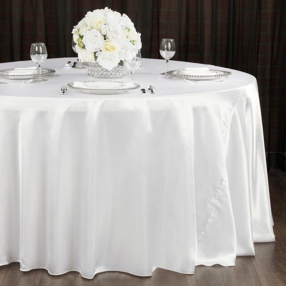 Complete the look of your special day with our Satin Tablecloths! Our Satin Tablecloths are the epitome of class and elegance for any sophisticated event. Satin has a gorgeous sheen surface that beautifully reflects light to show off the unique folds and draping, creating a truly unique romantic atmosphere. Best of all, satin is a versatile fabric that can be paired with any other solid or textured fabric and still maintain a cohesive look at your wedding or event!