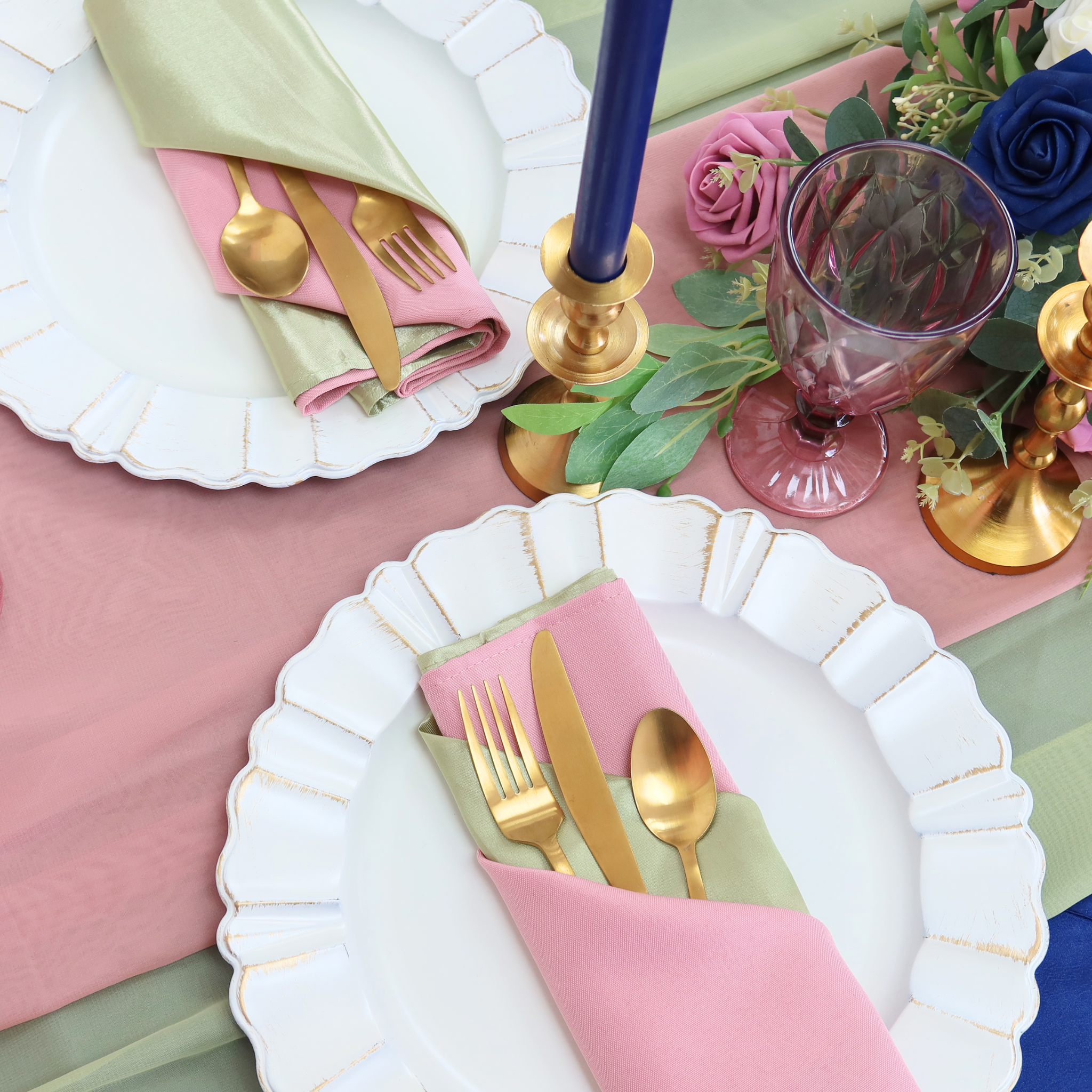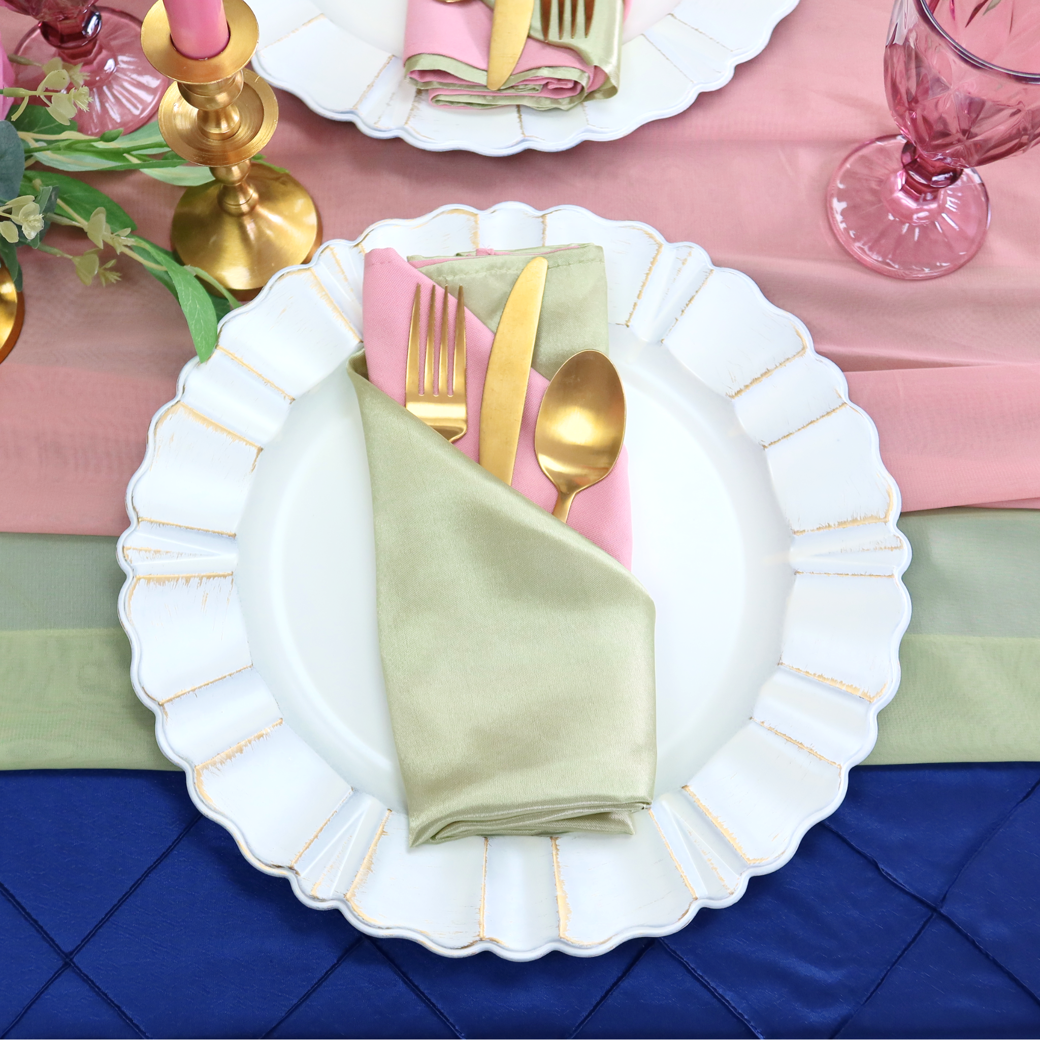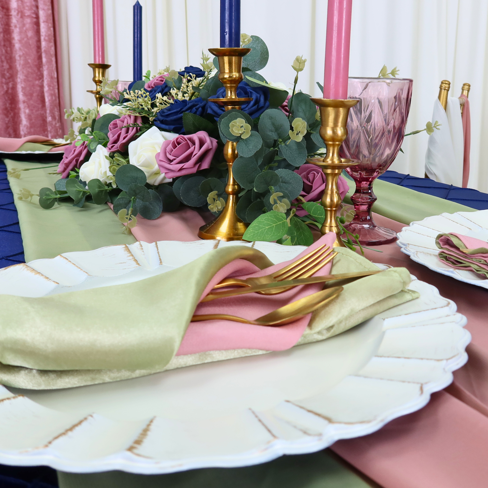 Add a touch of sophistication to your events with sage green satin napkins. Pair cloth table napkins with roses, gold centerpieces, charger plates, and napkin rings to complete your table decor. Perfect to set the stage for a truly memorable occasion and impress your guests. For more savings, browse our collection of artificial flowers.