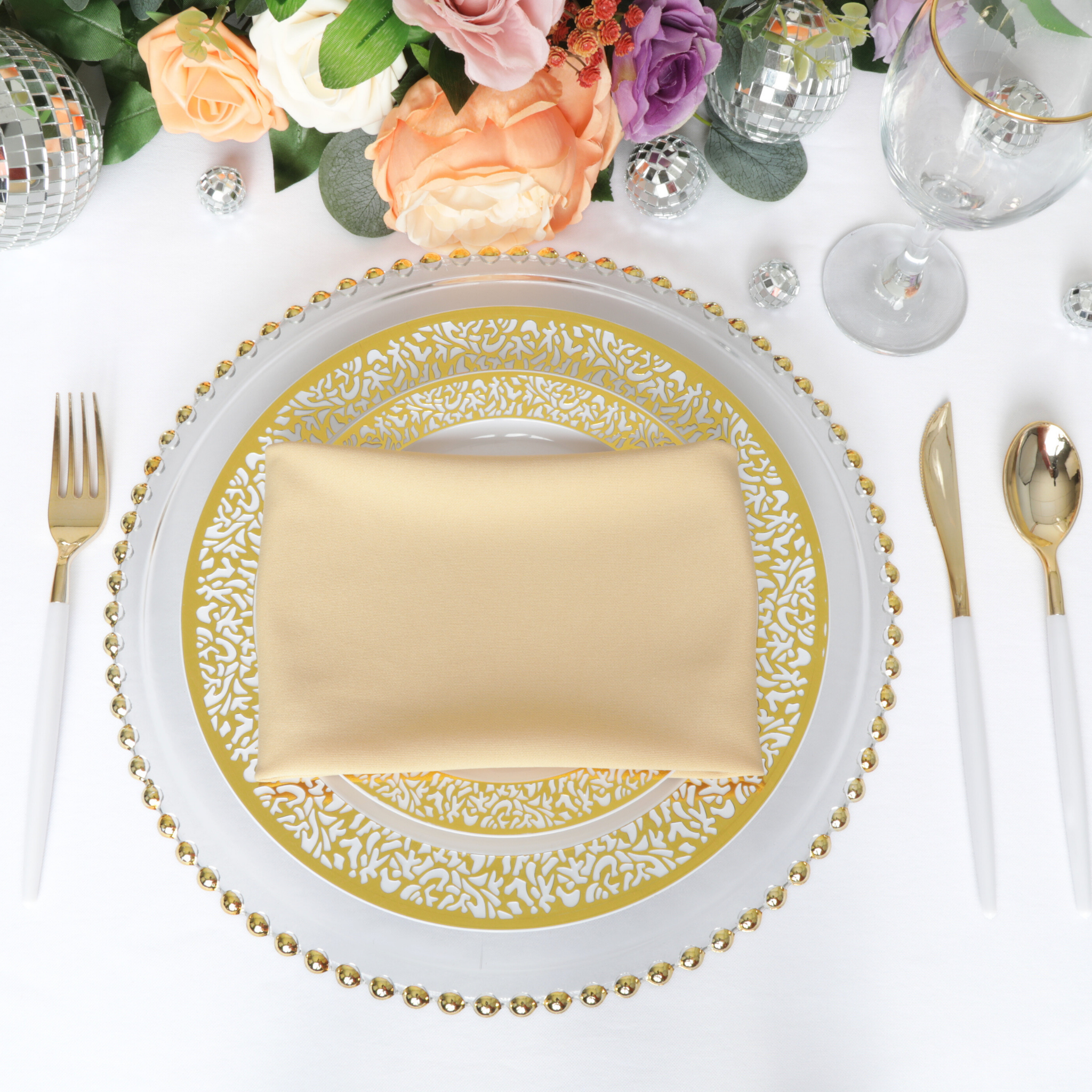 Lastly, embrace the beauty of simplicity by using our Champagne scuba napkins alongside Champagne tablecloths and white or silver accents. This monochromatic palette creates an elegant and minimalist look, perfect for those who appreciate a sophisticated and modern aesthetic.